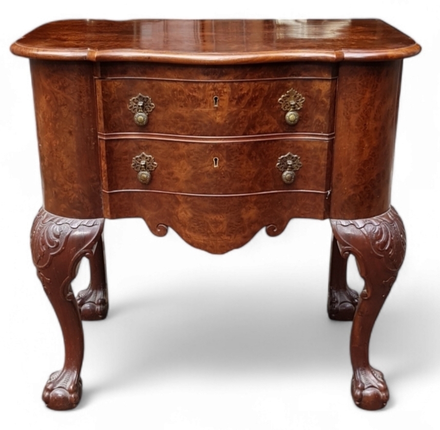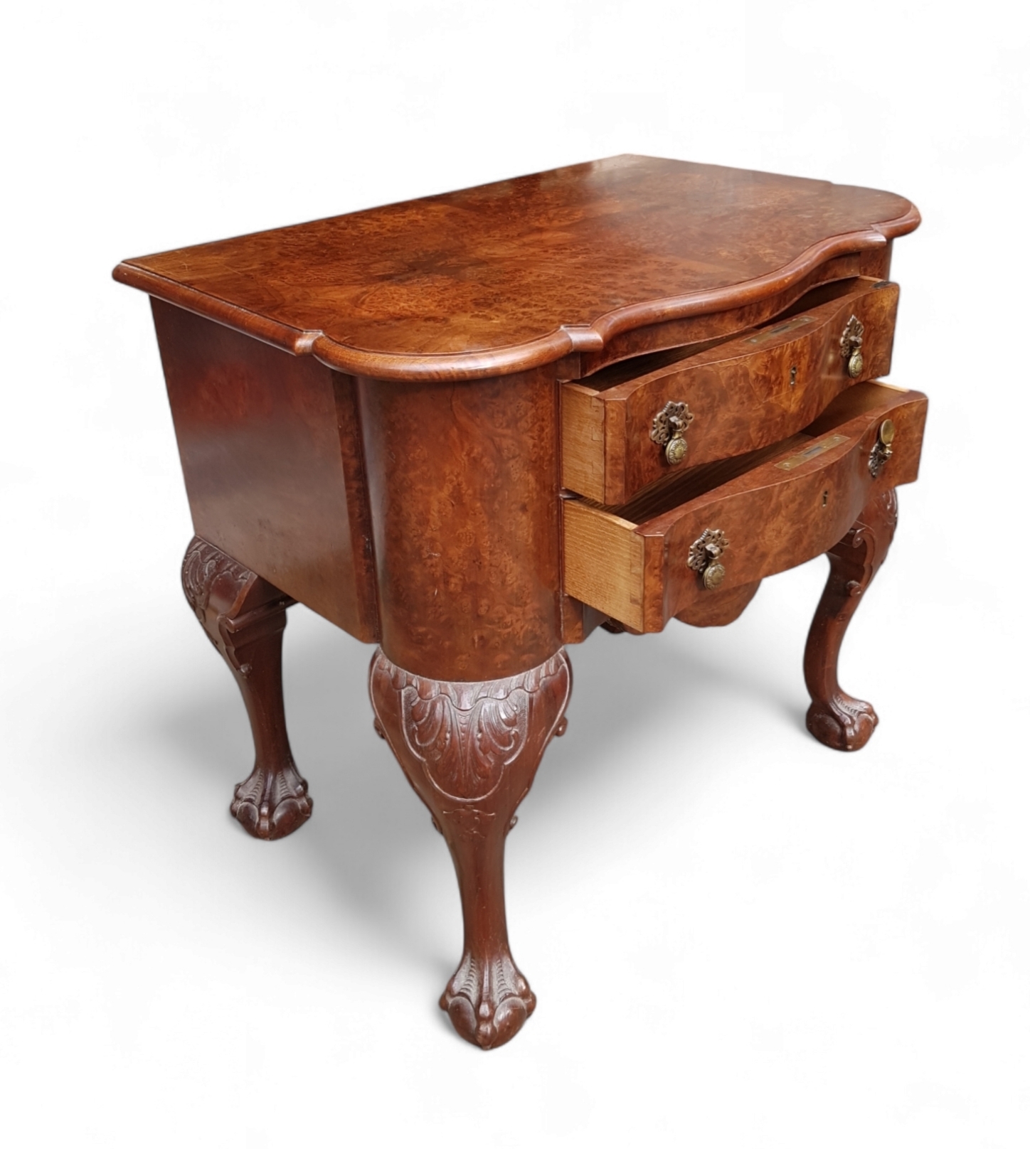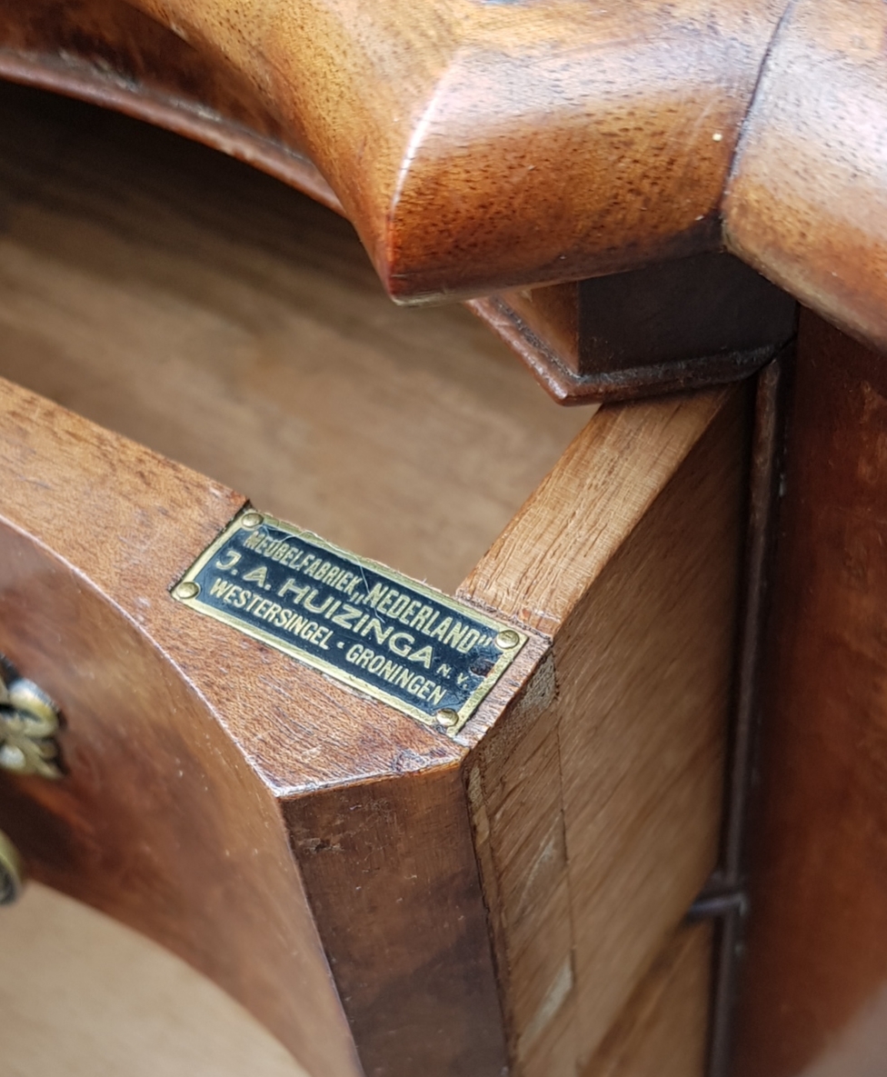 Kleine ladekast van hout met wortelnotenfineer, gemaakt door de Meubelfabriek J.A. Huizinga te Groningen. De kast uit de eerste helft 20e eeuw is uitgevoerd in een neorococo stijl met een golvend front en twee laden. Het meubel staat op vier gesneden cabriolepoten met klauw-en-balvoeten. Het messing-beslag is decoratief van aard en kenmerkend voor deze stijl. Eerst deze kast zien voordat je biedt? Bezoek onze kijkdagen op 28, 29 en 30 november van 11:00 tot 17:00 uur! |