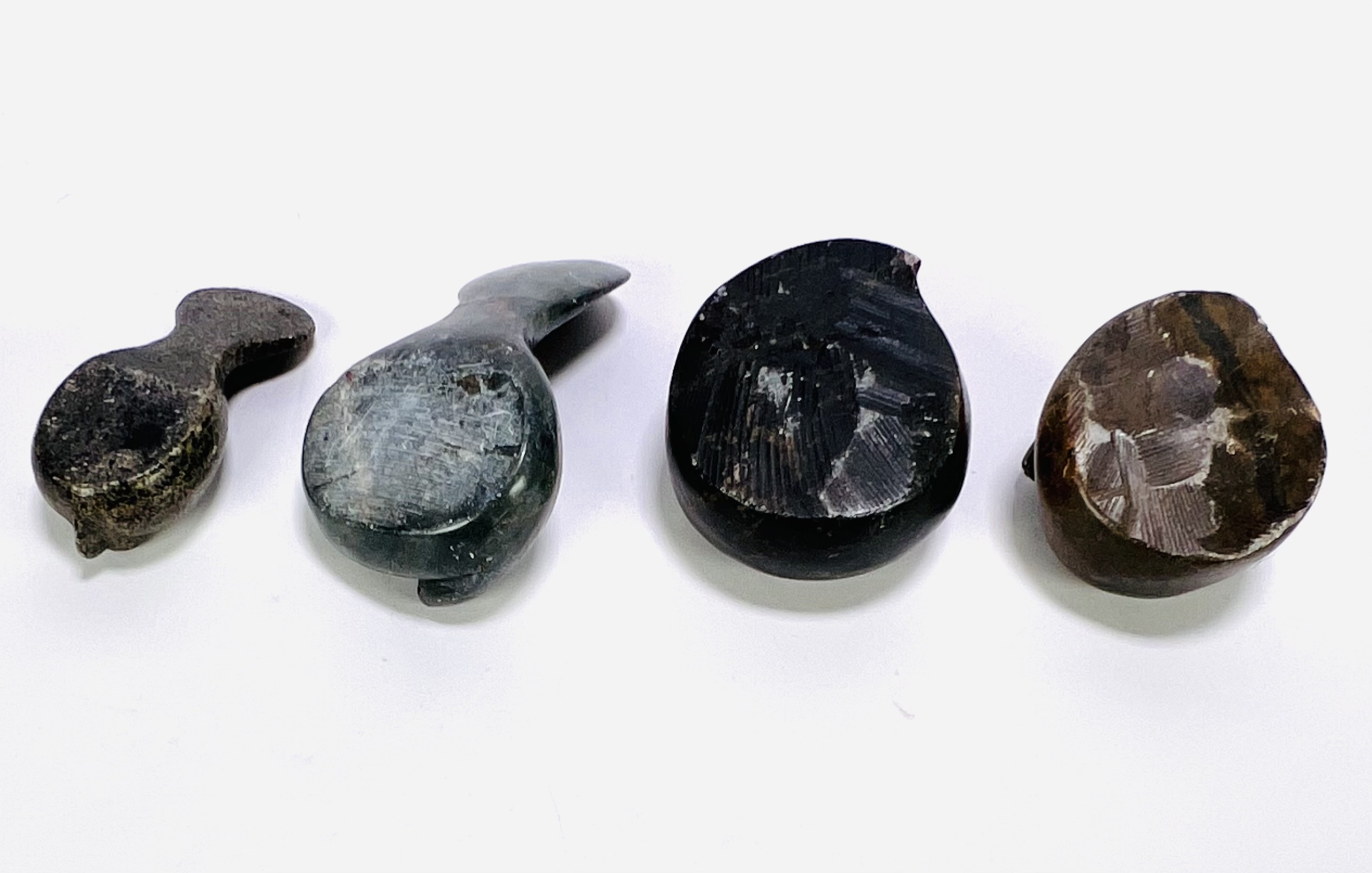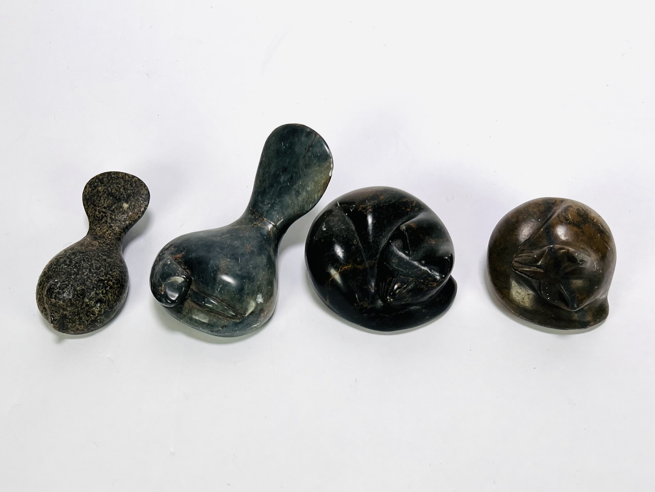 Vier dierenfiguren gemaakt van gesneden en gevormde speksteen (steatiet), circa 1965–1990. De beeldjes zijn uitgevoerd in een minimalistische, gestileerde vorm en tonen vogels en slapende katten. De beeldjes variëren in kleur van donker gepolijst zwart tot ruw bruingroen. Geïnteresseerd? Bezoek onze kijkdagen op 28, 29 of 30 november van 11:00 tot 17:00 uur! |
