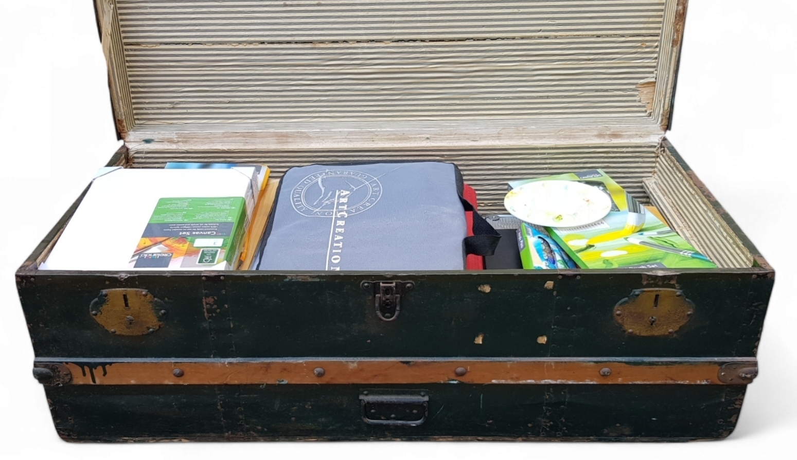 Antieke reiskist van de Firma W. Poppink uit Den Haag, vervaardigd in Nederland uit hout en gecoat canvas, circa 1900–1920. De kist is uitgevoerd in functionele Victoriaanse Stijl met een gewelfde bovenkant en is versterkt met houten latten en ijzeren beslag. De hutkoffer heeft een diepgroene afwerking, zware patina door gebruik en bevat diverse moderne schilder benodigdheden. Wil je direct deelnemen? Plaats vanaf 21 november alvast een schriftelijk bod via onze website! |