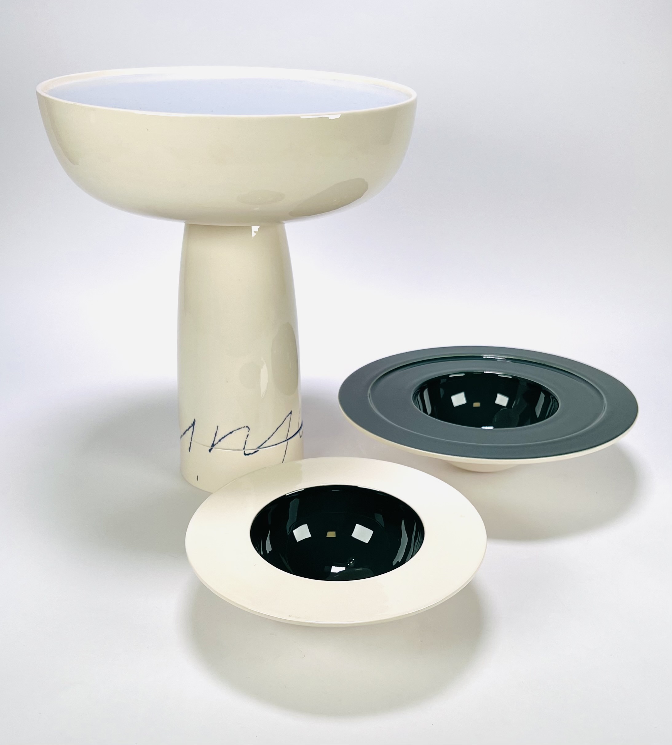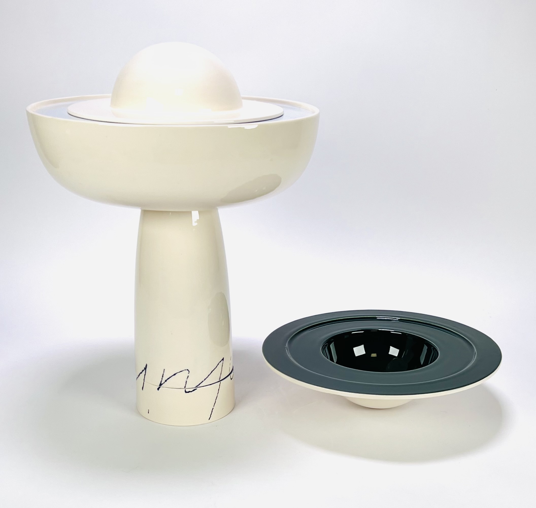 Designobject van aardewerk ontworpen door Djoke de Jong (1963) voor Sphinx in Maastricht, eerste kwart 21e eeuw, oplagenummer 061/250. Het object bestaat uit stapelbare schotel- en komvormen op cilindrische voet, samen te voegen tot een kunstobject, uitgevoerd in slipcasting met glazuurdecoratie in contrasterende kleuren en kalligrafische lijnen, kenmerkend voor hedendaags Nederlands design. Kom langs tijdens de kijkdagen (28 t/m 30 november) en ontdek dit keramisch designobject zelf! |
