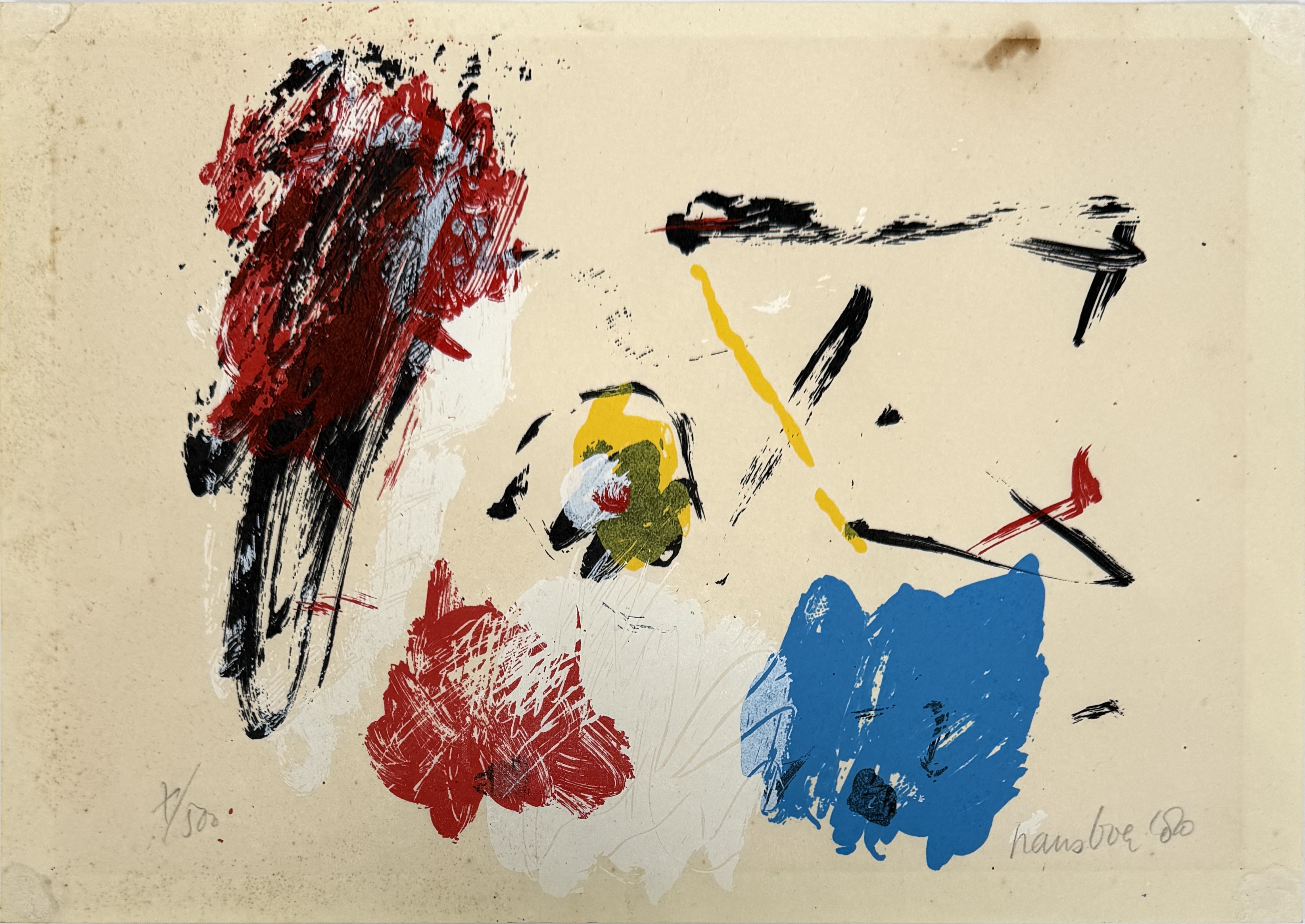 Zeefdruk door Hans Boer (1947), uitgevoerd in 1980, gesigneerd in potlood rechtsonder en linksonder genummerd X/500. Abstracte compositie met expressieve kleurvlakken in rood, blauw, geel, zwart en wit op een beige ondergrond. Eerst de zeefdruk zien voordat je biedt? Bezoek onze kijkdagen op 28, 29 en 30 november van 11:00 tot 17:00 uur! |