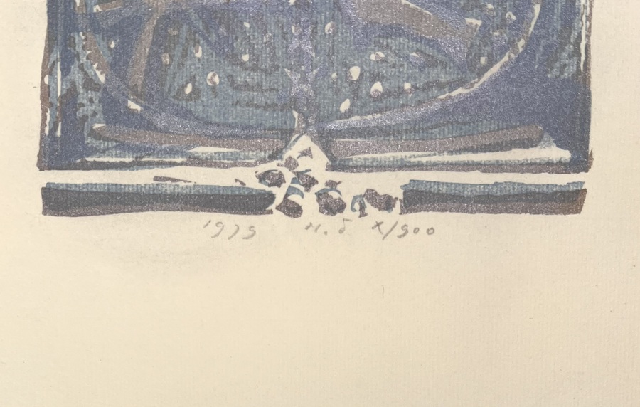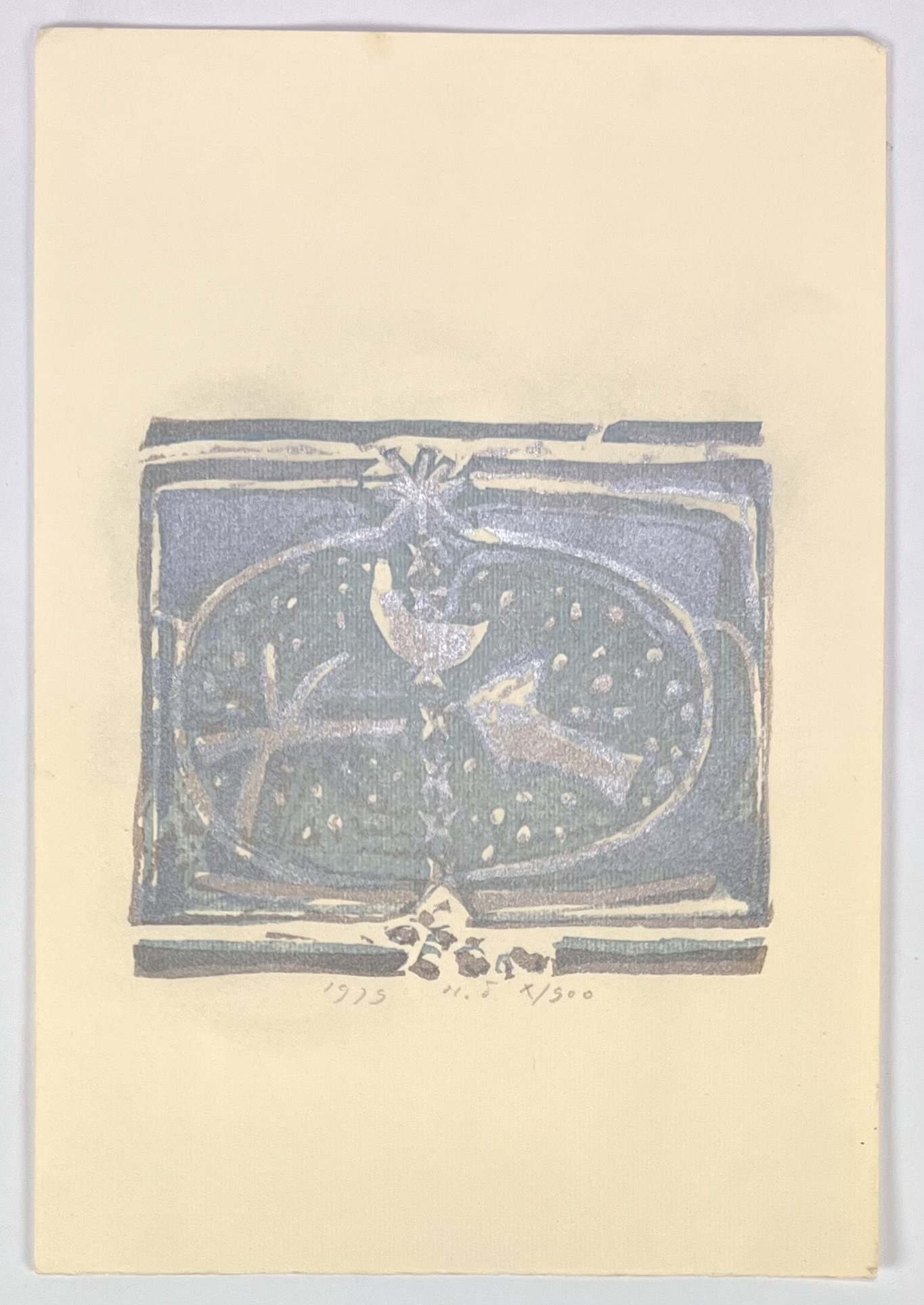 Litho op papier door Martin Tissing (1936–2018), gedateerd 1979 en genummerd “X/900”. De voorstelling toont een symmetrische ovale compositie met vogel- en stervormen, uitgevoerd in zilver- en blauwtinten. Deze glanzende grafiek weerspiegelt Tissings symbolistisch-expressionistische stijl uit de late jaren zeventig, waarin balans, licht en stilte een centrale rol spelen binnen zijn spirituele beeldtaal.