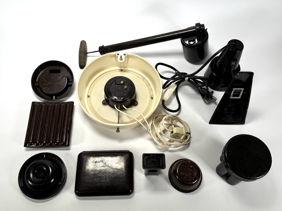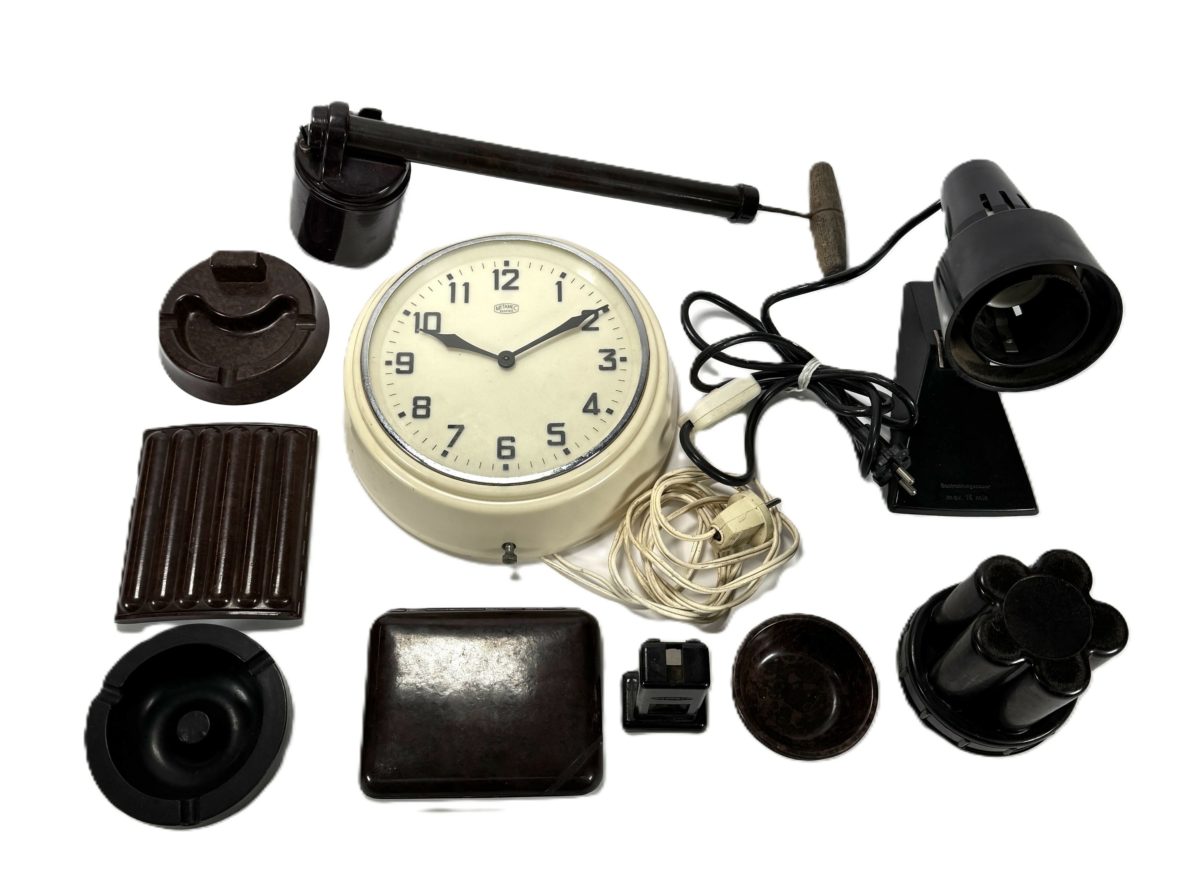 Een gevarieerde collectie van bakeliet objecten uit de Art Deco-periode, gedateerd ca. 1935–1950. Bestande uit diverse donkerbruine en crèmekleurige gebruiksartikelen, waaronder een elektrische wandklok, een tafellamp, asbakken, en bakjes. Geïnteresseerd? Bezoek onze kijkdagen op 28, 29 of 30 november van 11:00 tot 17:00 uur! |