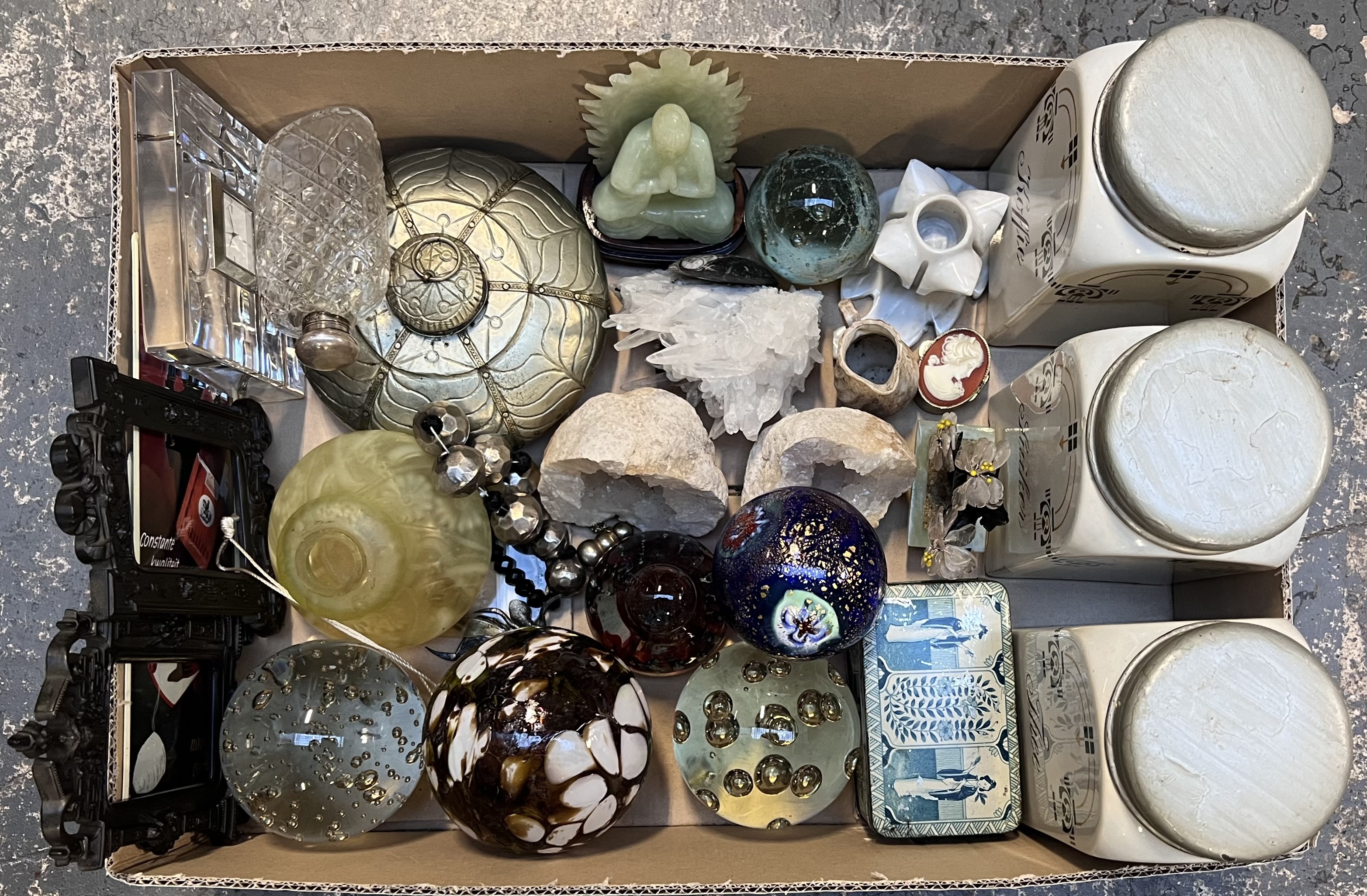 Verzameling curiosa bestaande uit diverse glasobjecten zoals presse-papiers met luchtbellen, een jade-imitatie Boeddha, kwartskristallen en geodes, keramische Art Deco voorraadpotten, een gehamerde metalen doos en een blik met blauw neoklassiek decor. Vervaardigd in Europa en Azië in de 20e eeuw. Wil je direct deelnemen? Plaats vanaf 21 november alvast een schriftelijk bod via onze website! |
