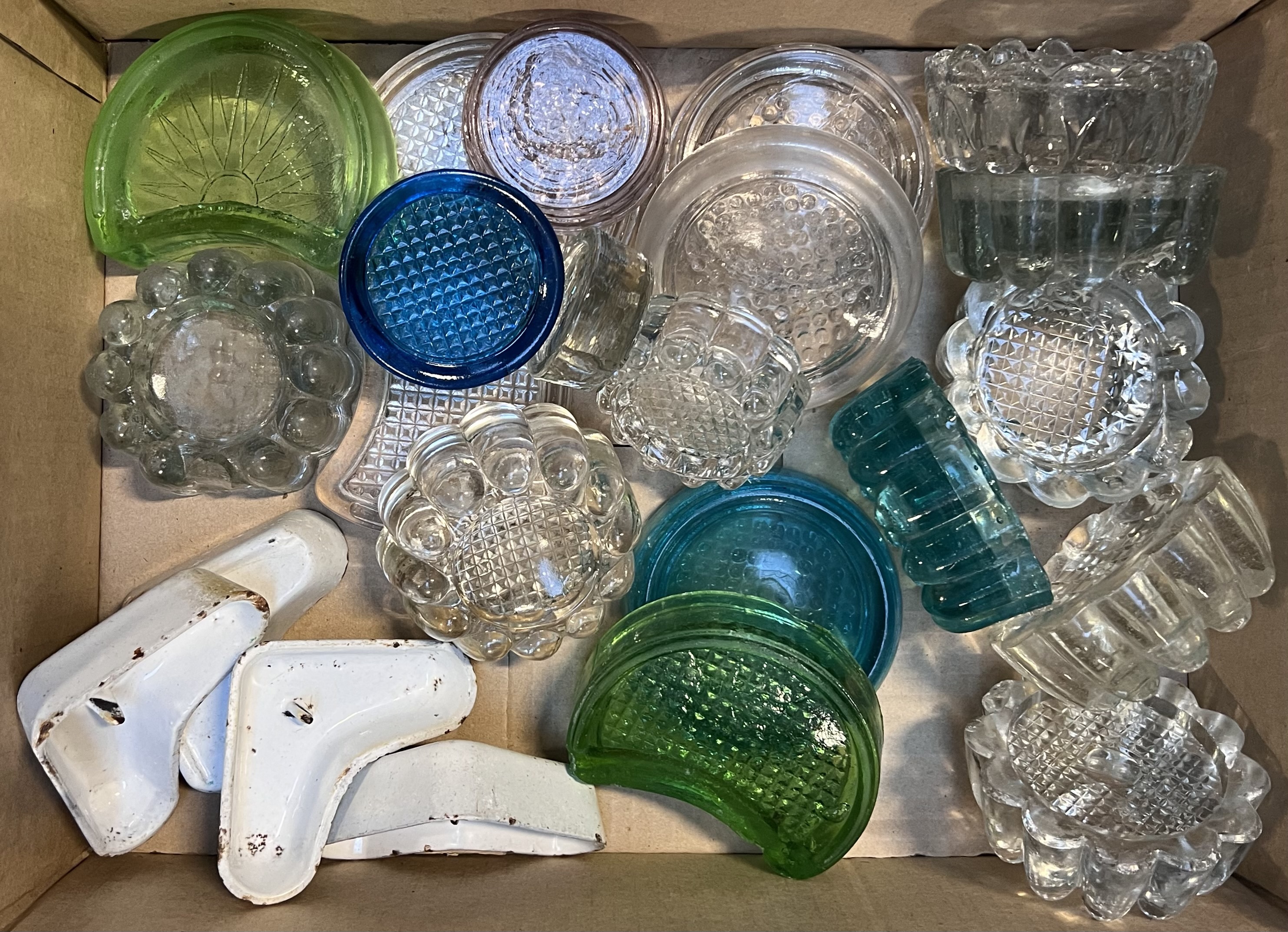 Doos met diverse verschillende heldere, gekleurde glazen en emaille meubelschotels uit de twintigste eeuw. De onderdelen tonen geometrische en florale patronen, deels met reliëfstructuren. Midden twintigste eeuw. Jouw collectie verdient dit glazen schalen. Schrijf je in! |