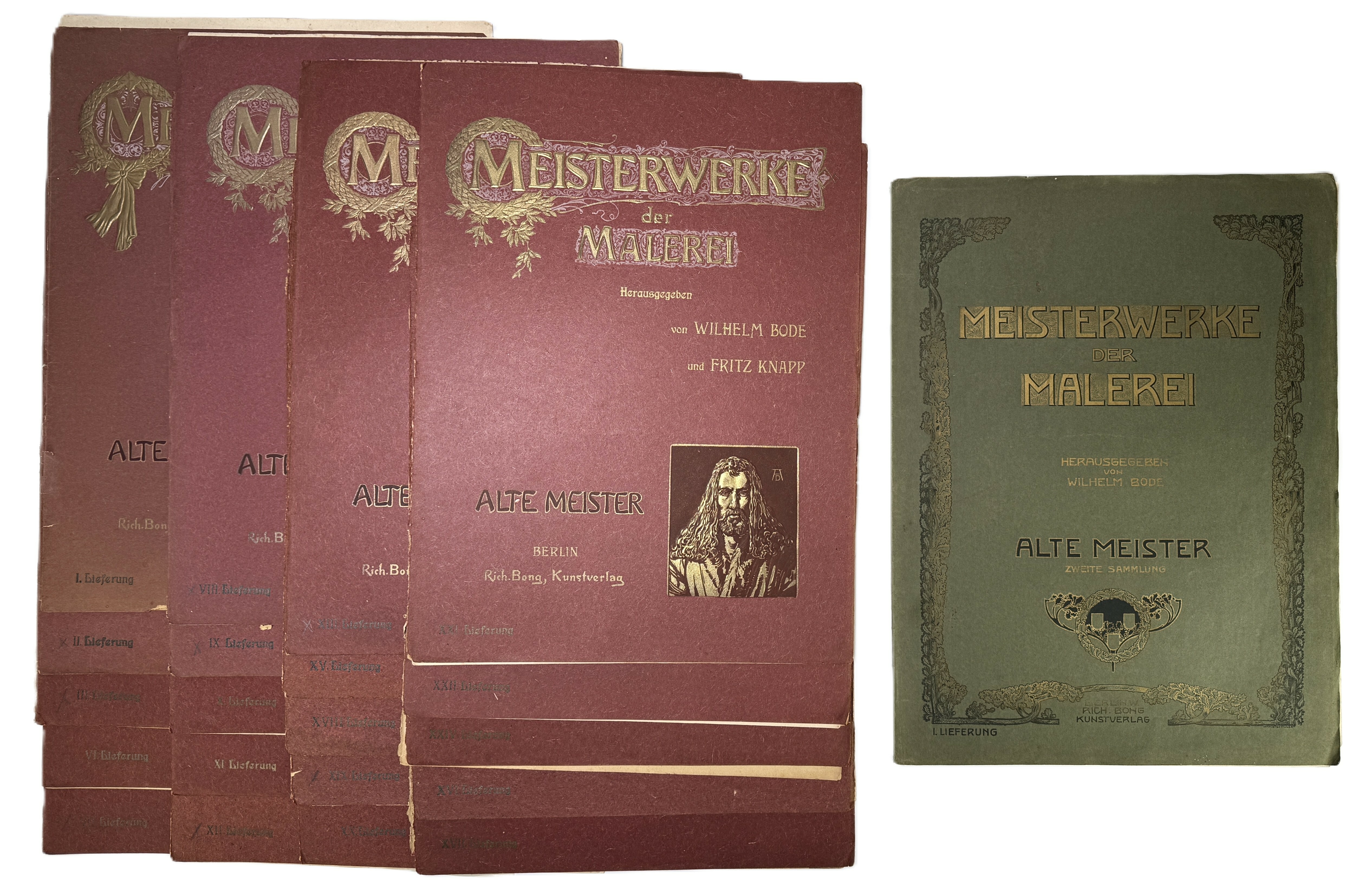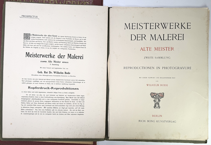 Losbladige mappen en een gebonden band van "Meisterwerke der Malerei – Alte Meister", een serie uitgegeven door Rich. Bong Kunstverlag in Berlijn. Het kunsthistorische werk uit circa 1900–1905 bevat fotogravure reproducties van schilderijen, waaronder werken van Frans Hals en George Romney. De Art Nouveau mappen tonen academische stijlkenmerken. Geïnteresseerd? Bezoek onze kijkdagen op 28, 29 of 30 november van 11:00 tot 17:00 uur! |