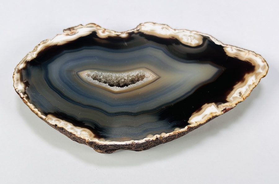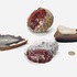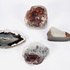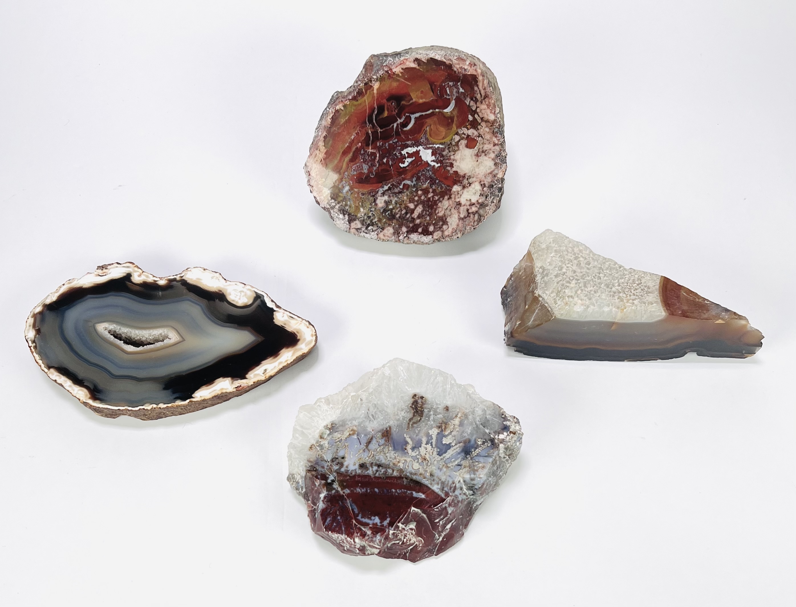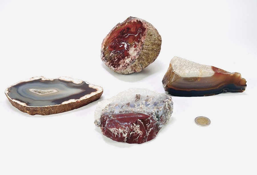Vier agaat- en kwartsmineralen, gevormd in vulkanische holtes tijdens de Mioceen–Plioceen periode, circa 2–20 miljoen jaar oud. De mineralen, afkomstig uit Brazilië, zijn in de 20e eeuw gezaagd, geslepen en deels gepolijst. Het betreft een platte ovale agaatschijf in zwart en grijs met centrale druzy en drie geodefragmenten in rood, bruin en transparant wit. Ontdek deze mineralen en voeg ze toe aan jouw collectie! Registreer nu voor de veiling. |
