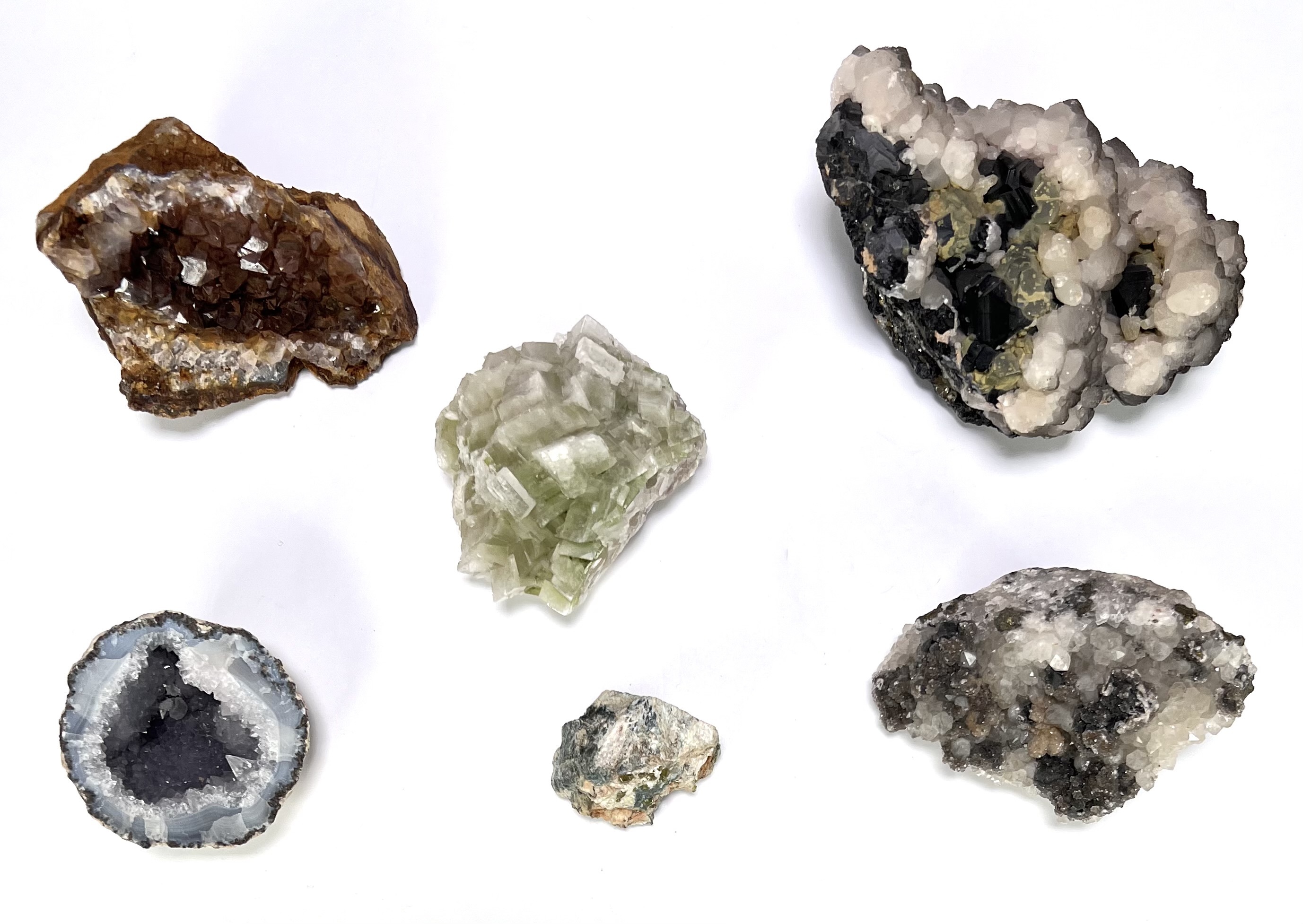 Zes mineralen waaronder een geode met amethist- en chalcedoonvorming, een bruine calciet geode, een heldergroene fluorietcluster en drie overige kristallijne stalen met kwartsgroei, uit geologische vorming van miljoenen jaren geleden. De mineralen tonen natuurlijke kristalvorming en variatie in kleur en structuur, afkomstig uit geologische afzettingen van vermoedelijk Europese of Zuid-Amerikaanse herkomst. Wil je deze mineralen in het echt bekijken? Kom naar de kijkdagen op 28, 29 en 30 november! |