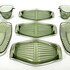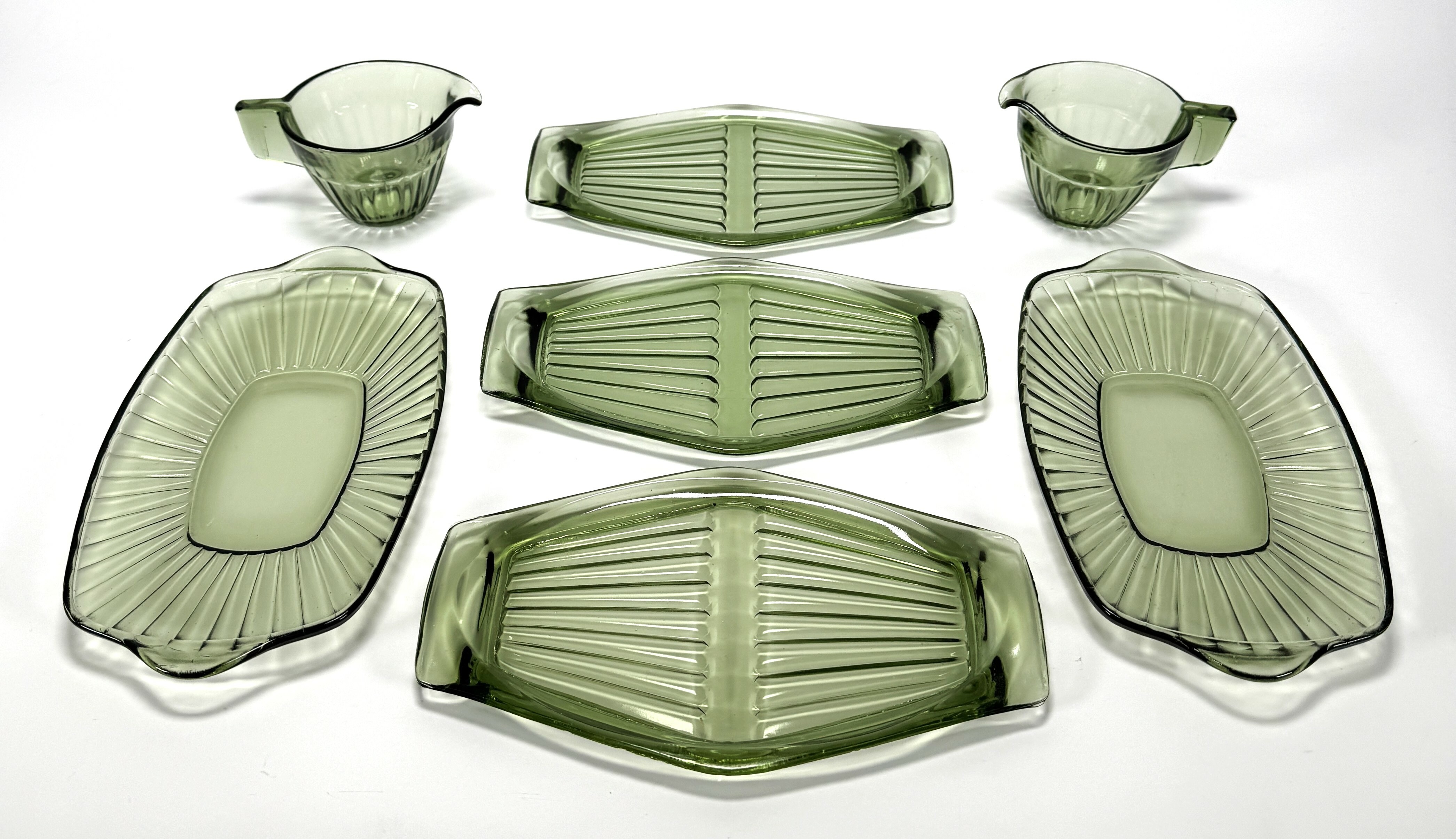 Fragment van een servies in lichtgroen persglas uit de serie “Neerlandia”, ontworpen door Andries Dirk Copier (1901–1991) voor Glasfabriek Leerdam, Nederland, jaren 1930. De geometrische vormen met waaierende ribbelstructuur zijn kenmerkend voor het modernistische Leerdam ontwerp uit de Art Deco periode. Bestaande uit drie langwerpige schalen, twee ovale schalen en twee schenkkannetjes in identieke uitvoering. Klaar om te bieden? Registreer je nu en doe mee aan de veiling! |