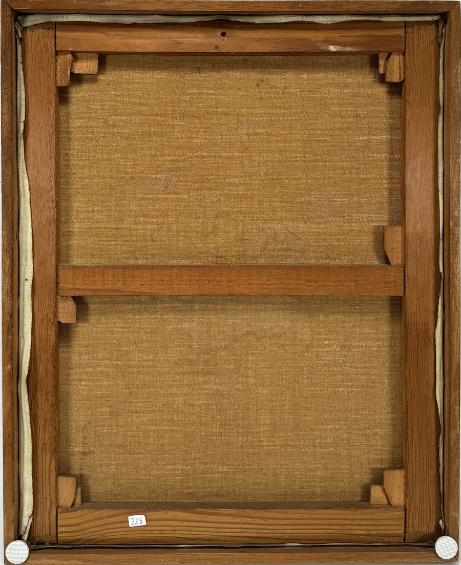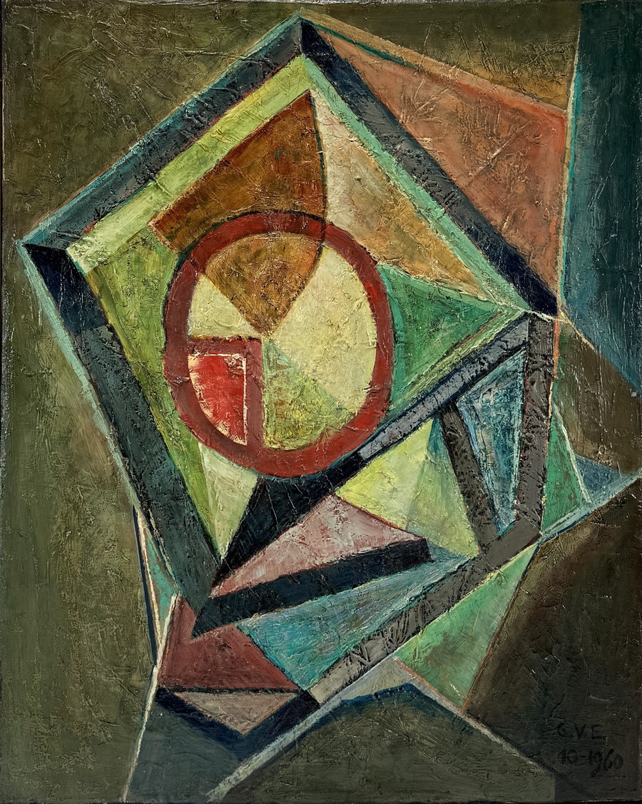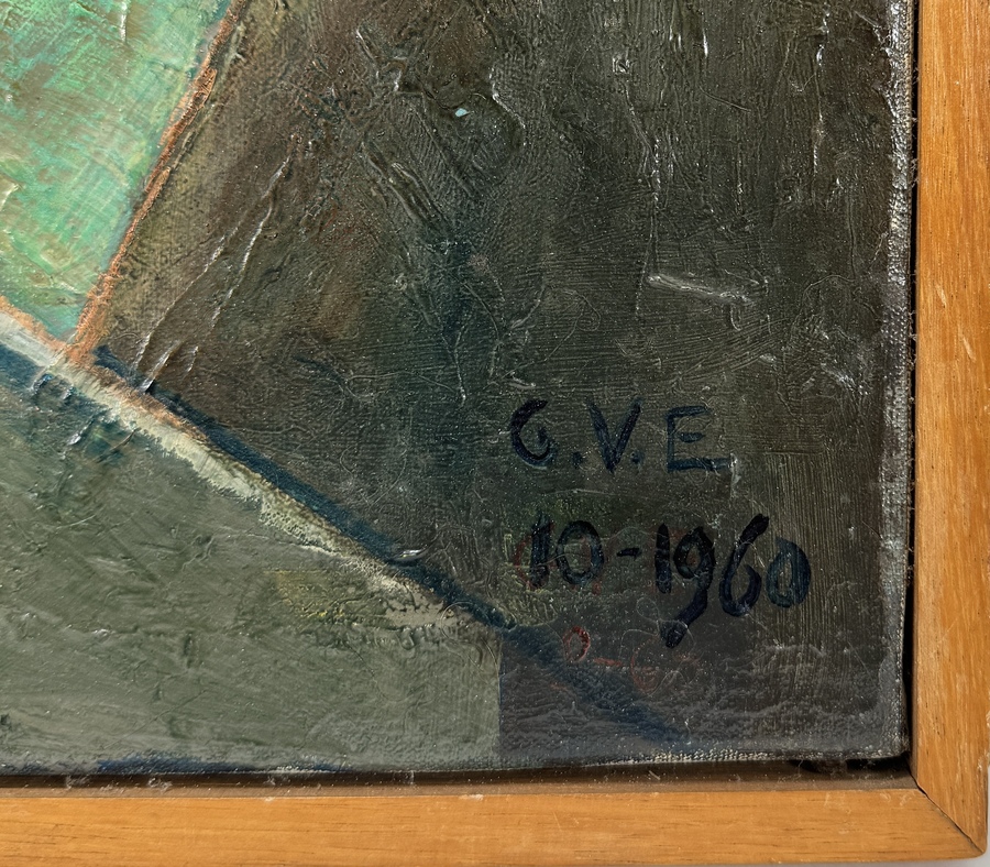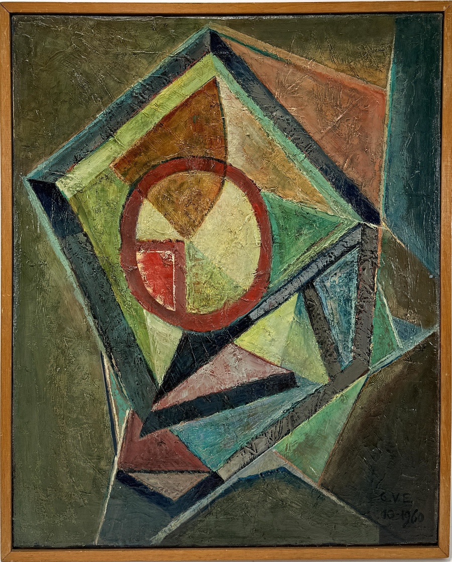Olieverfschilderij op doek met een geometrisch abstracte voorstelling, rechtsonder gesigneerd met de initialen G.V.E. en gedateerd 10-1960. Het abstract modernistische werk is uitgevoerd met prominente geometrische cirkel- en driehoekvormen in gedempte groen-, blauw-, geel- en roodtonen met dikke verflagen. Geïnteresseerd? Bezoek onze kijkdagen op 28, 29 of 30 november van 11:00 tot 17:00 uur! |