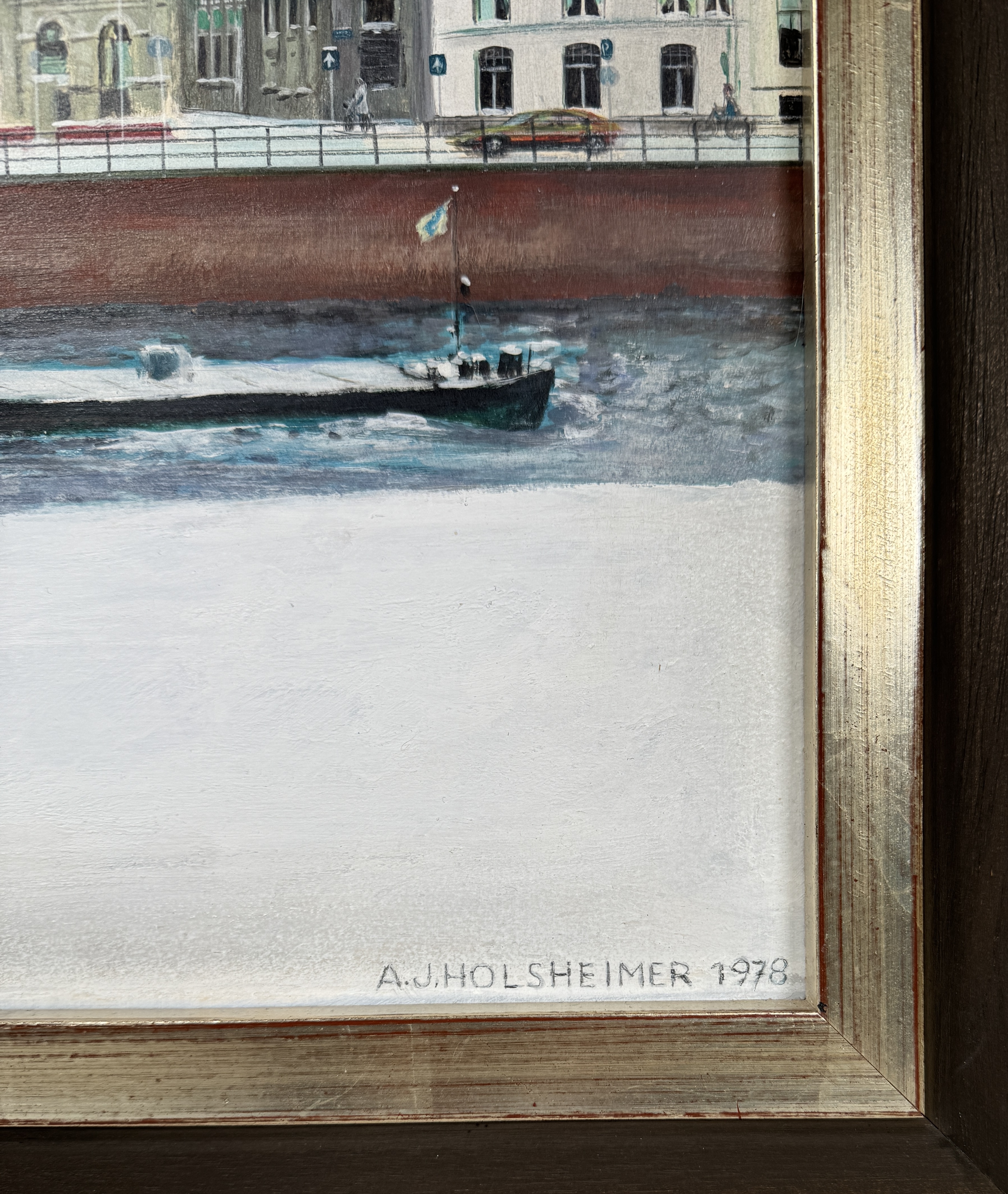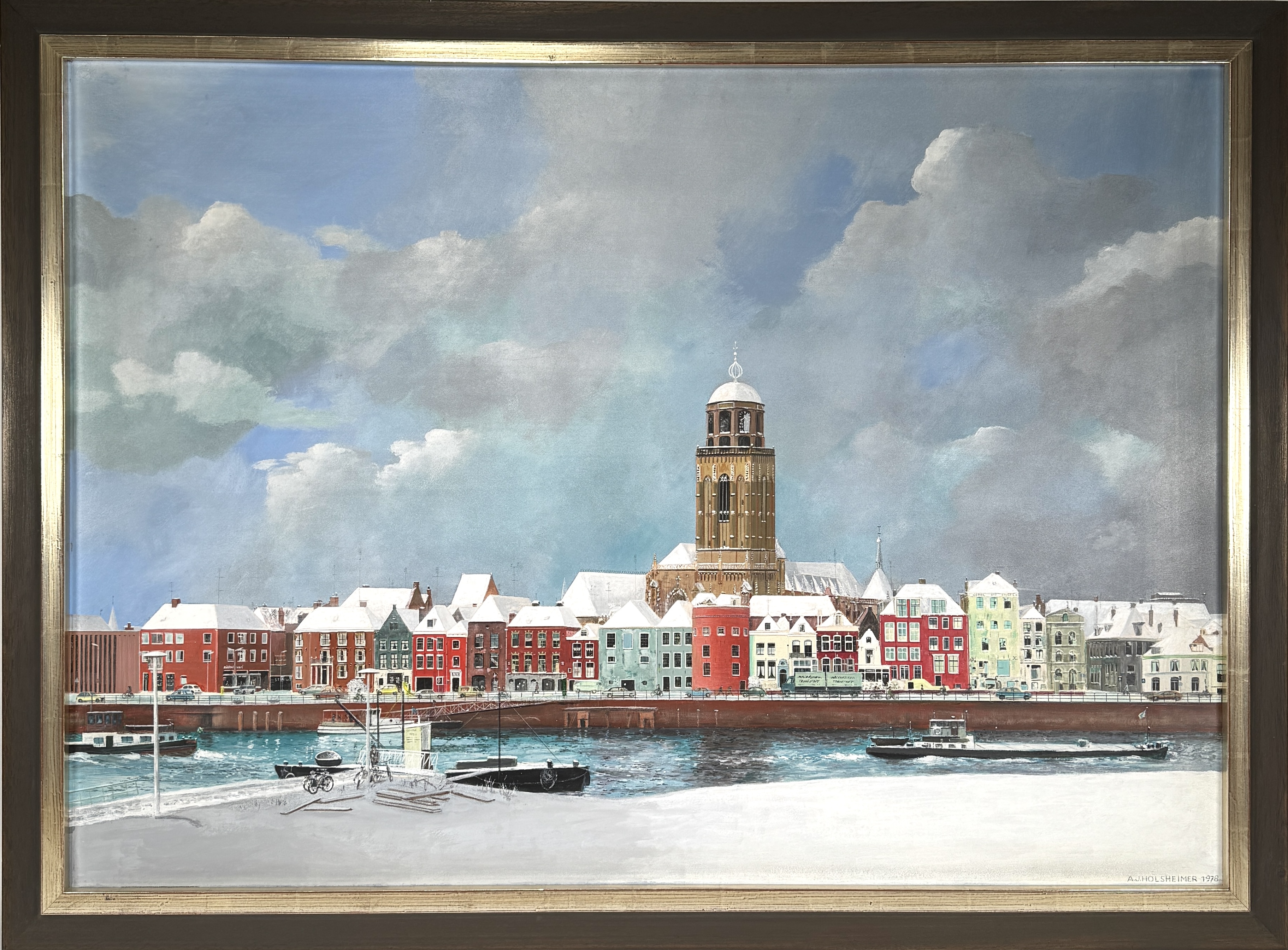 Olieverfschilderij op paneel door de Nederlandse schilder Albertus Johannes Holsheimer (1938–2024) in realistische stijl. Het werk uit 1978 toont een gedetailleerd stadsgezicht van Deventer in de winter met de Lebuinus kerktoren als centraal punt. De schildering heeft een contrastrijk kleurgebruik in de gevels en de kade met binnenvaartschepen. Het werk is rechtsonder gesigneerd en gedateerd. Dit bijzondere schilderij voor jouw collectie? Grijp je kans! |
