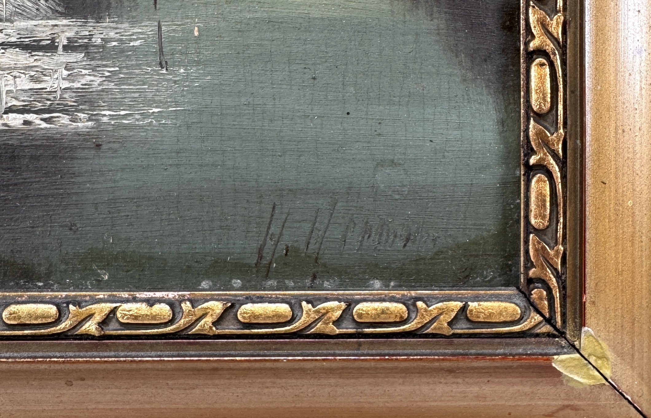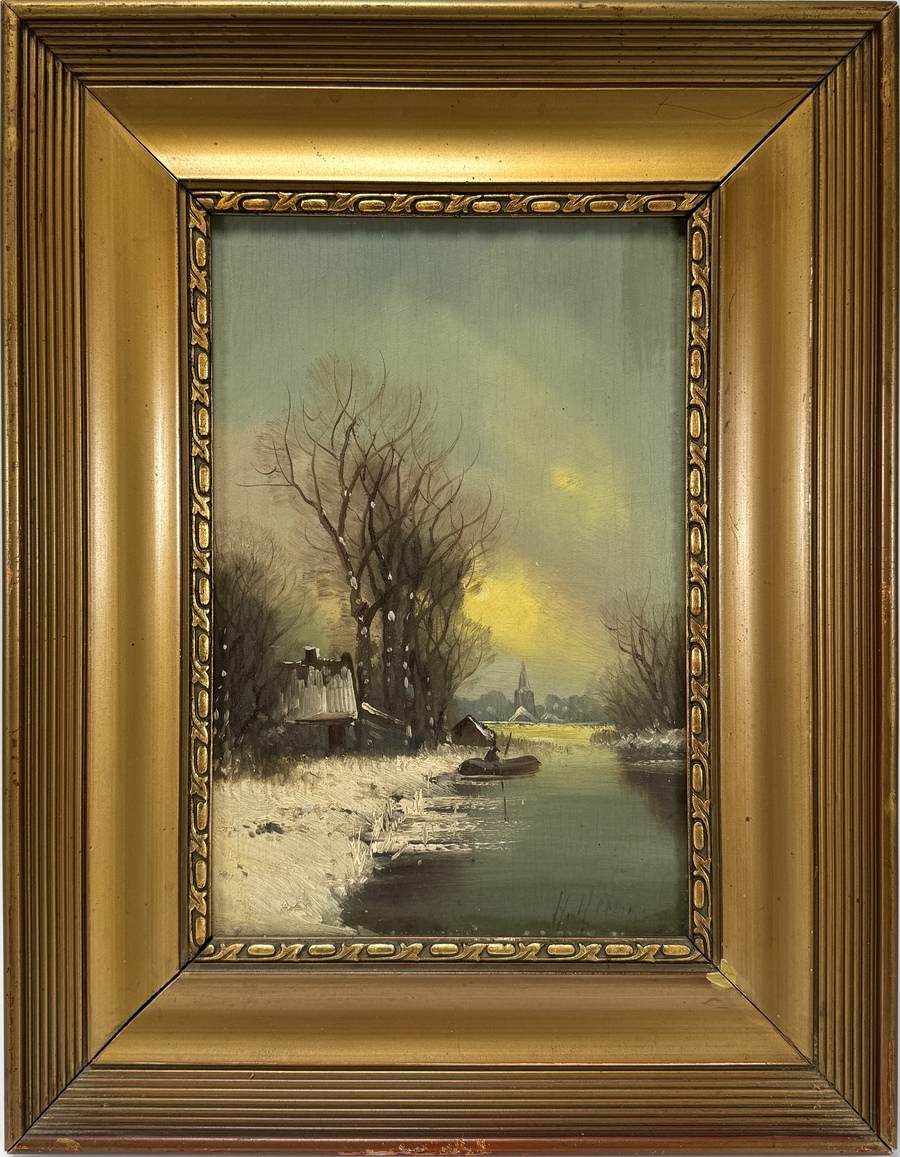 Schilderij, gesigneerd met initialen en onduidelijk naam in romantisch-realistische stijl, olieverf op paneel. Het werk uit het eerste kwart van de 20e eeuw toont een winters rivierlandschap met een kerktoren op de horizon en een gele lichtinval. De schildering is van Nederlandse herkomst en is gevat in een goudkleurige lijst. Registreer nu en bied eenvoudig online mee op dit schilderij! |