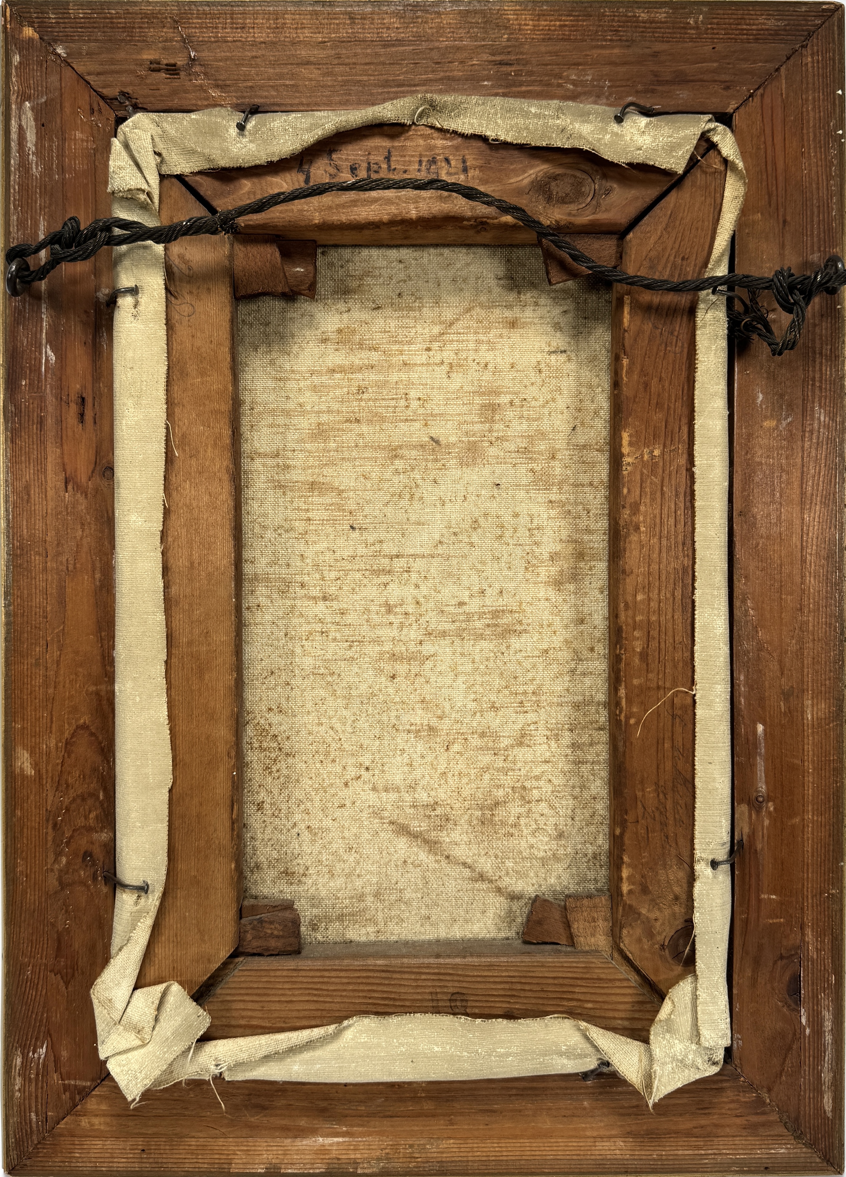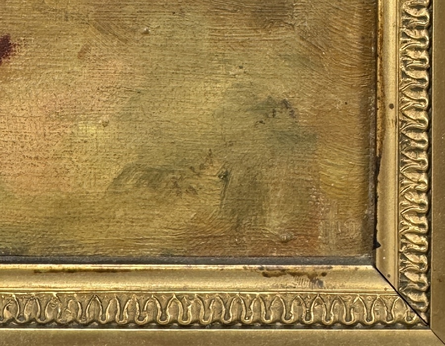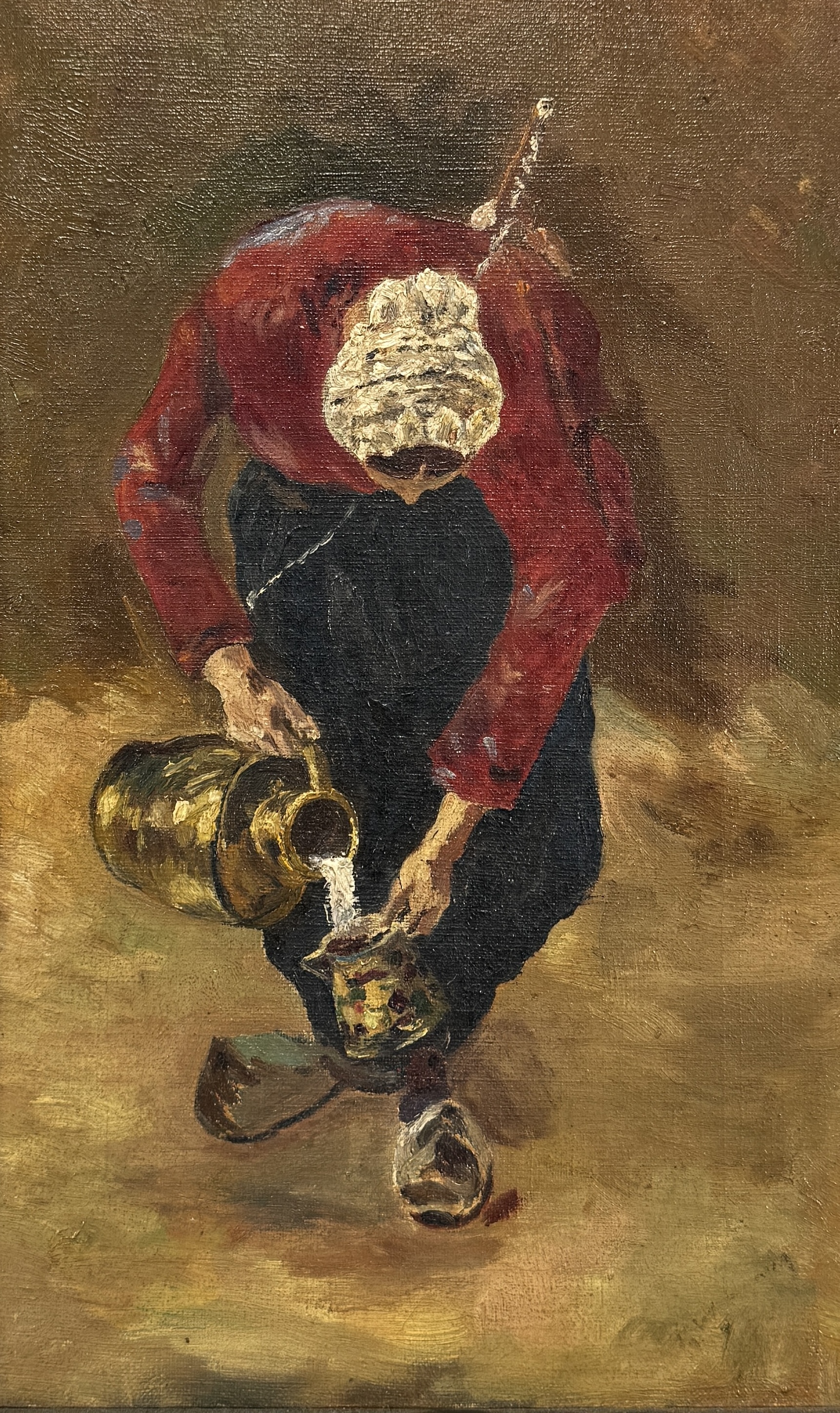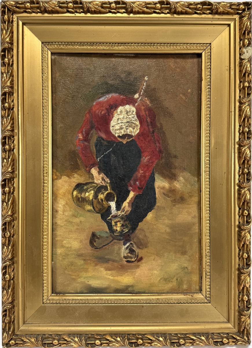 Schilderij uitgevoerd in olieverf op doek, rechtsonder onduidelijk gesigneerd, uit het laatste kwart 19e eeuw, circa 1880–1900, in de stijl van Nederlands realisme. Het toont een boerin in rode blouse en witte muts, die van bovenaf is geschilderd terwijl zij melk uit een koperen kan giet. Kom langs tijdens de kijkdagen (28 t/m 30 november) en ontdek dit doek zelf! |