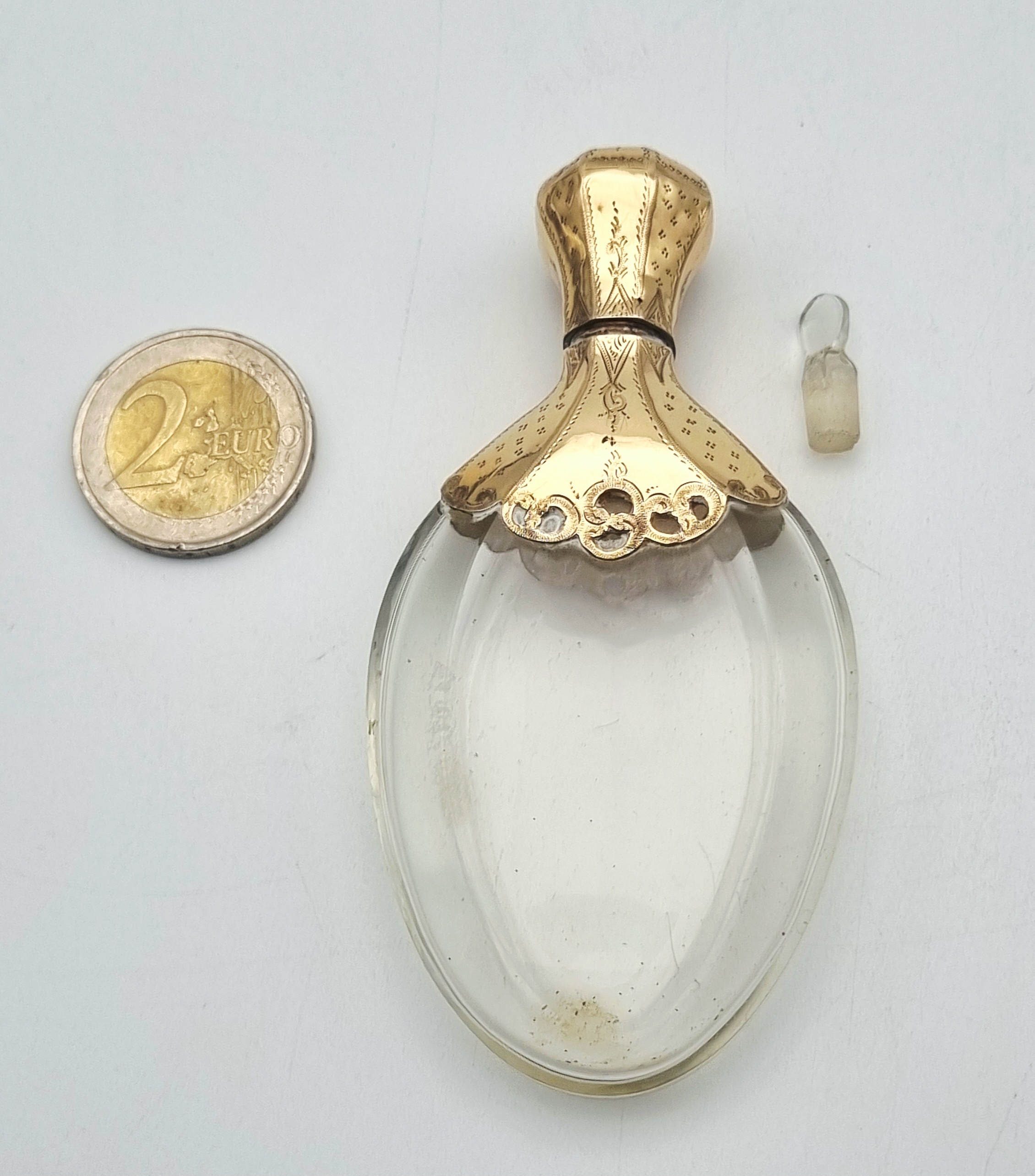 Antiek liggend parfumflesje uit de tweede helft 19e eeuw, Hollandse Biedermeier. Het parfumflesje bestaat uit helder geblazen glas, 14 karaat gouden applicatie en een scharnierende dop van 14 karaats goud. Het goudwerk is gegraveerd en voorzien van een ajour bewerkte kraag. De dop is gemerkt met het Nederlandse eikenbladkeur (1853–1905)., het originele glazen stopje is aanwezig. Jouw kans op dit object begint met registreren – bied live of online mee! |