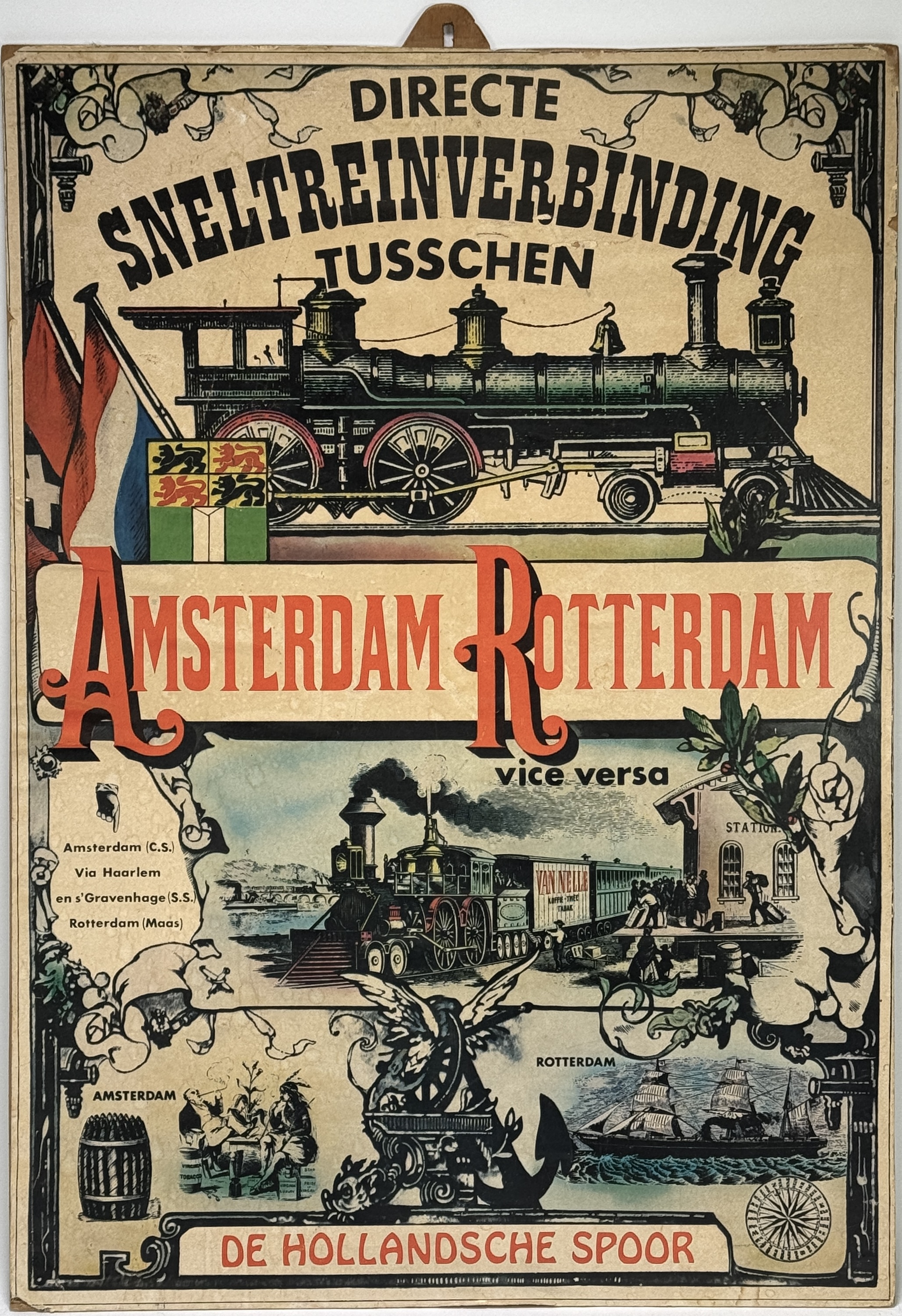 Affiche “Directe sneltreinverbinding tusschen Amsterdam en Rotterdam”, lithografie in kleur op papier, tweede helft 19e eeuw. Grafisch ontwerp in laat Victoriaanse stijl met locomotieven, stadsgezichten en decoratieve omlijsting, uitgegeven door De Hollandsche Spoorwegmaatschappij. De poster is gemonteerd op houten paneel met ophangoog aan de bovenzijde. Klaar om te bieden? Registreer je nu en doe mee aan de veiling! |