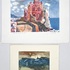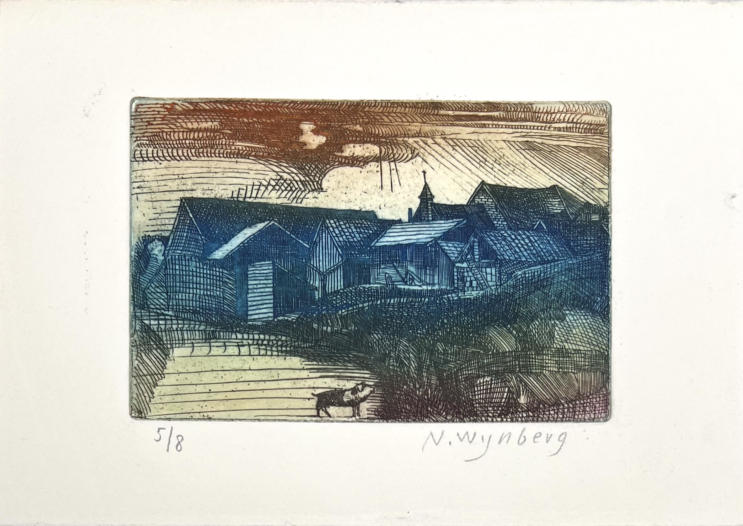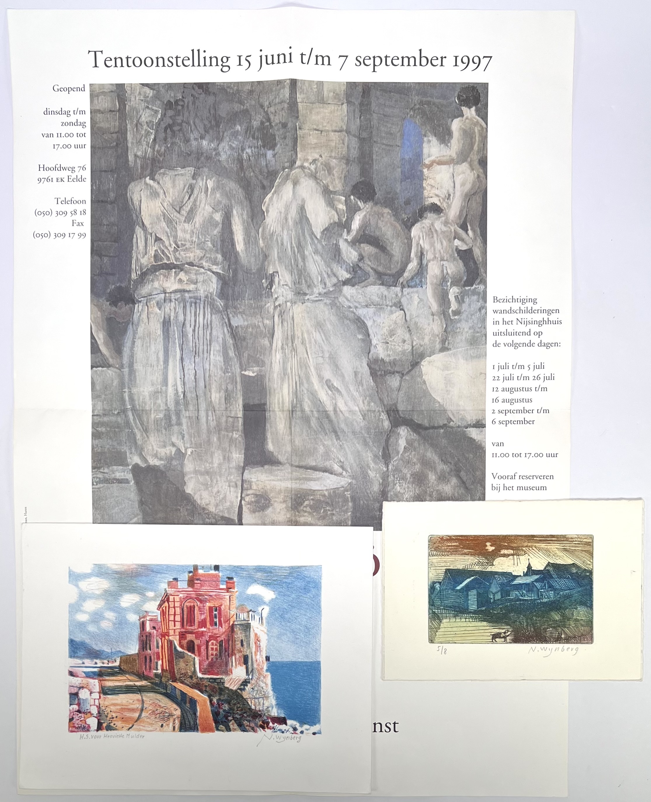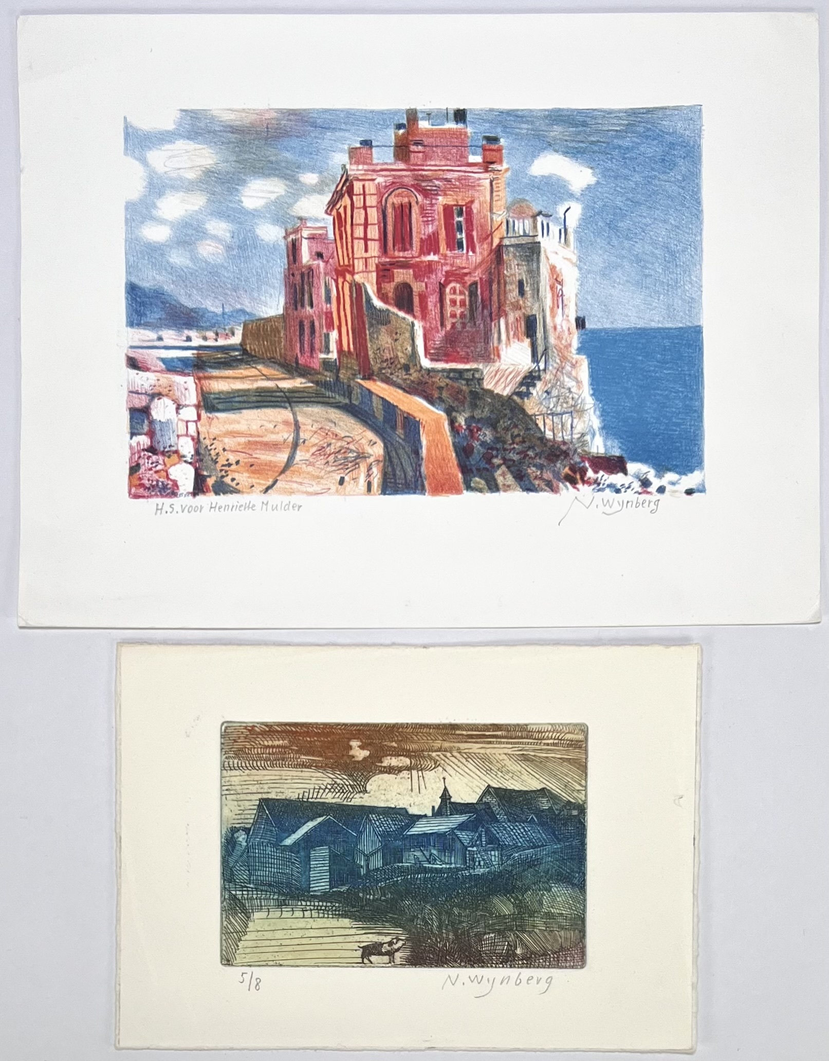 Gesigneerde ets op papier, nummer 5/8, en een bijpassende kleurenlitho van de Nederlandse graficus Nicolaas Wijnberg (1918–2006). De ets uit midden 20e eeuw toont een dorpsgezicht met geit in expressionistische stijl, handgekleurd met blauw en roodbruin. De litho met opdracht beeldt een rood huis aan zee af. Vergezeld van een poster. Jouw kans op deze kunstwerken begint met registreren – bied live of online mee! |