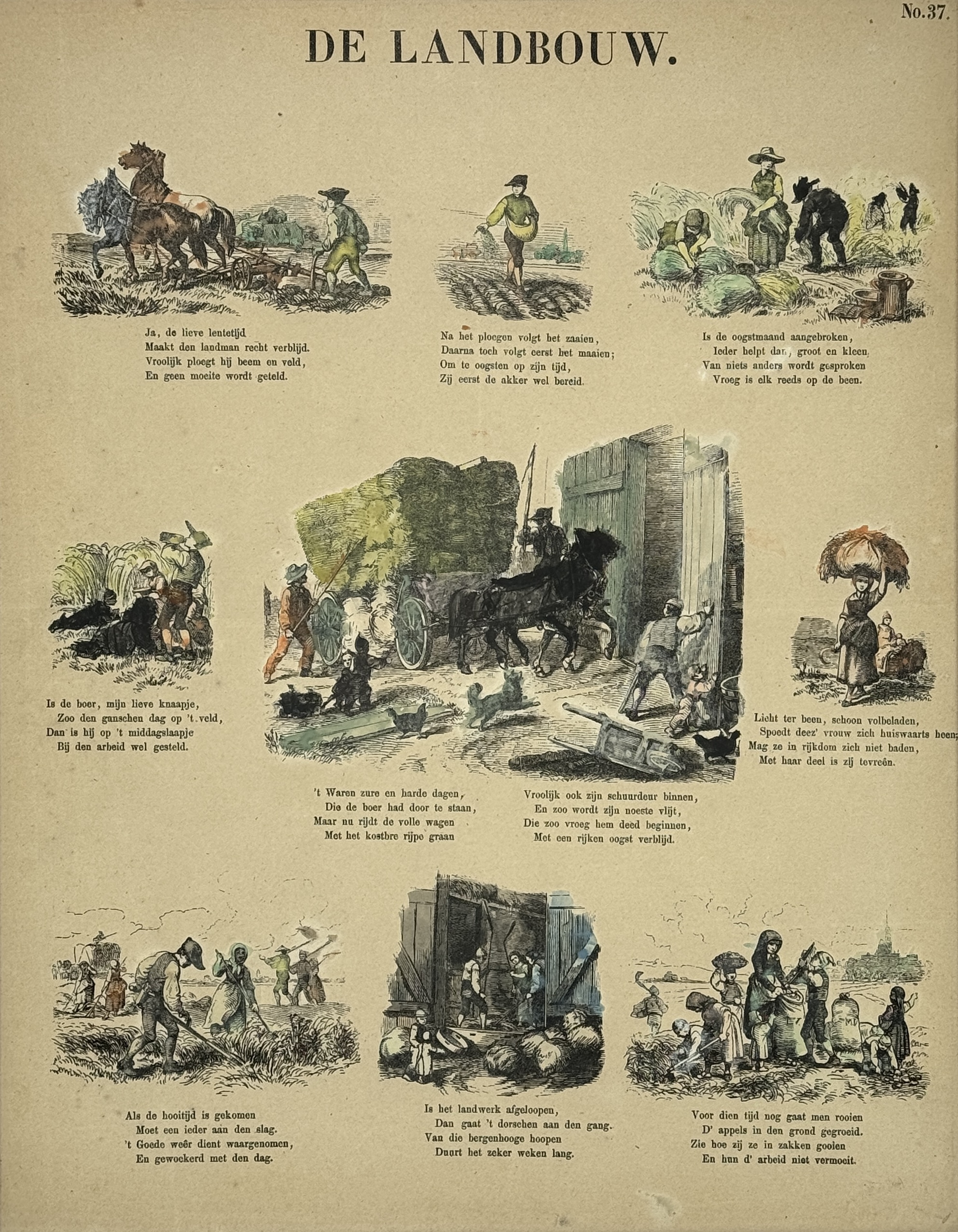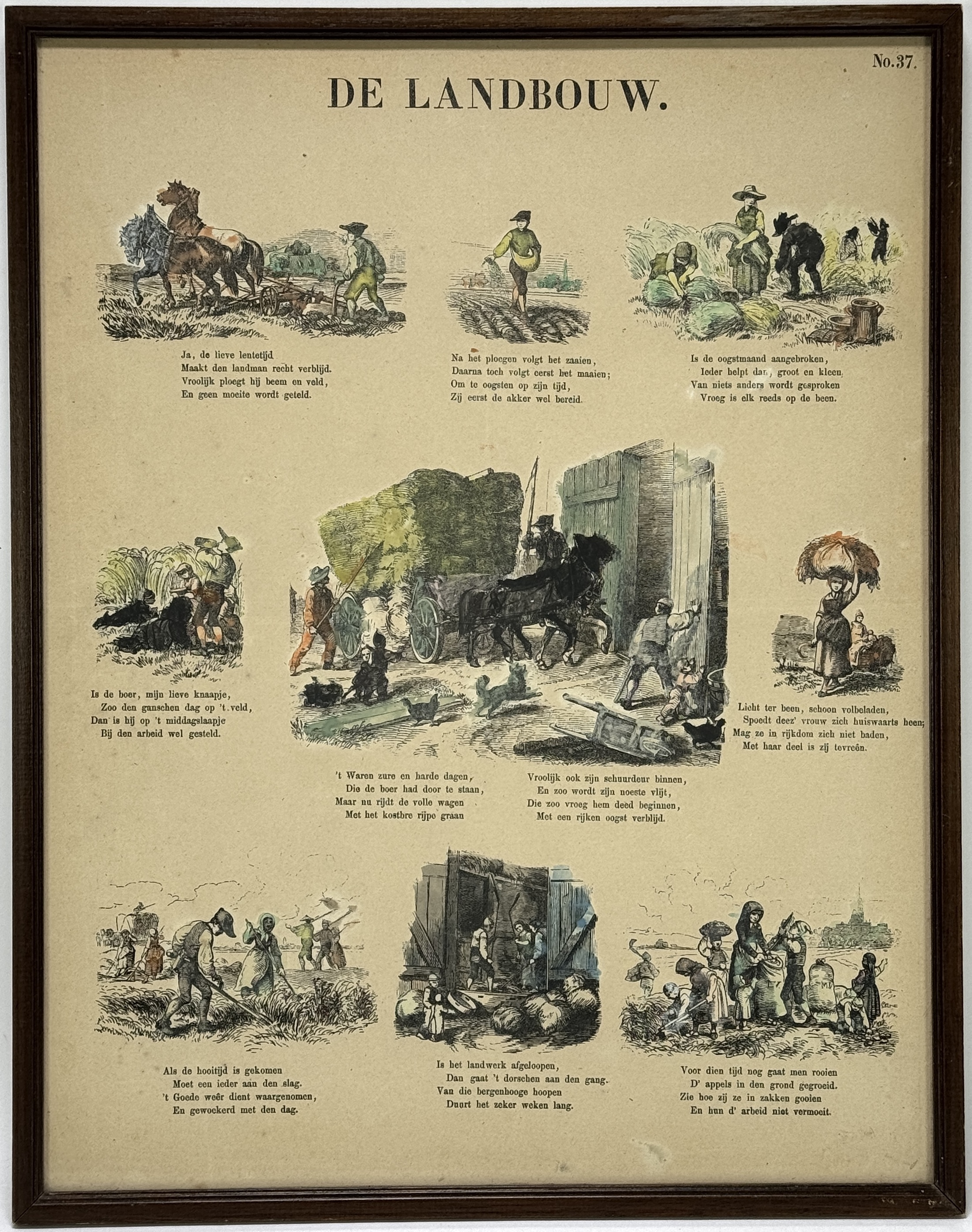 Kleurlitho op papier, getiteld “De Landbouw.”, nr. 37, eind 19e eeuw. De prent toont in negen scènes de seizoensgebonden arbeid van de boer, begeleid door moralistische verzen. Uitgevoerd in zachte tinten en klassieke educatieve stijl, waarschijnlijk Nederlandse uitgave. Ingelijst in een donkerhouten lijst met label van Kunsthandel Muurtooi, Arnhem. Zeker zijn van deelname? Plaats vanaf 21 november een schriftelijk bod online! |