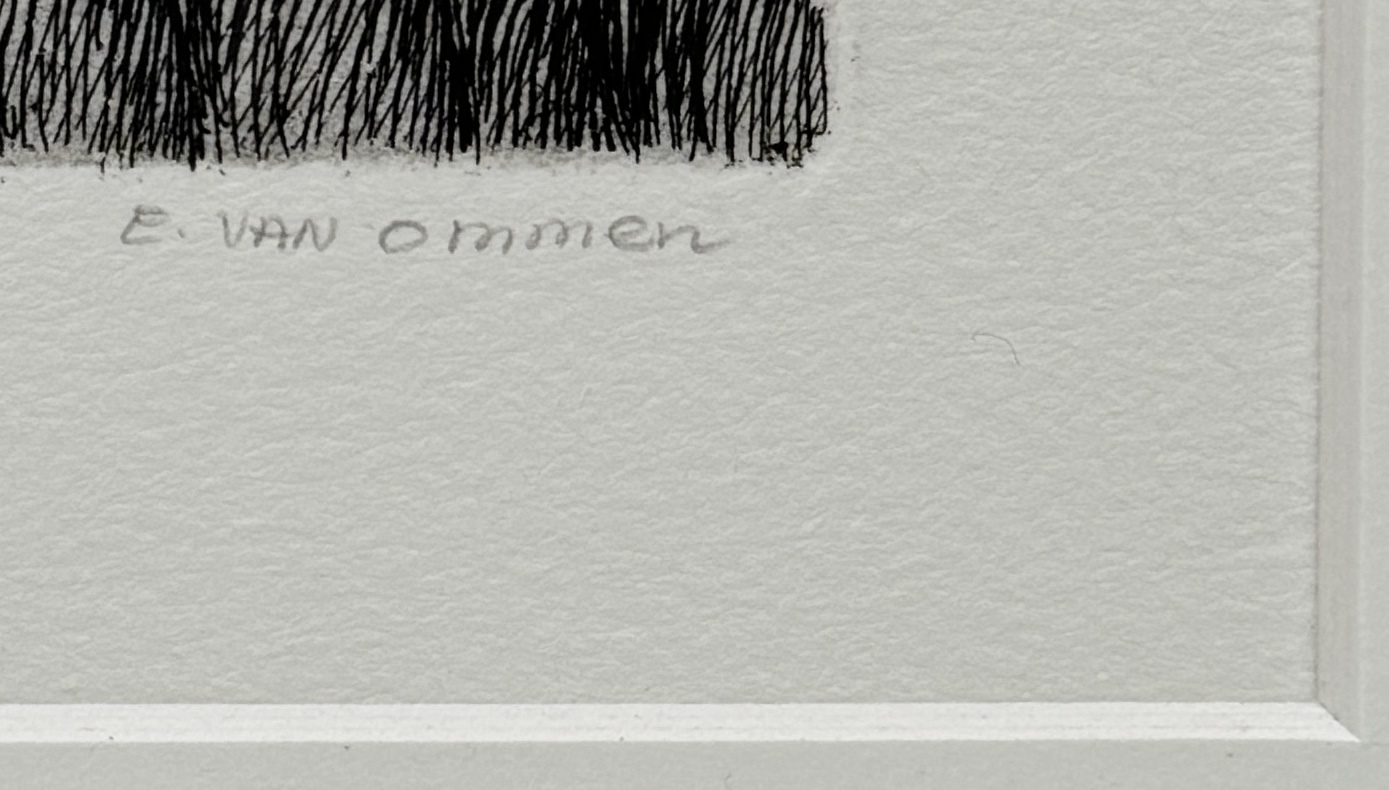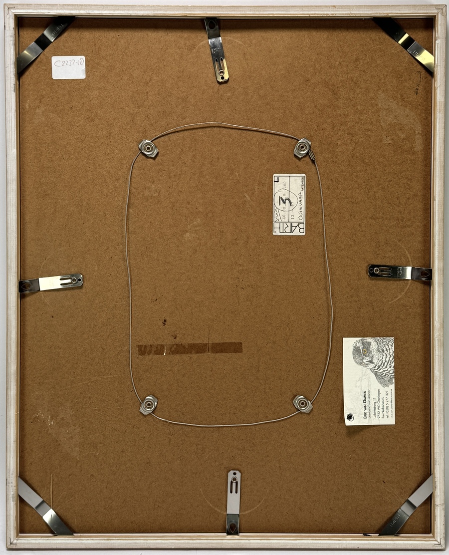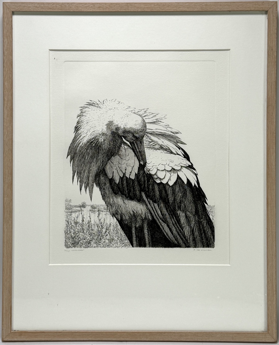Ets op papier van Erik van Ommen (1956) in naturalistische stijl, voorstellende een ooievaar met gebogen hals in rustige pose. Het werk is gesigneerd rechtsonder, getiteld en genummerd 15/15 linksonder. Kenmerkend zijn de verfijnde detaillering, contrastrijke arcering en ornithologische precisie. De compositie benadrukt de houding en structuur van de veren. Het werk bevindt zich in een houten lijst met passe-partout. Ontdek deze ets en voeg het toe aan jouw collectie! Registreer nu voor de veiling. |