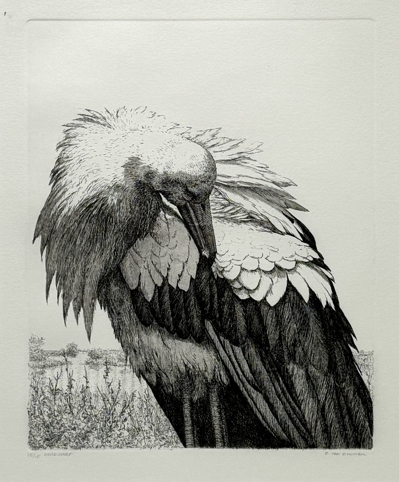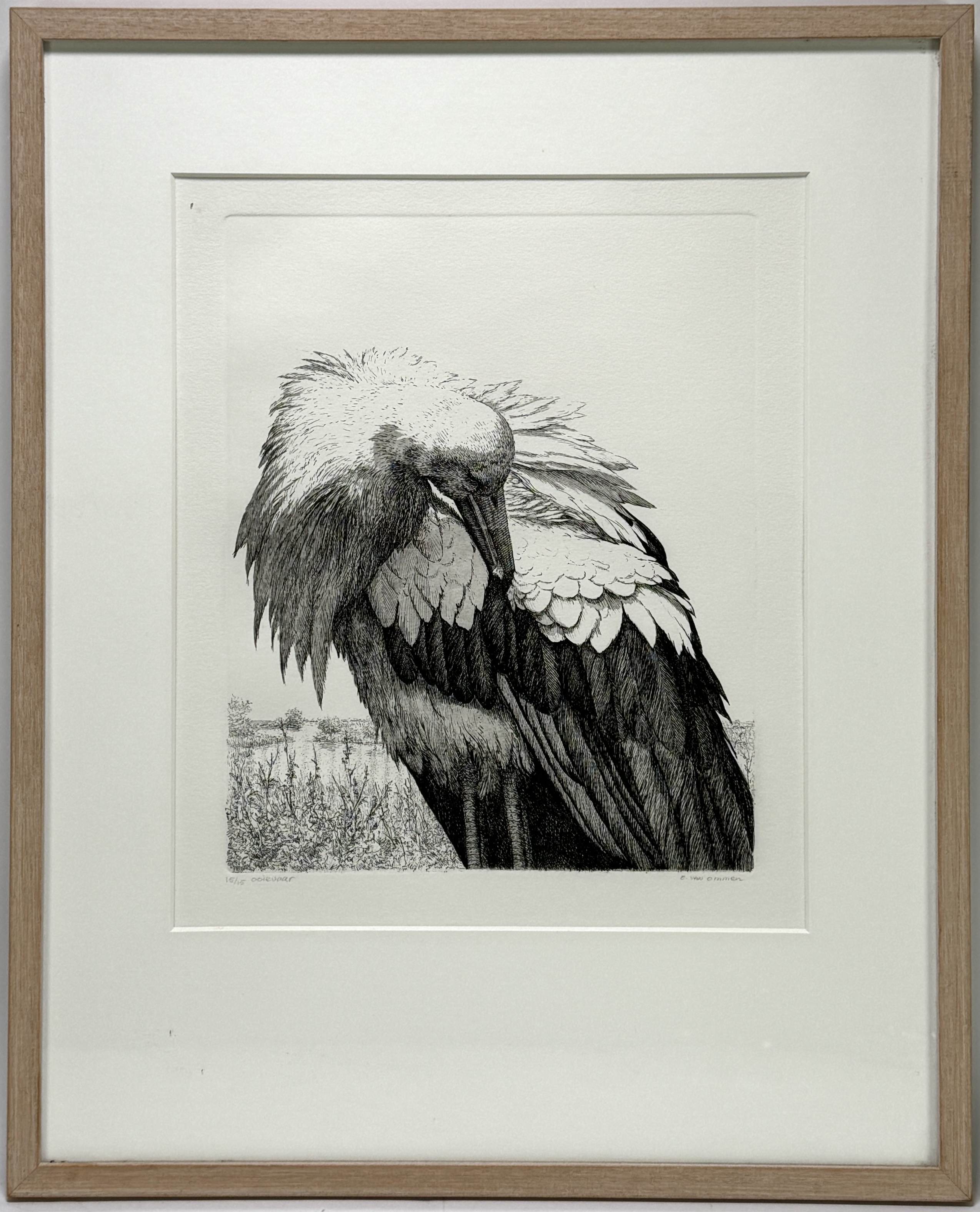 | Kavelnummer en naam | 132. Ets, Erik van Ommen – ooievaar in naturalistische stijl, eind 20e eeuw | |