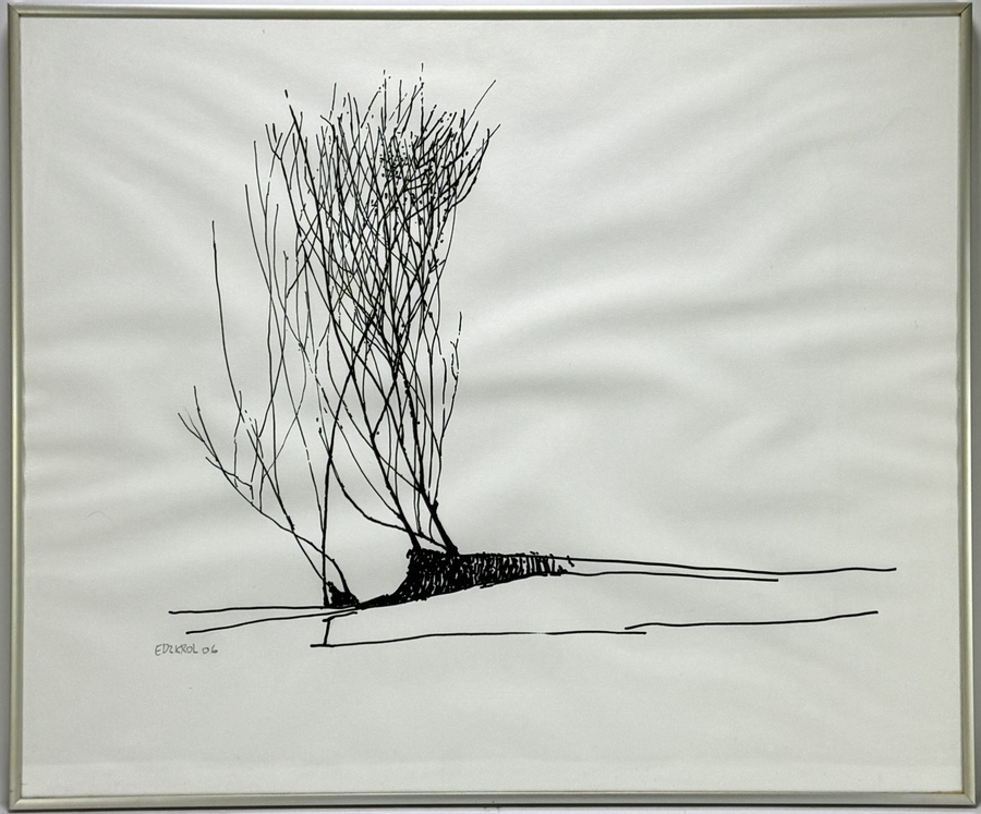 Inkttekening op papier van Edzard Krol (1938), gesigneerd linksonder “EDZKROL 06”. Het werk toont in minimalistische, grafische stijl een boom met ranke takken in een horizontale compositie. Uitgevoerd in zwarte inkt, datering 2006, met strakke lijnvoering en reductie van vorm. Het werk bevindt zich in een zilverkleurige lijst. Voeg deze tekening toe aan je verzameling en doe een bod! |