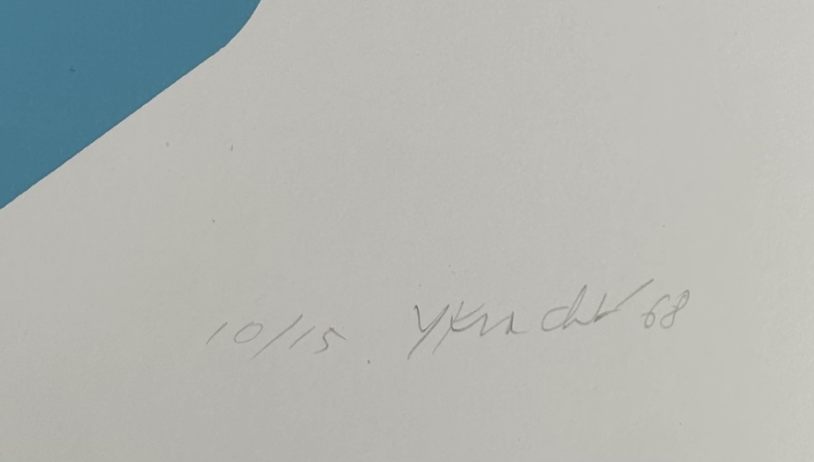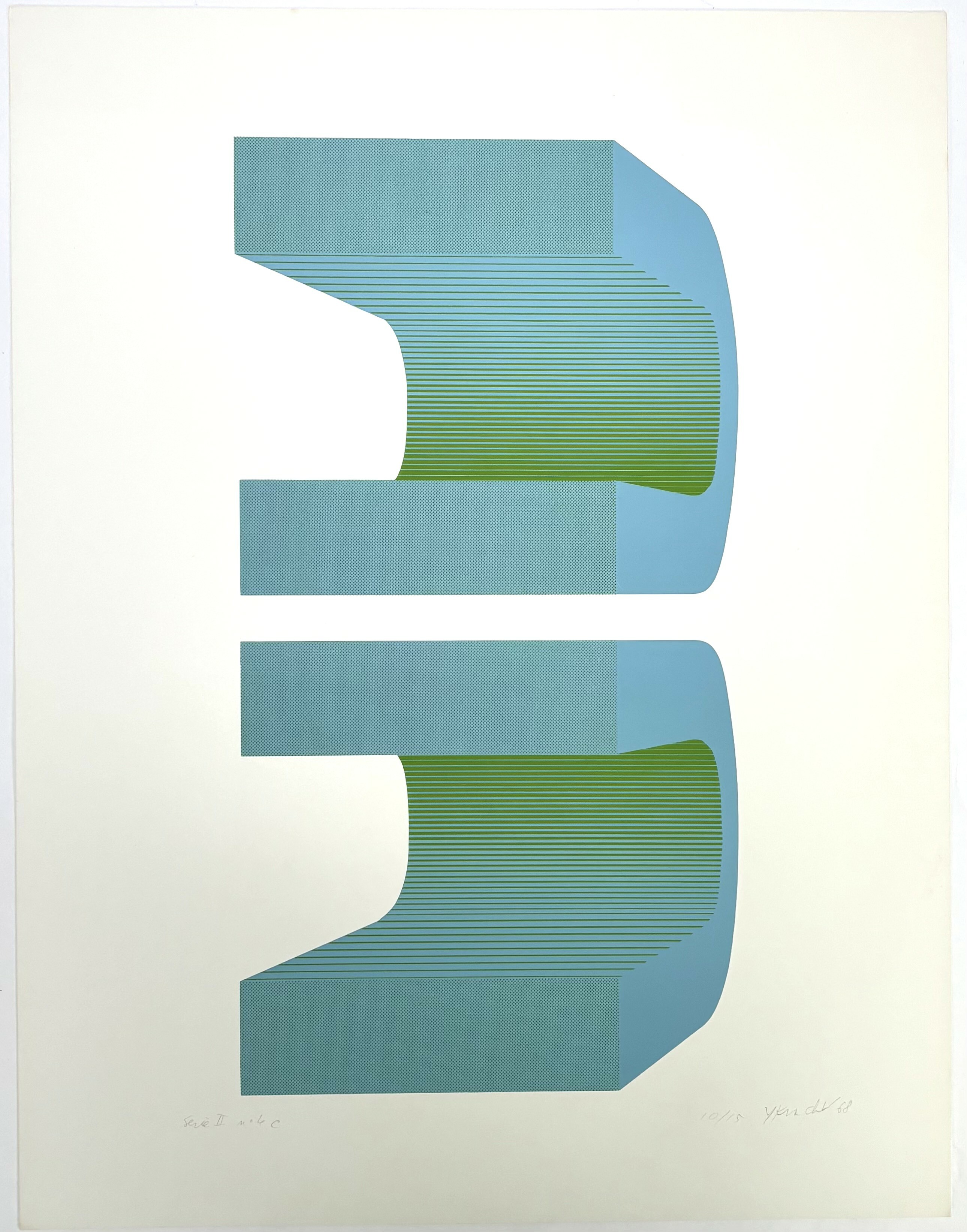 Zeefdruk op papier, geometrisch-abstracte compositie in blauw-groene kleurvlakken door Yvonne Kracht (1931). Linksonder vermelding Serie II no. 4c, rechtsonder oplagenummer 10/15, signatuur en datering.