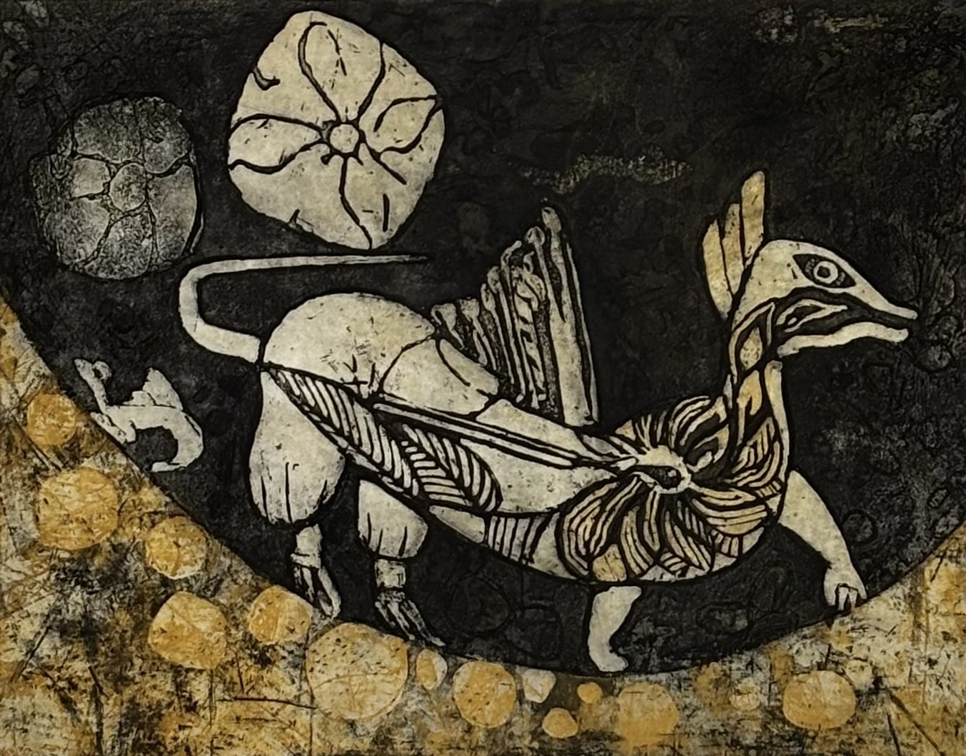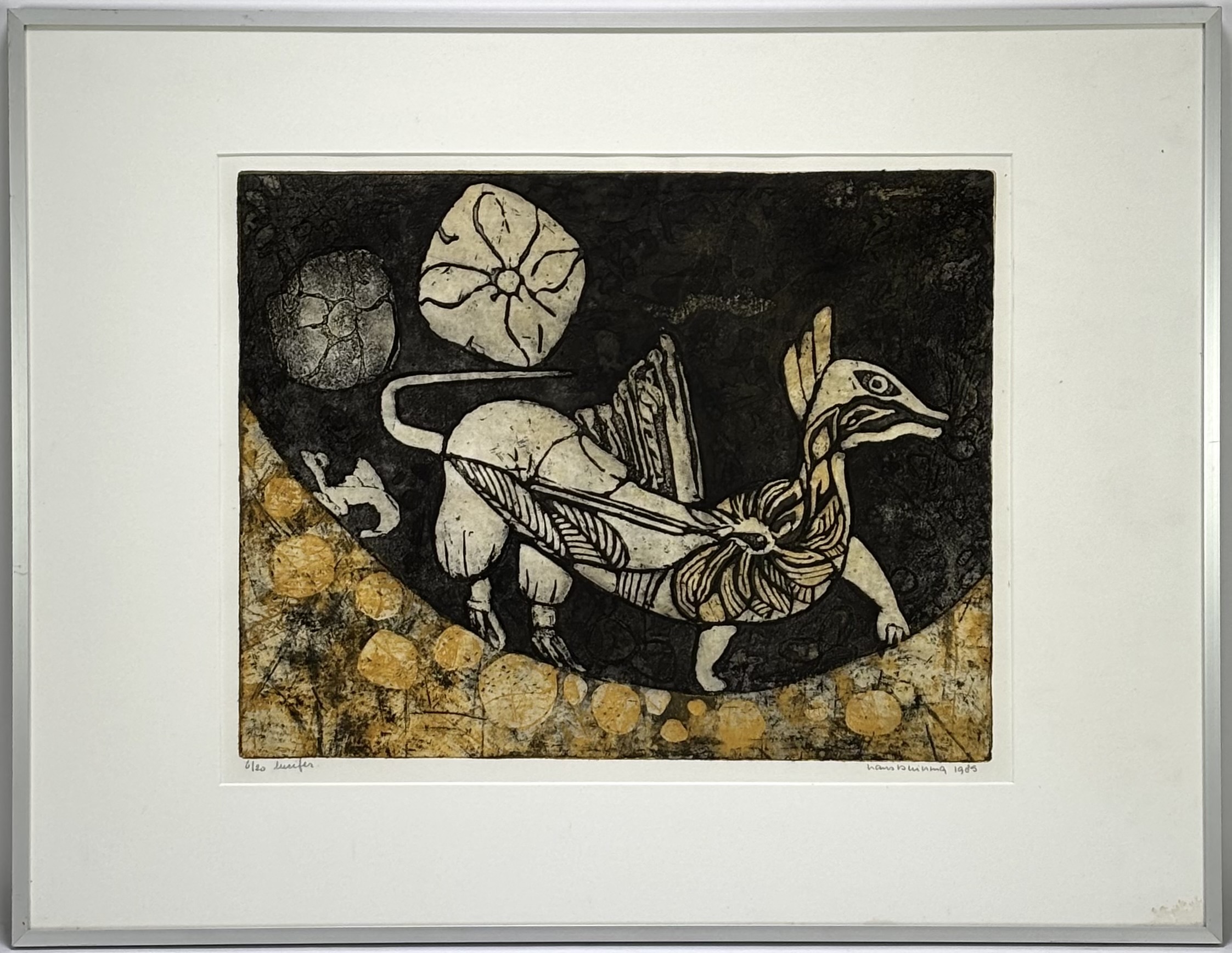 Ets op papier door Hans Duinma uit 1975, getiteld “Lucifer", oplagenummer 6/20. De compositie in modernistisch-symbolistische stijl toont een mythisch dier in contrastrijk oker en zwart. Gesigneerd en gedateerd in potlood. Eerst deze ets zien voordat je biedt? Bezoek onze kijkdagen op 28, 29 en 30 november van 11:00 tot 17:00 uur! |