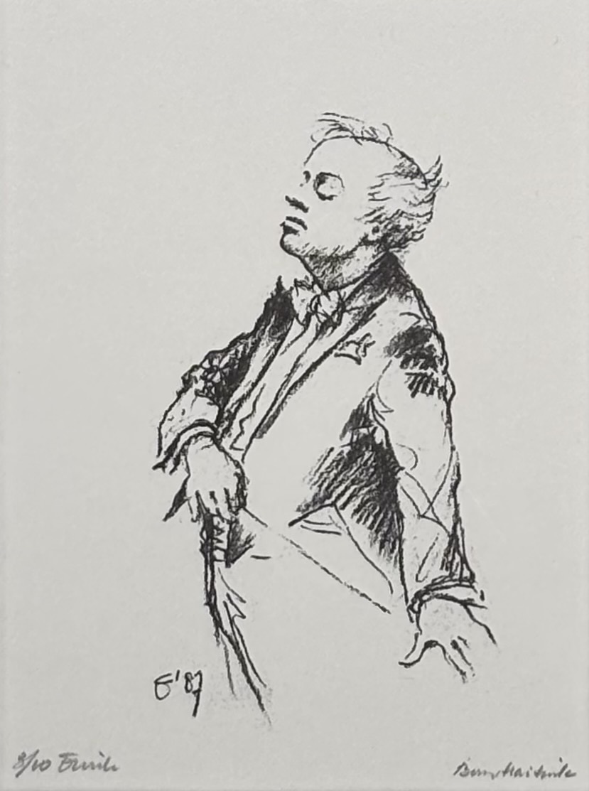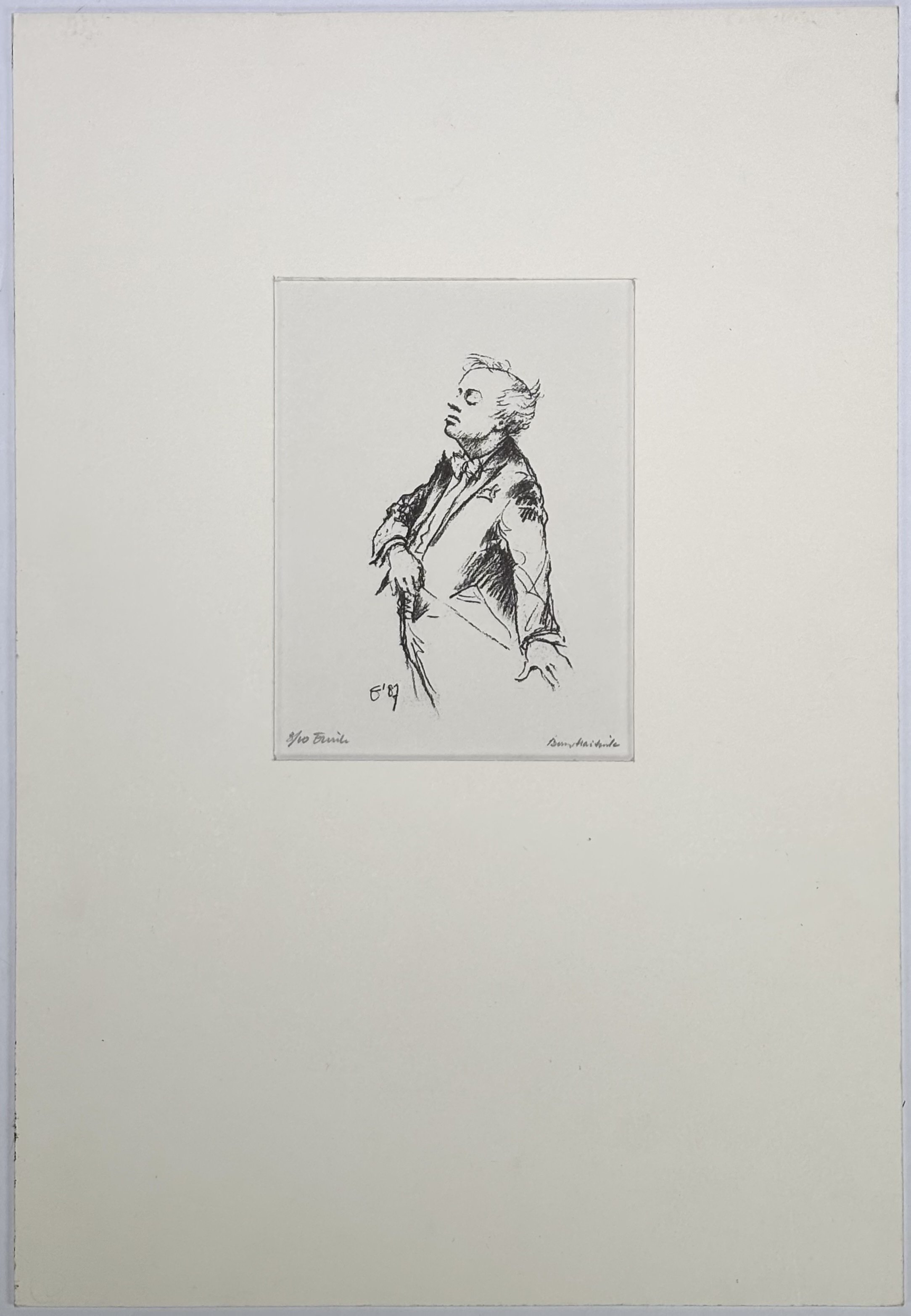 Ets op papier, portret van dirigent door Bernard Haitink (1929–2021), gesigneerd rechtsonder en genummerd 3/10 linksonder, gedateerd ’87 in de plaat. Figuratief-expressionistisch uitgevoerd met vloeiende lijnvoering en karakteristieke houding van de dirigent, Nederlandse herkomst, tweede helft 20e eeuw. Jouw kans op deze ets begint met registreren – bied live of online mee! |