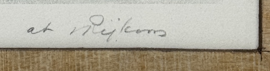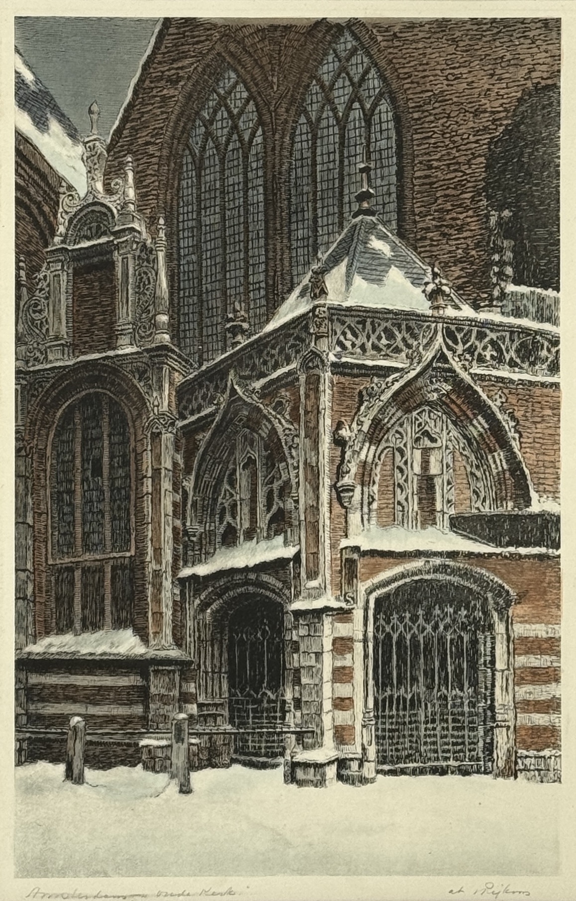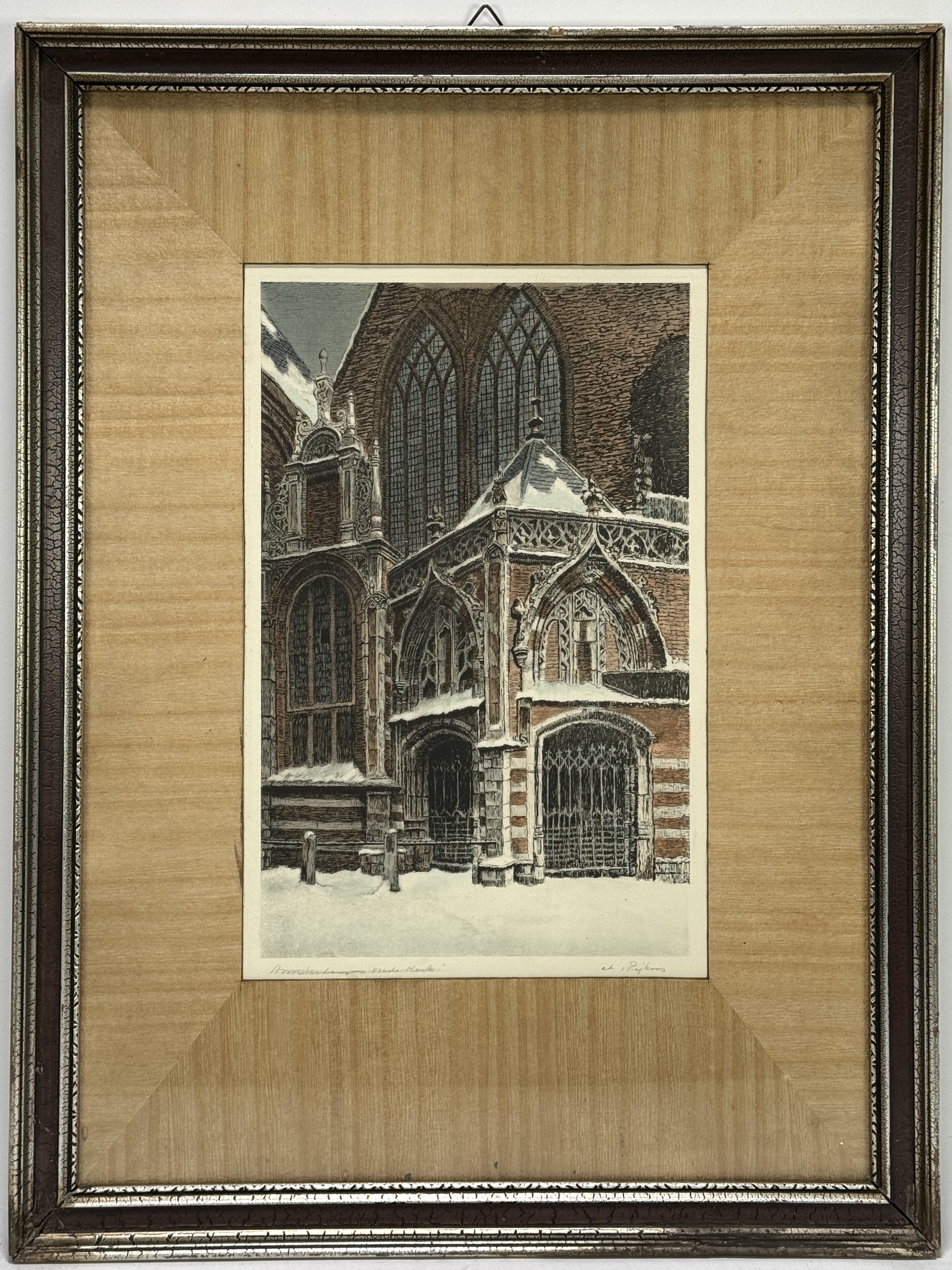 Kleurenets op papier in naturalistische stijl, voorstellende de Oude Kerk in Amsterdam in winterse setting. De prent is gesigneerd rechtsonder "at Rijkens" en getiteld linksonder. Het werk toont gedetailleerde gotische architectuur met sneeuw op de daken en ramen. Het bevindt zich in een houten lijst met passe-partout. Jouw kans op dit kleurets begint met registreren – bied live of online mee! |