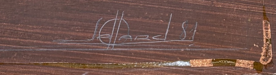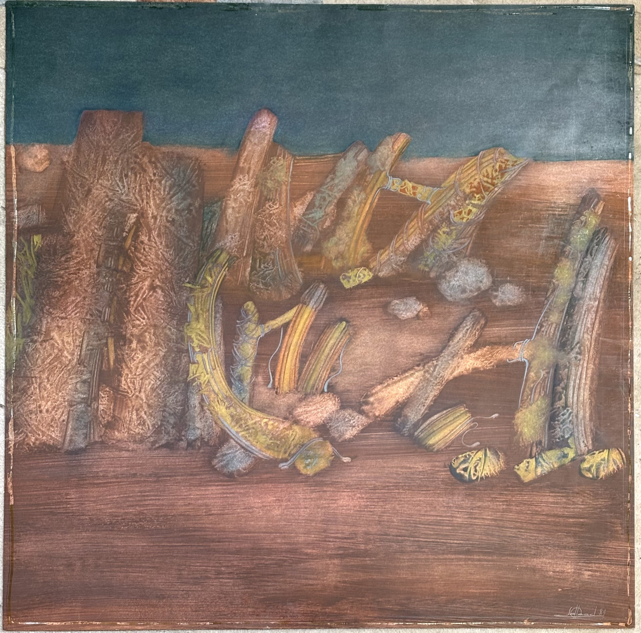 Acrylverfschilderij op papier, rechtsonder onduidelijk gesigneerd en gedateerd 81. Uitgevoerd in abstract-surrealistische stijl met aardse tinten en organische vormen. De compositie toont een gelaagde, horizontale structuur met textuur- en dieptewerking, waarin abstracte objecten oprijzen uit een donkere ondergrond. Klaar om te bieden? Registreer je nu en doe mee aan de veiling! |