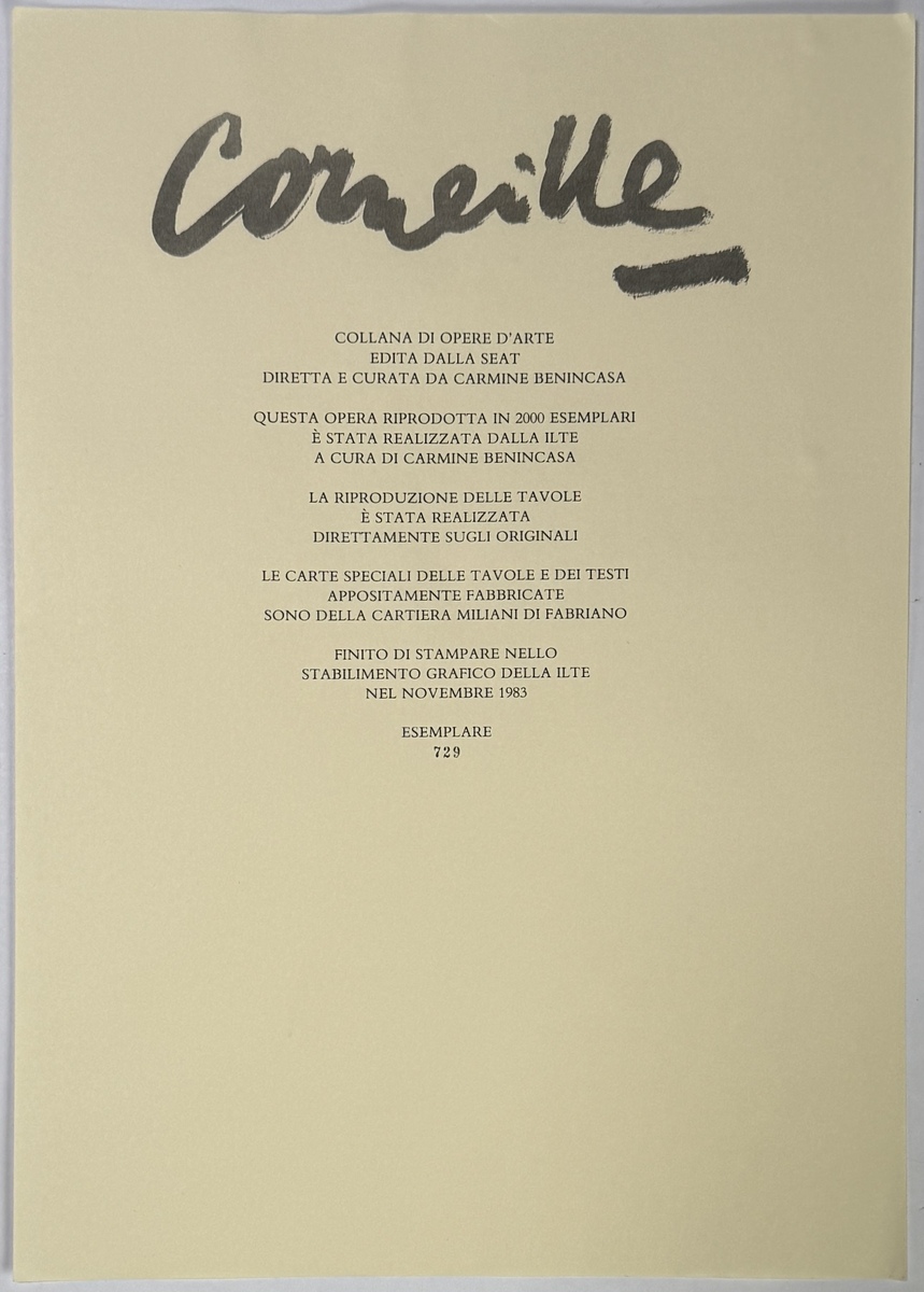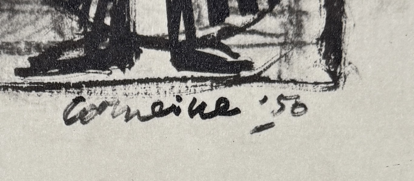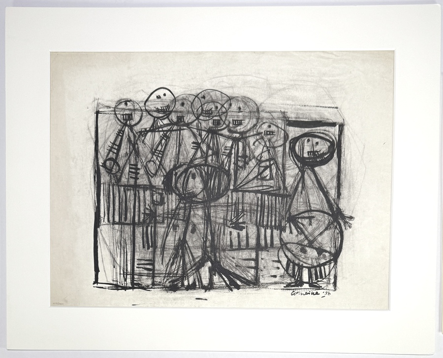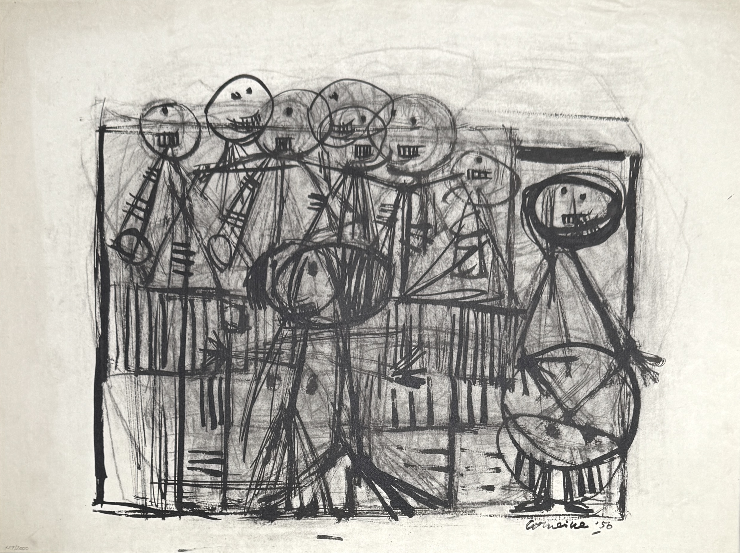 Litho door Cornelis Guillaume van Beverloo (1922–2010), uitgevoerd in 1983 naar een origineel uit 1956, gedrukt door ILTE in een oplage van 2000 exemplaren onder leiding van Carmine Benincasa. Uitgevoerd op speciaal Fabriano-papier, genummerd 729/2000. Het werk toont een groep gestileerde figuren in zwart-wit, typerend voor de naoorlogse Cobra stijl, met expressieve lijnvoering en vereenvoudigde vormen.