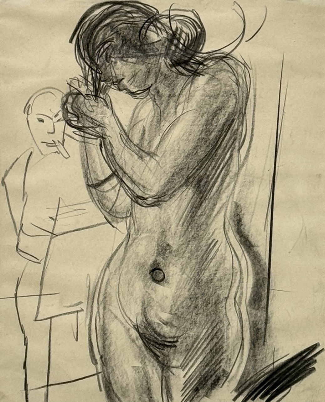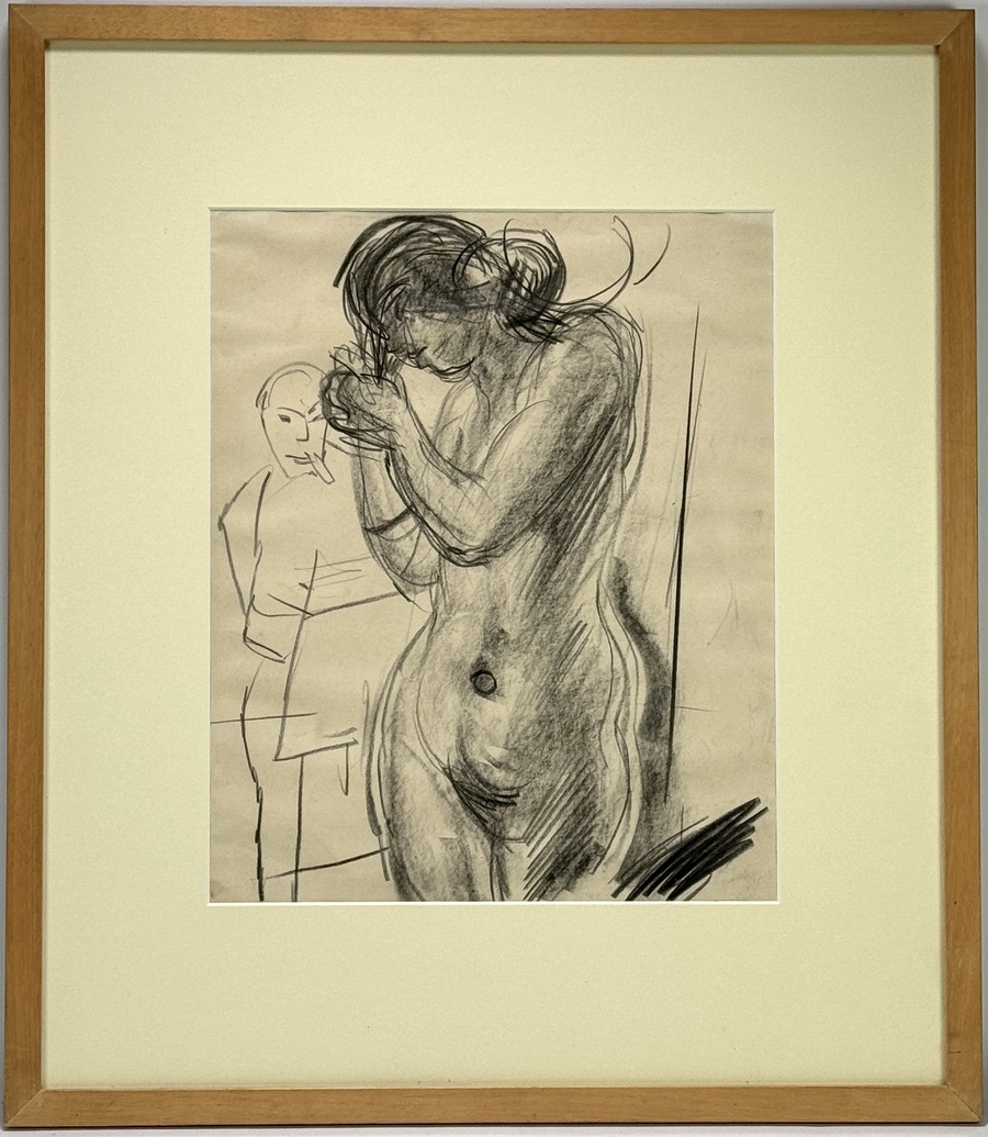 Houtskooltekening op papier met voorstelling van een naakte vrouw die haar hoofd buigt en haar handen samenhoudt, met een schetsmatige mannelijke figuur op de achtergrond. Uitgevoerd in expressieve, modernistische stijl, midden 20e eeuw. De tekening bevindt zich in een houten lijst met passe-partout. Klaar om te bieden? Registreer je nu en doe mee aan de veiling! |