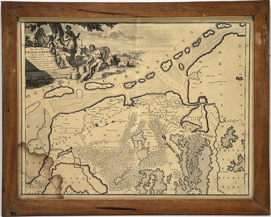 Kopergravure op papier door Gerrit de Broen (I) en Joseph Mulder, naar ontwerp van Menso Alting, getiteld “Pars II et III Frisiae Liberae a Flevo in Lavicam”. Historische kaart van het Friese en Groningse kustgebied in de Romeinse tijd, uitgegeven te Amsterdam (1725), met allegorische cartouche van Concordia en Justitia. In houtkleurige lijst. Wil je direct deelnemen? Plaats vanaf 21 november alvast een schriftelijk bod via onze website! |