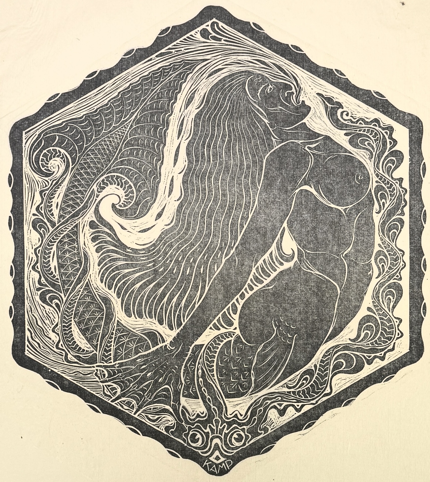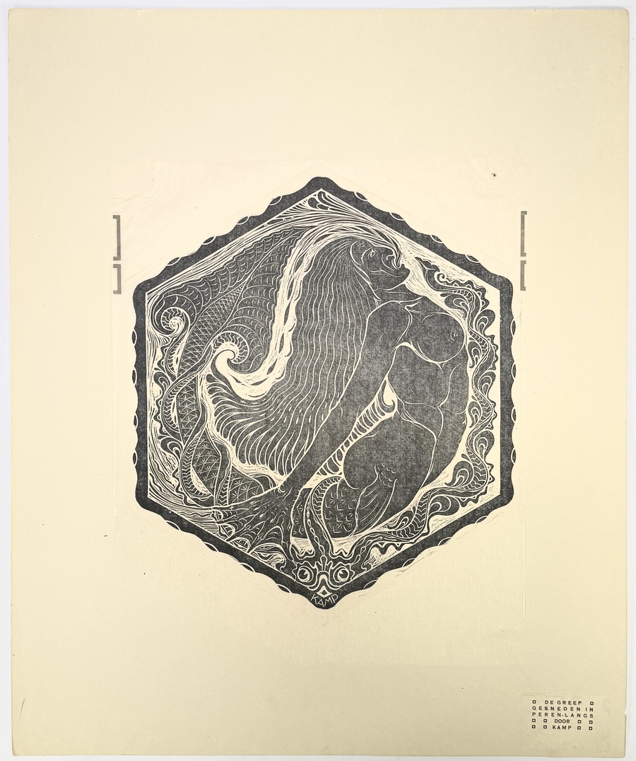 Art Nouveau houtsnede op papier van de Nederlandse graficus Johan Bernard Kamp (1884–1953). De symbolistische voorstelling is getiteld "De Greep" en toont een gestileerde zeemeermin omsloten door een zeshoekig kader van golvende lijnen. Het werk is gesigneerd 'KAMP' in de plaat en dateert uit de vroege 20e eeuw, circa 1905–1920. Wil je deze prent in het echt bekijken? Kom naar de kijkdagen op 28, 29 en 30 november! |