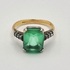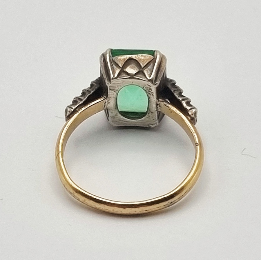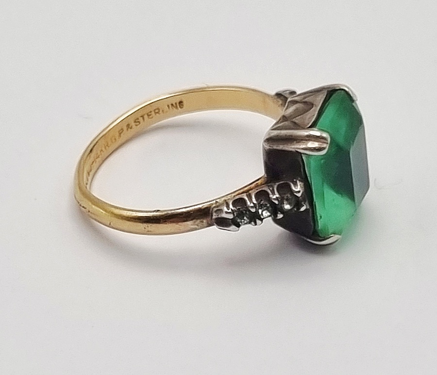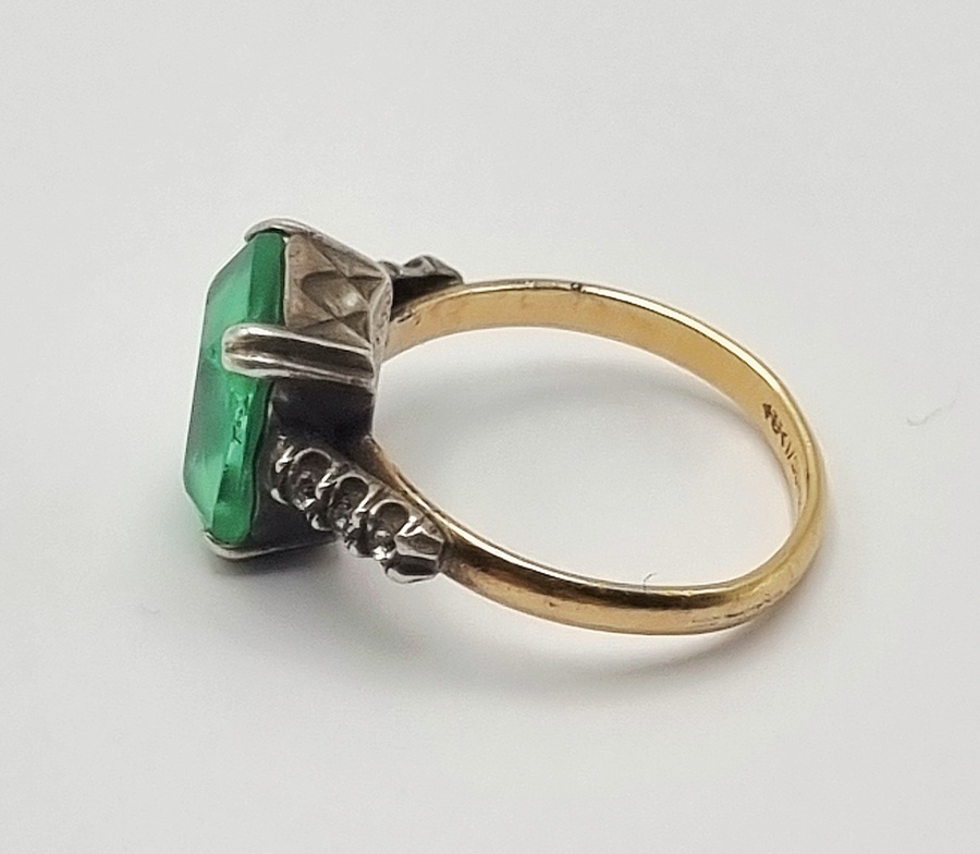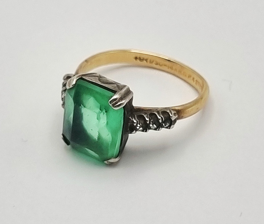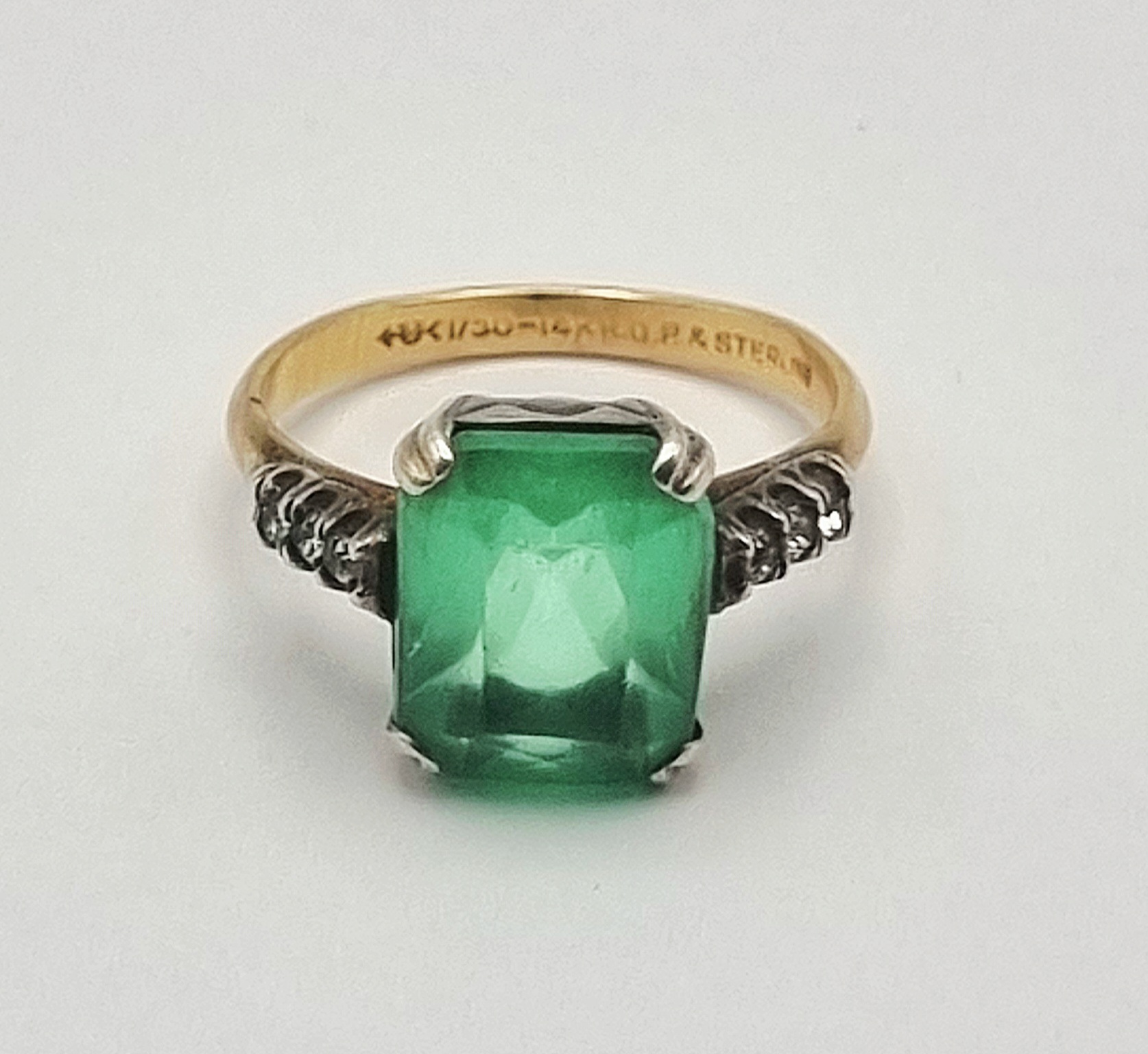 Art Deco ring, circa 1920–1935, met een tweekleurige constructie van 14 karaat Gold-Filled (G.F.) band en Sterling zilveren zetting. De ring bevat een grote rechthoekig geslepen groene toermalijn, met aan de schouders zes kleine diamanten. De ring is aan de binnenzijde gemerkt met de inscriptie "1/30-14K G.F. & STERLING". Ontdek deze ring en voeg het toe aan jouw collectie! Registreer nu voor de veiling. |
