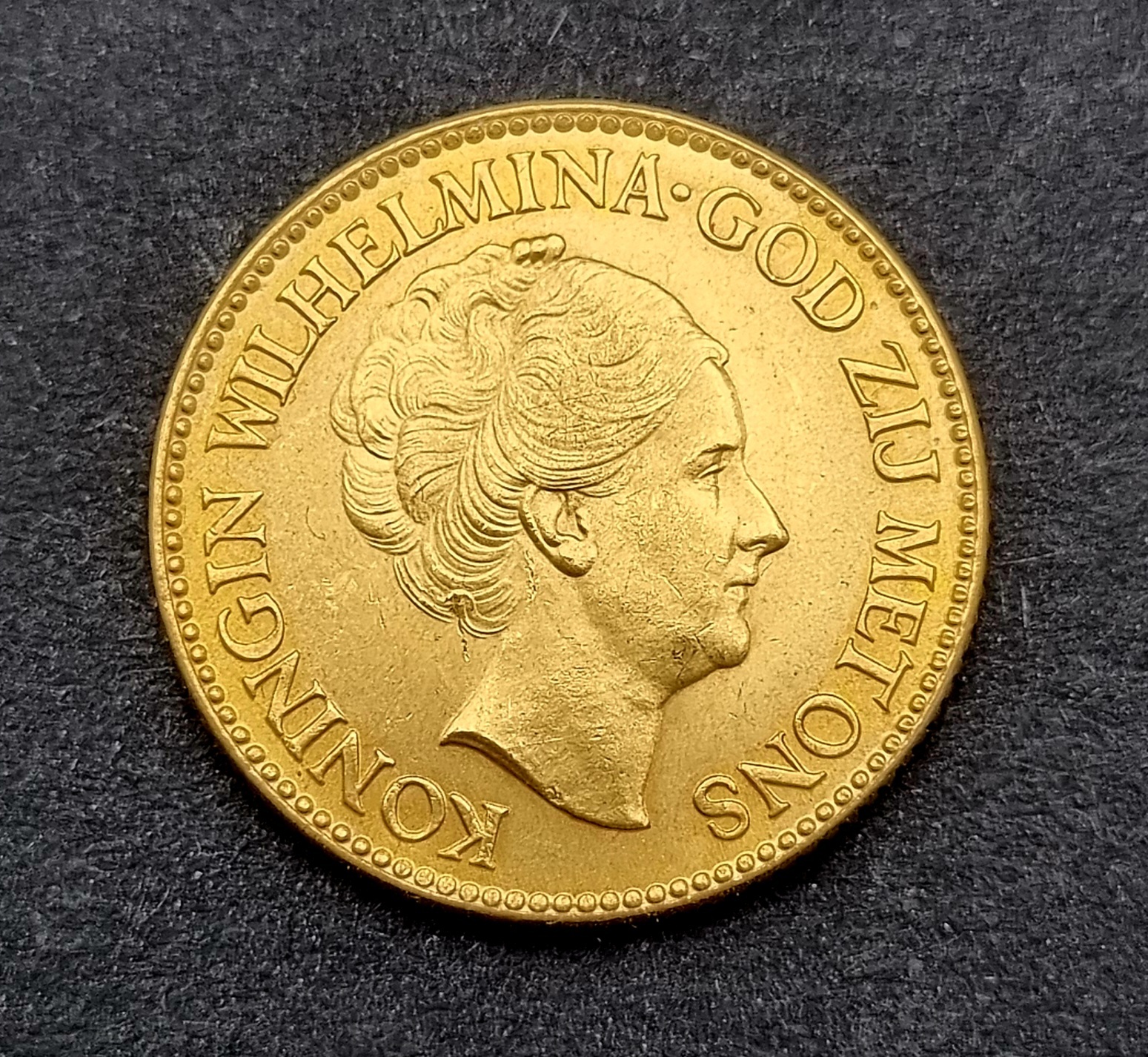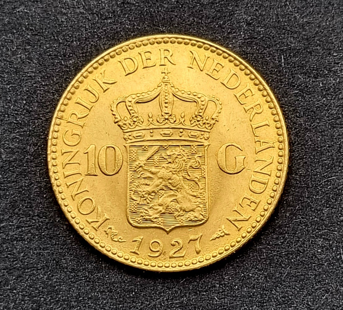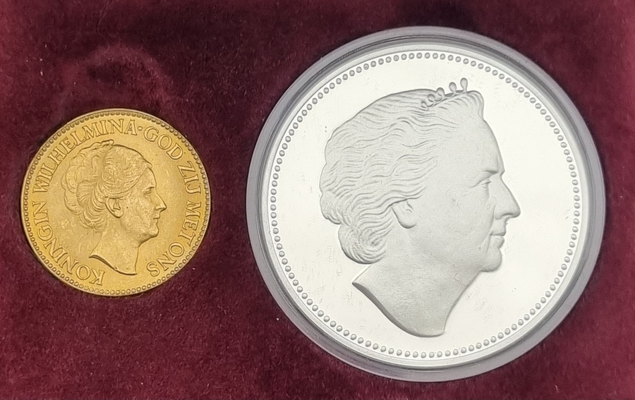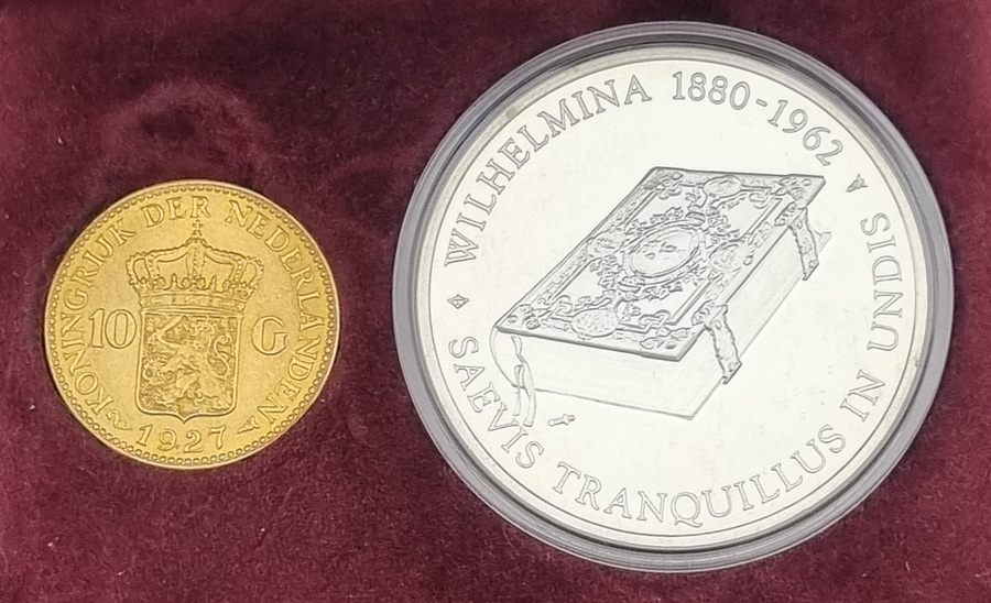 Set bestaande uit een gouden tientje van Koningin Wilhelmina 1927 en een zilveren penning “Het laatste goud van Wilhelmina”, vervaardigd door de Rijksmunt te Utrecht. Geslagen in goud 900/1000 (diameter 22,5 mm) en zilver 925/1000 (diameter 38 mm). Neoklassieke stijl, portret en wapen in reliëf, gemonteerd in originele cassette met certificaat van echtheid, Nederland, 20e eeuw. Geïnteresseerd? Bezoek onze kijkdagen op 28, 29 of 30 november van 11:00 tot 17:00 uur. |