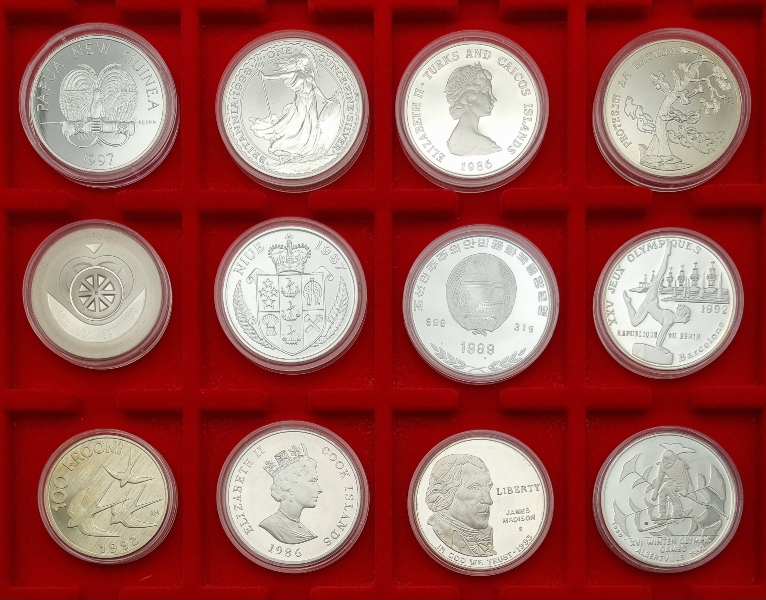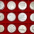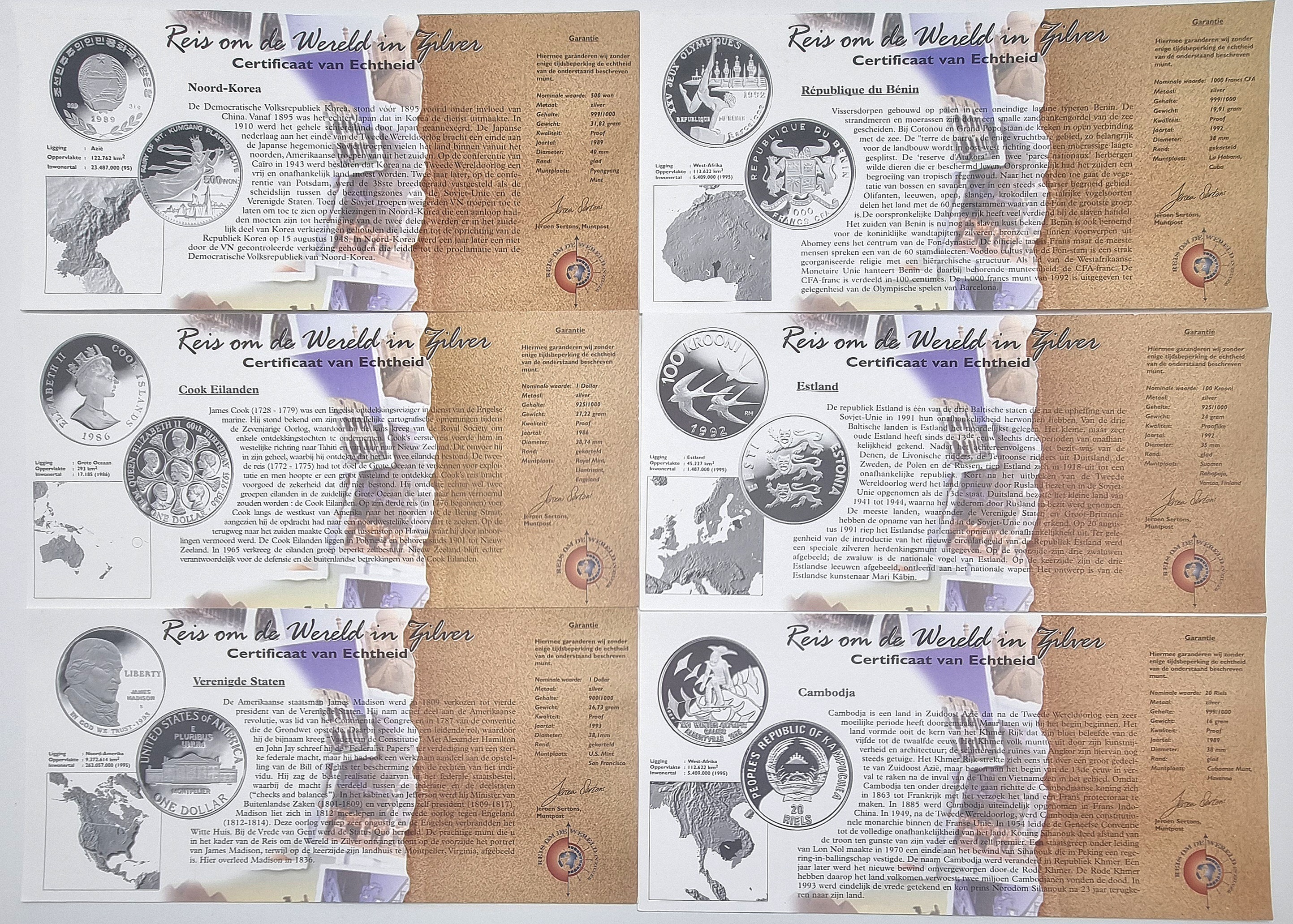 | Afmetingen | Drie munten 999/1000 zilver gewicht 67,73 gram, een munt 958/1000 zilver 32,45 gram, vijf munten 925/1000 zilver 142,44 gram, twee munten 900/1000 zilver gewicht 61,73 gram en een munt 625/1000 zilver gewicht 27 gram. Cassette lengte 30 cm en breedte 24 cm. | |
