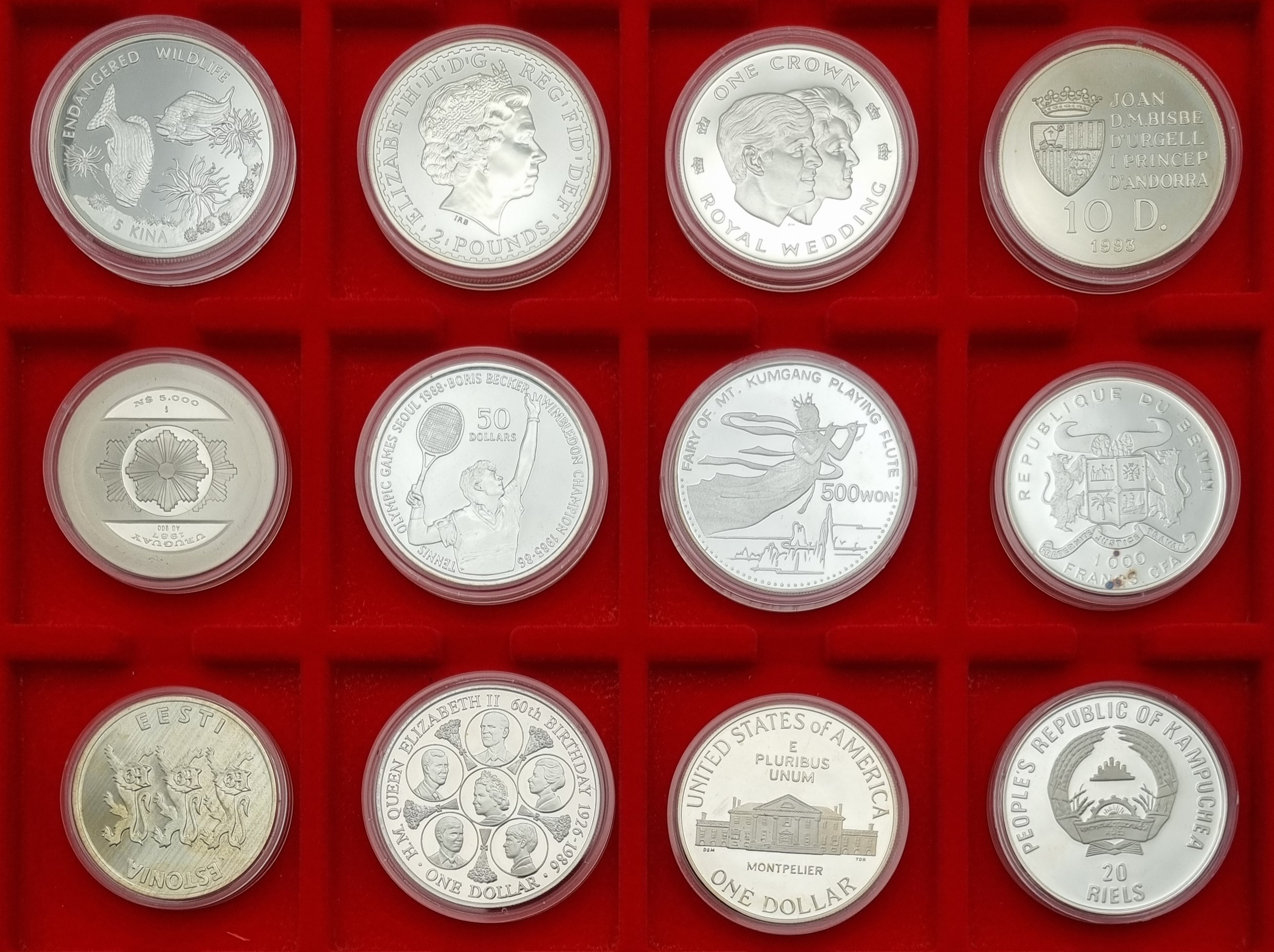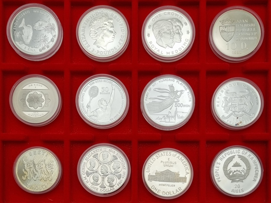 Verzameling van 12 zilveren herdenkingsmunten uit de serie "Reis om de Wereld in Zilver", geslagen in de periode 1986–1997. De proof munten zijn uitgevoerd in zilver en van diverse landen, waaronder Noord-Korea, Cook Eilanden en Estland. De collectie is machinaal geslagen en toont een breed scala aan herdenkingsthema's, van natuur en sport tot koningshuizen en staatsheraldiek. Inclusief certificaten van echtheid. Registreer nu en bied eenvoudig online mee op deze collectie munten! |