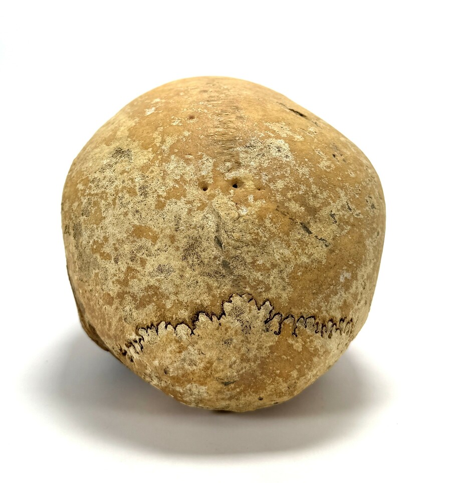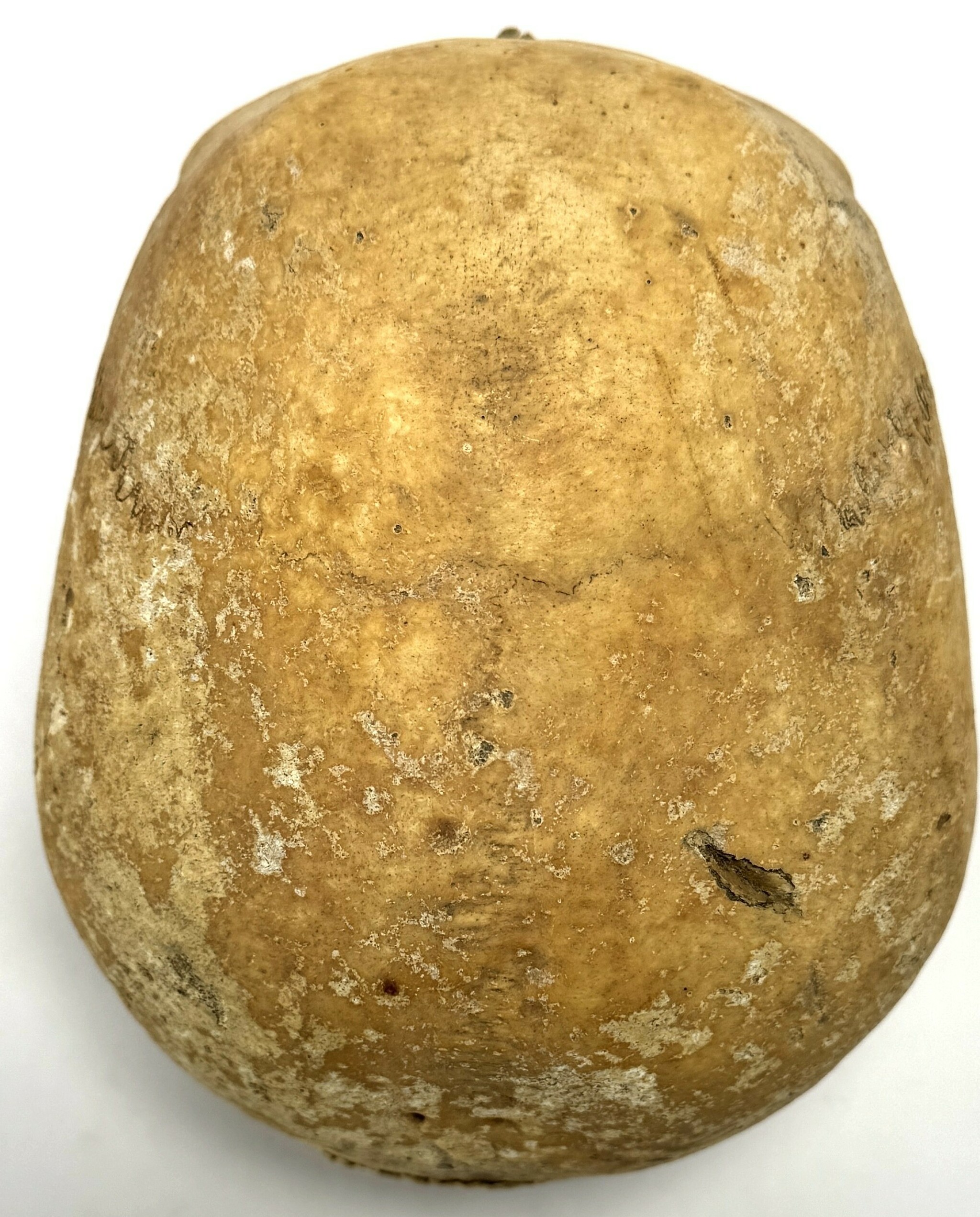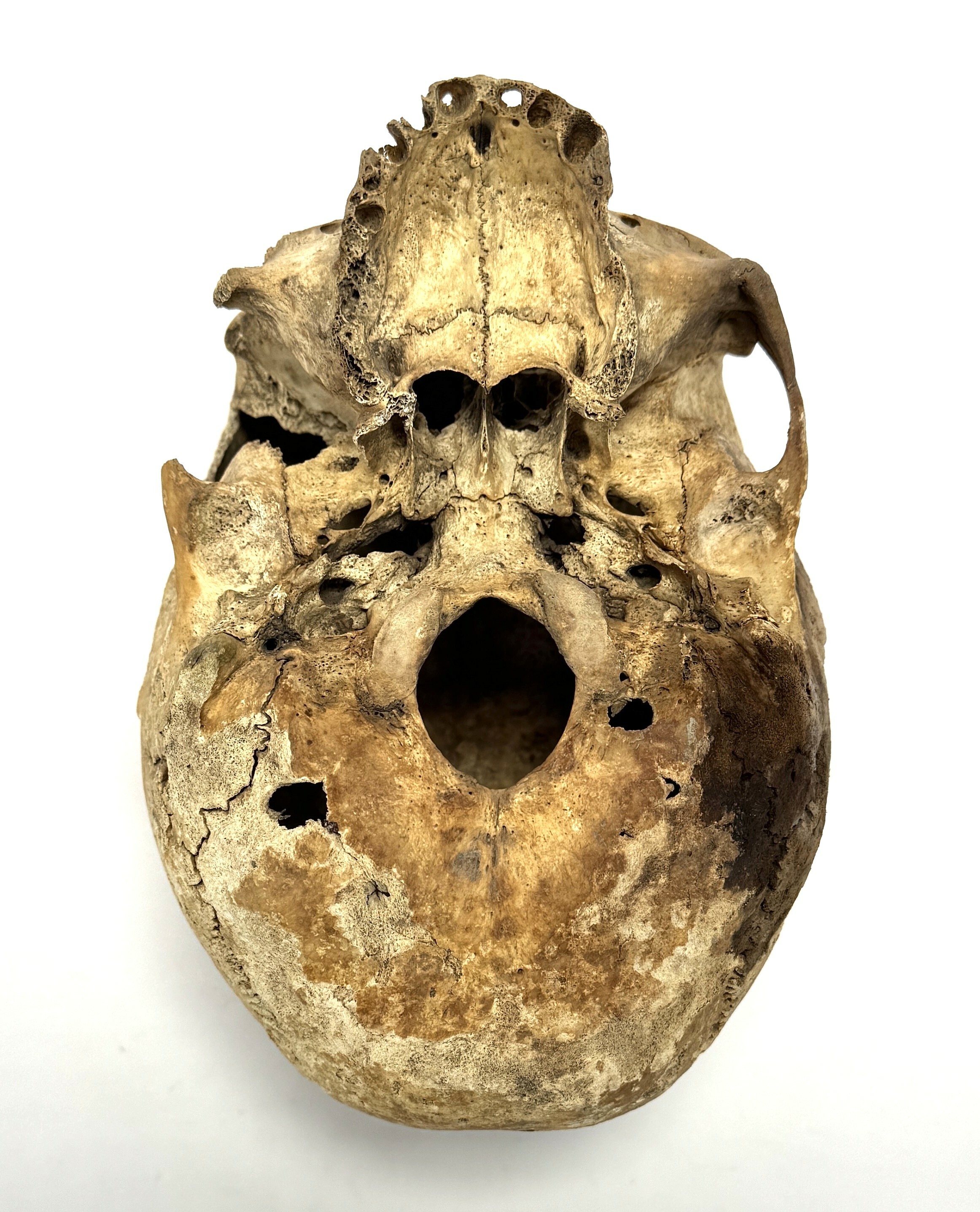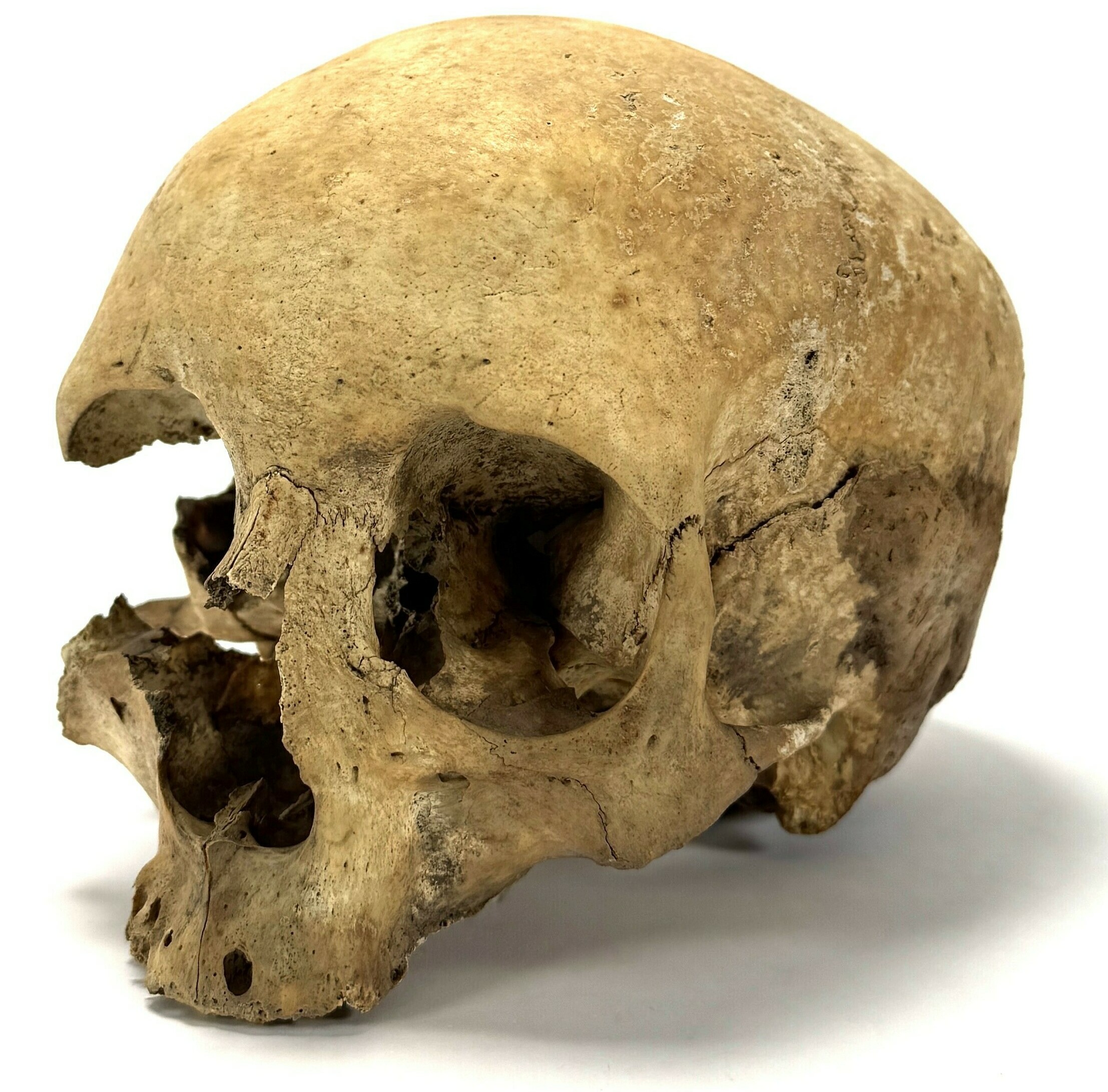 Menselijk schedel uit de 19e eeuw, met duidelijke kenmerken van veroudering en verwering. Dit historische object, waarschijnlijk afkomstig uit een archeologische context, is een fragment van een cranium zonder onderkaak. De schedel vertoont post mortem beschadigingen, waaronder een groot gat aan de zijkant. Kom langs tijdens de kijkdagen (28 t/m 30 november) en ontdek dit object zelf! |