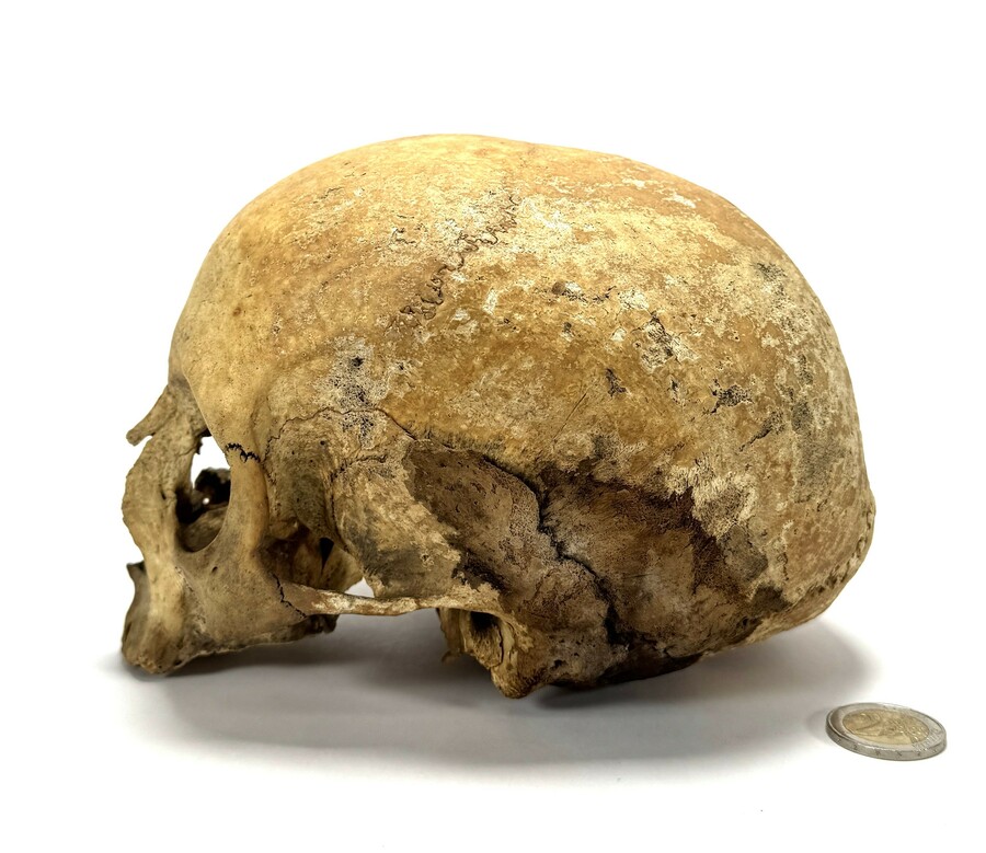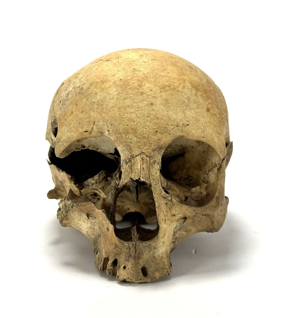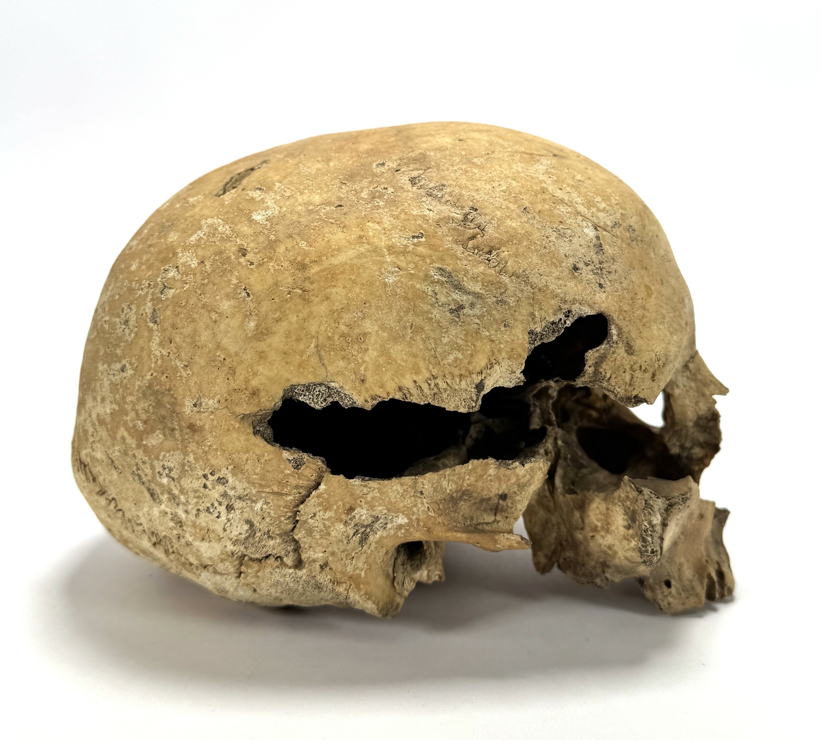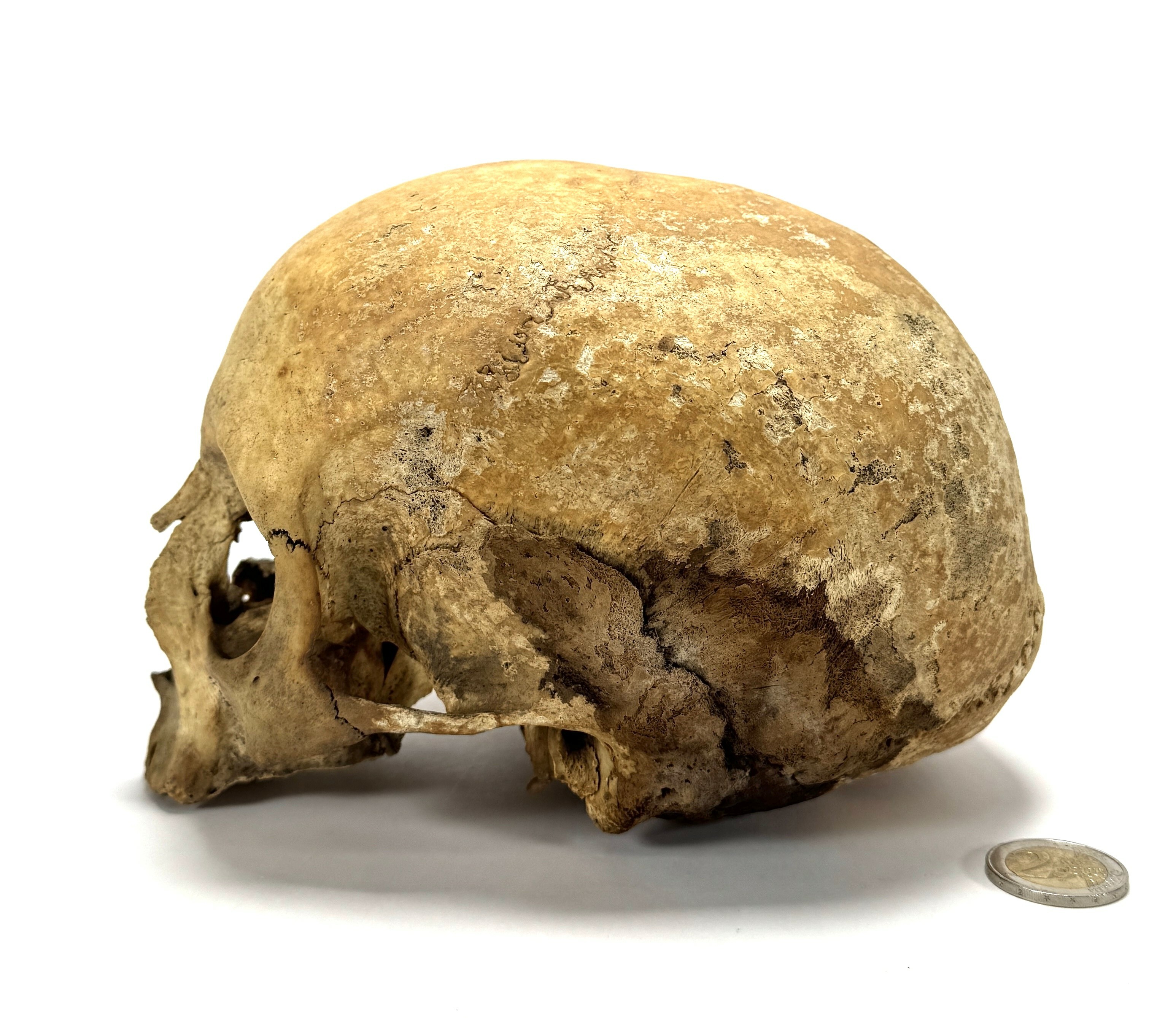 Menselijk schedel uit de 19e eeuw, met duidelijke kenmerken van veroudering en verwering. Dit historische object, waarschijnlijk afkomstig uit een archeologische context, is een fragment van een cranium zonder onderkaak. De schedel vertoont post mortem beschadigingen, waaronder een groot gat aan de zijkant. Kom langs tijdens de kijkdagen (28 t/m 30 november) en ontdek dit object zelf! |