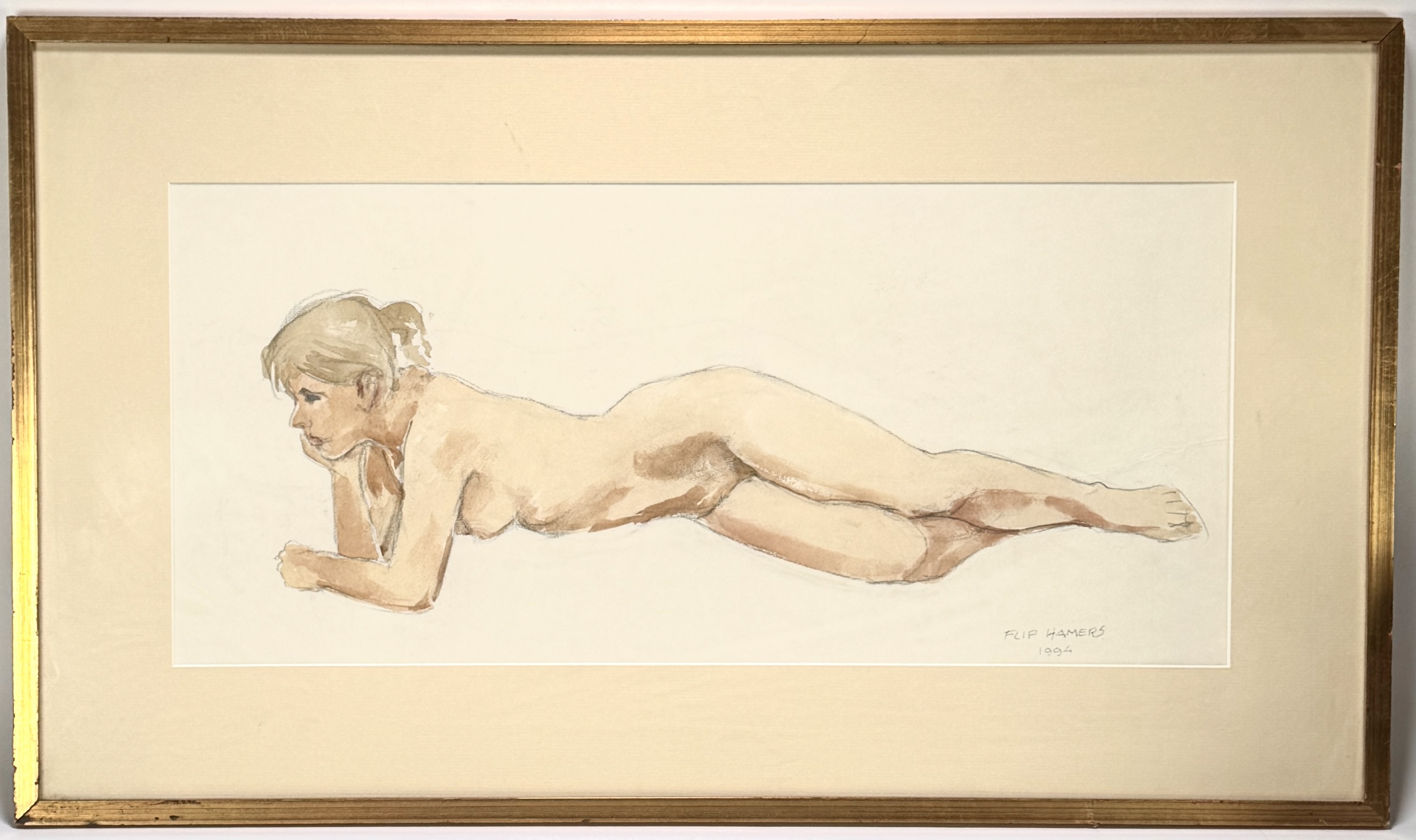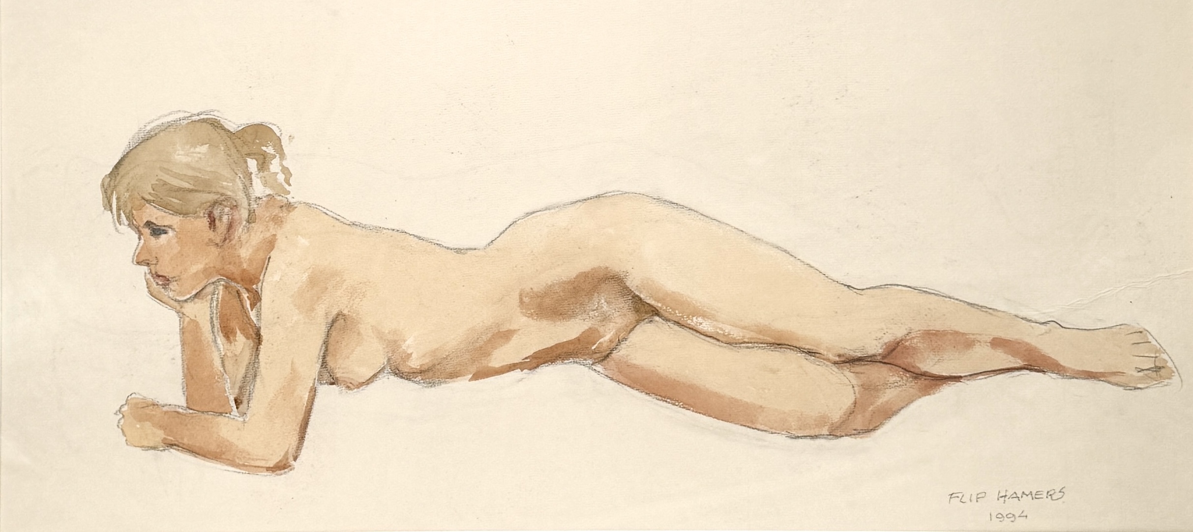 Aquarel, Flip Hamers – liggend vrouwelijk naakt, 1994