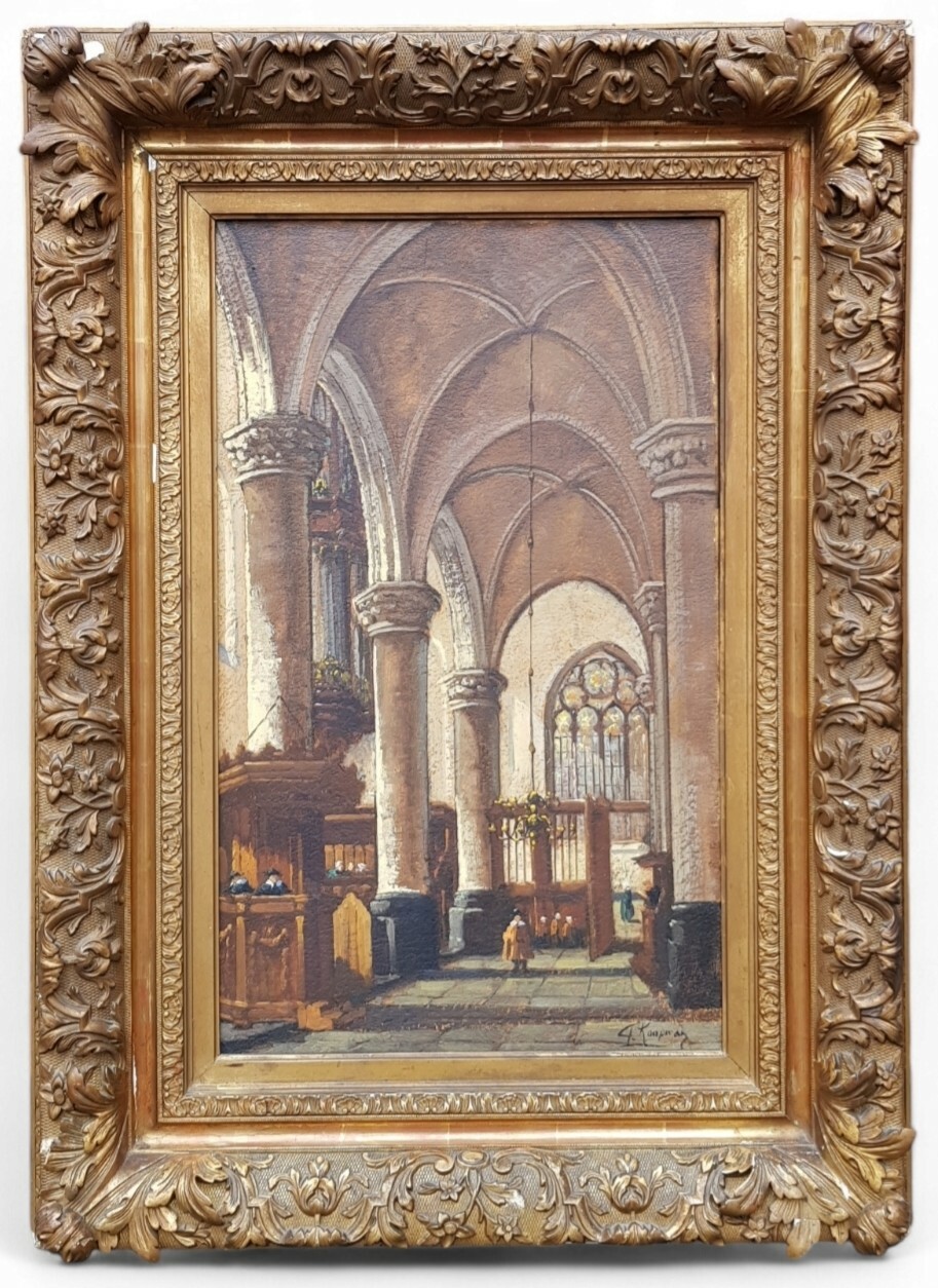 Schilderij op doek door G. Koopman, in de Romantisch Realistische stijl, circa 1900–1930, Nederlandse School. Interieur van de Nieuwe Kerk te Delft met zicht op het koor en lichtinval door glas-in-loodramen. Kenmerkend is het clair-obscur lichteffect en de kleine figuren (stoffage). Het schilderij is rechtsonder gesigneerd en bevindt zich in een rijk geornamenteerde goudkleurige lijst. Klaar om te bieden? Registreer je nu en doe mee aan de veiling! |