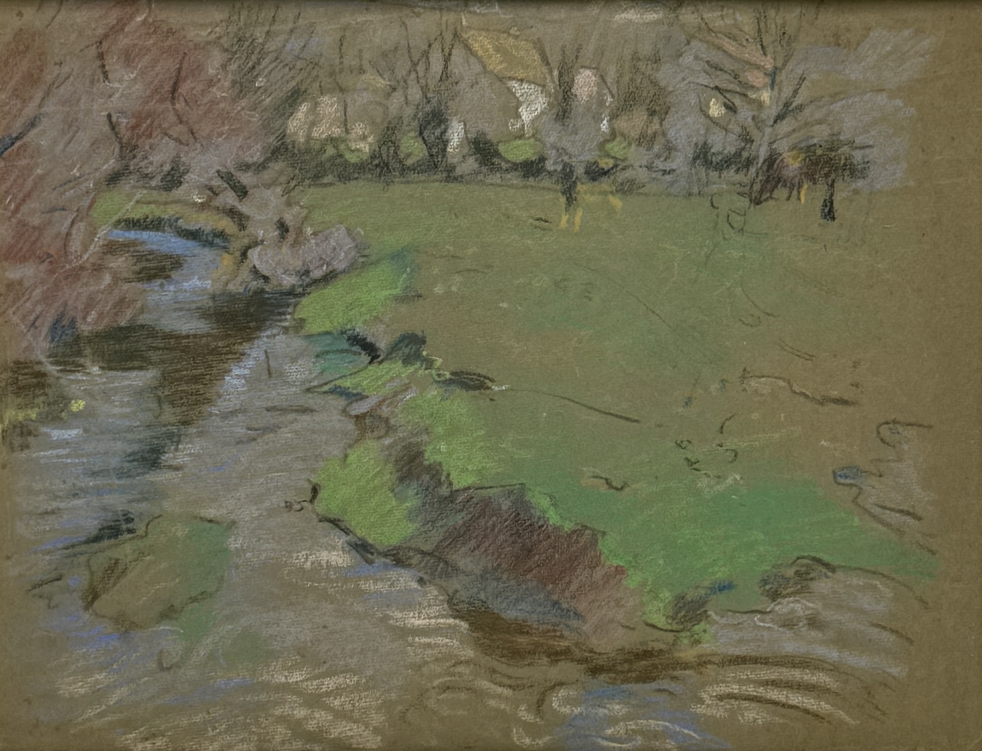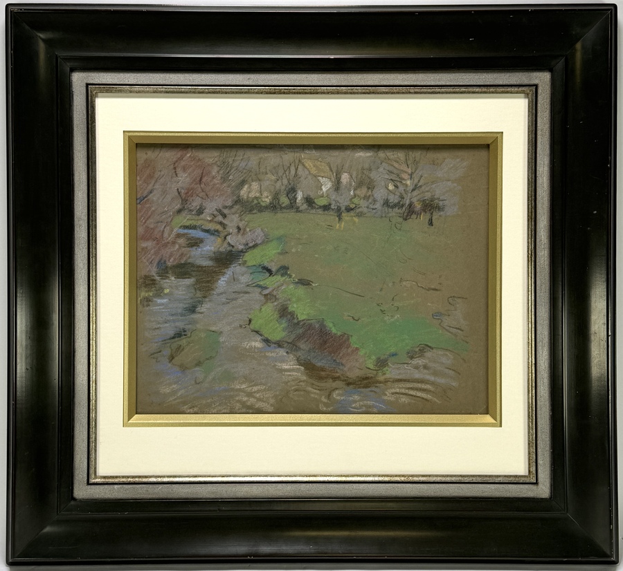 Pasteltekening, impressionistische stijl – landschap met beek en bomen, begin 20e eeuw