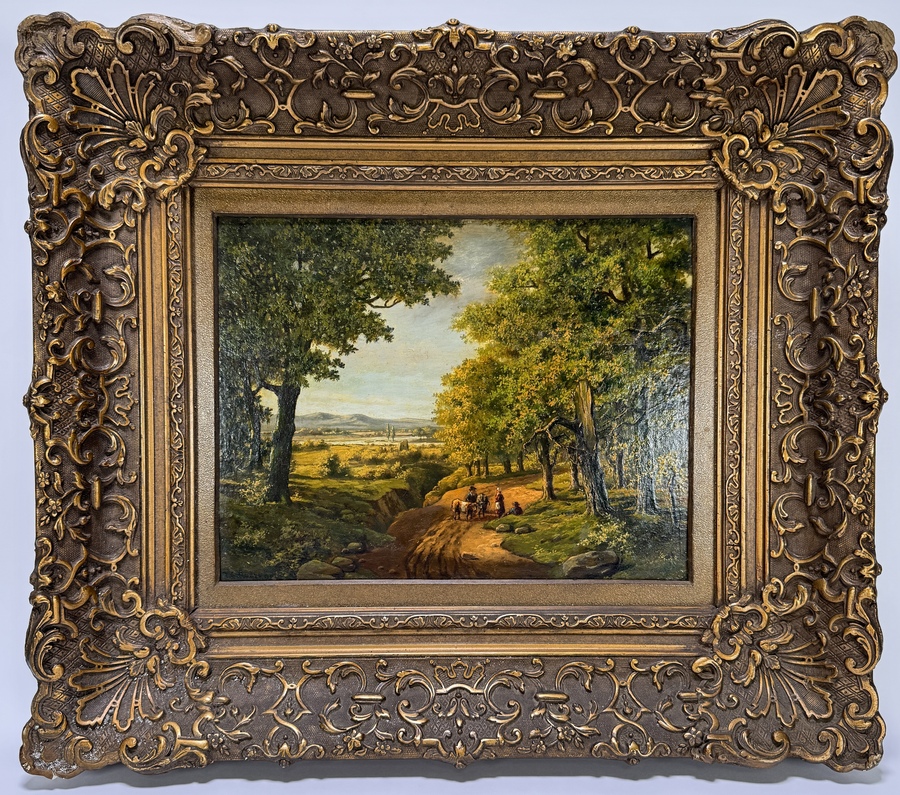 Olieverfschilderij op paneel, naar Barend Cornelis Koekkoek, tweede helft 19e eeuw. Het romantische landschap toont een zandweg met groep reizigers, paarden en een wagen, omgeven door hoge bomen en een vergezicht naar een vallei met heuvels. Het werk is uitgevoerd in warme groen- en aardetinten en geplaatst in een rijk gedecoreerde goudkleurige lijst. Linksonder gesigneerd BC Koekkoek. Geïnteresseerd? Bezoek onze kijkdagen op 28, 29 of 30 november van 11:00 tot 17:00 uur! |