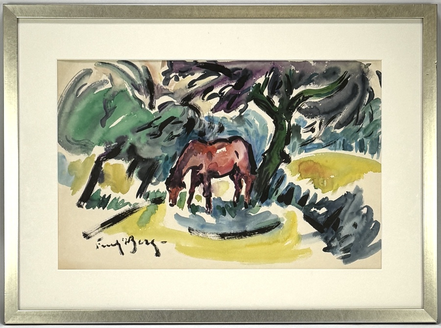 Aquarel van Freek van den Berg (1918–2000), uitgevoerd in expressieve stijl, ca. midden 20e eeuw. Het werk toont een paard grazend onder een boom, weergegeven in krachtige penseelstreken met levendig kleurgebruik in groen, blauw, paars en bruin. De aquarel is uitgevoerd op papier, linksonder gesigneerd, en bevindt zich in een goudkleurige lijst met passe-partout.