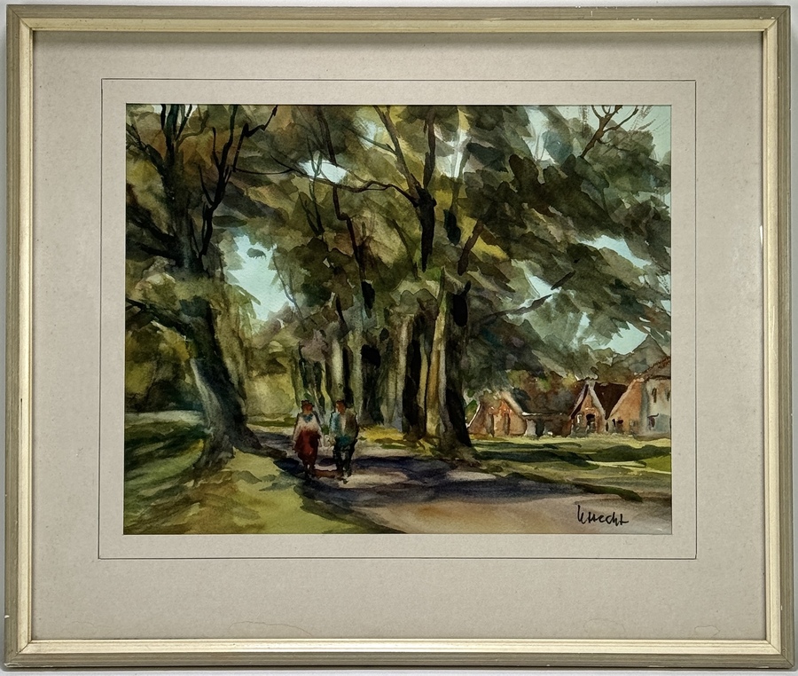 Aquarel op papier, gesigneerd Knecht, getiteld “Emden, Am Wall” op de achterzijde. De voorstelling toont een boomrijke laan met twee wandelaars en dorpshuizen op de achtergrond, uitgevoerd in naturalistisch-impressionistische stijl met transparant kleurgebruik. De aquarel dateert uit de eerste helft van de 20e eeuw en is van Noord-Duitse herkomst. Het werk bevindt zich in een goudkleurige lijst. Geïnteresseerd? Bezoek onze kijkdagen op 28, 29 of 30 november van 11:00 tot 17:00 uur! |
