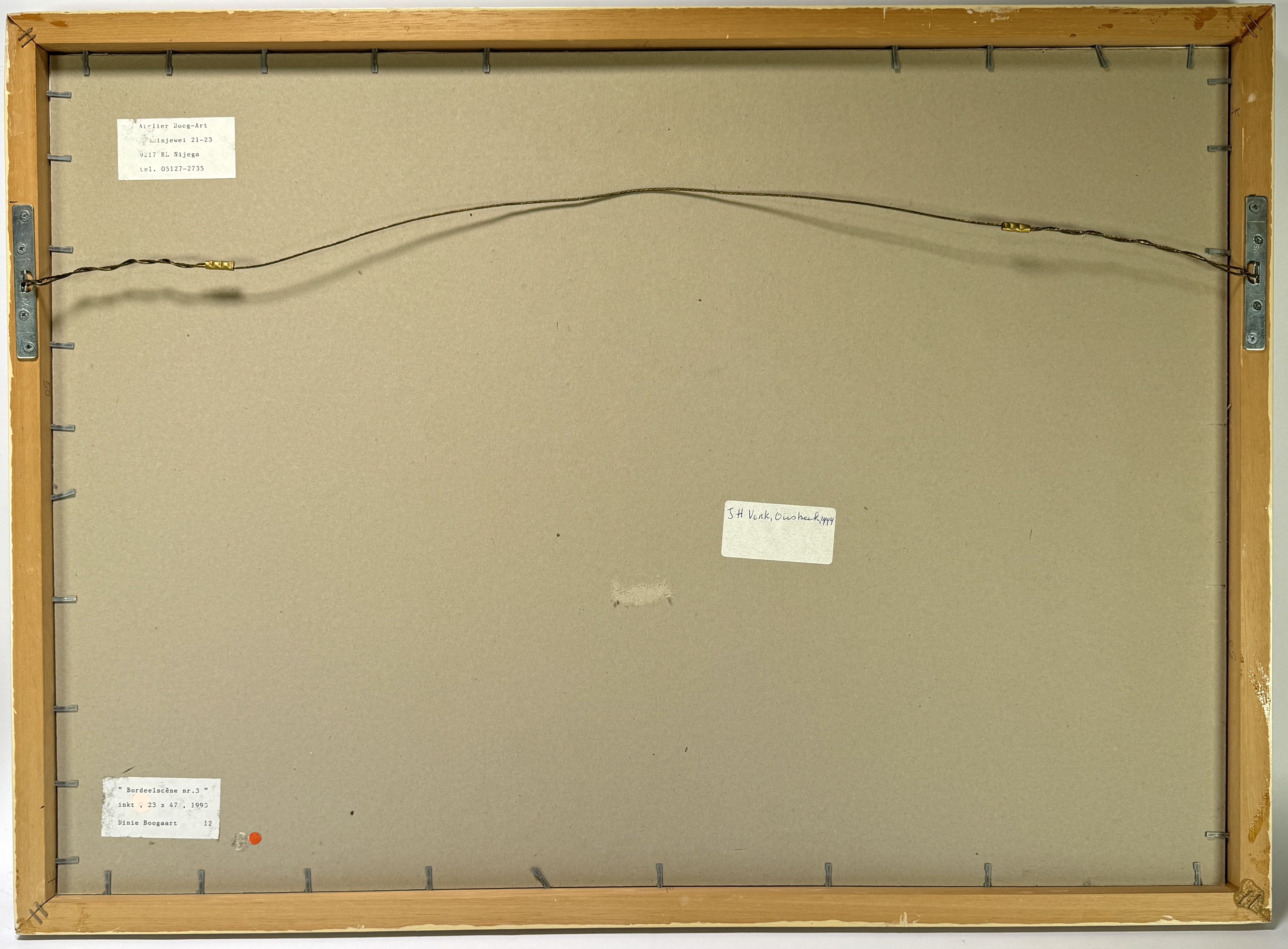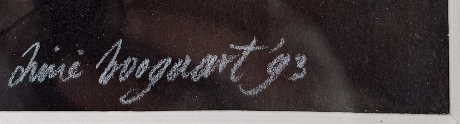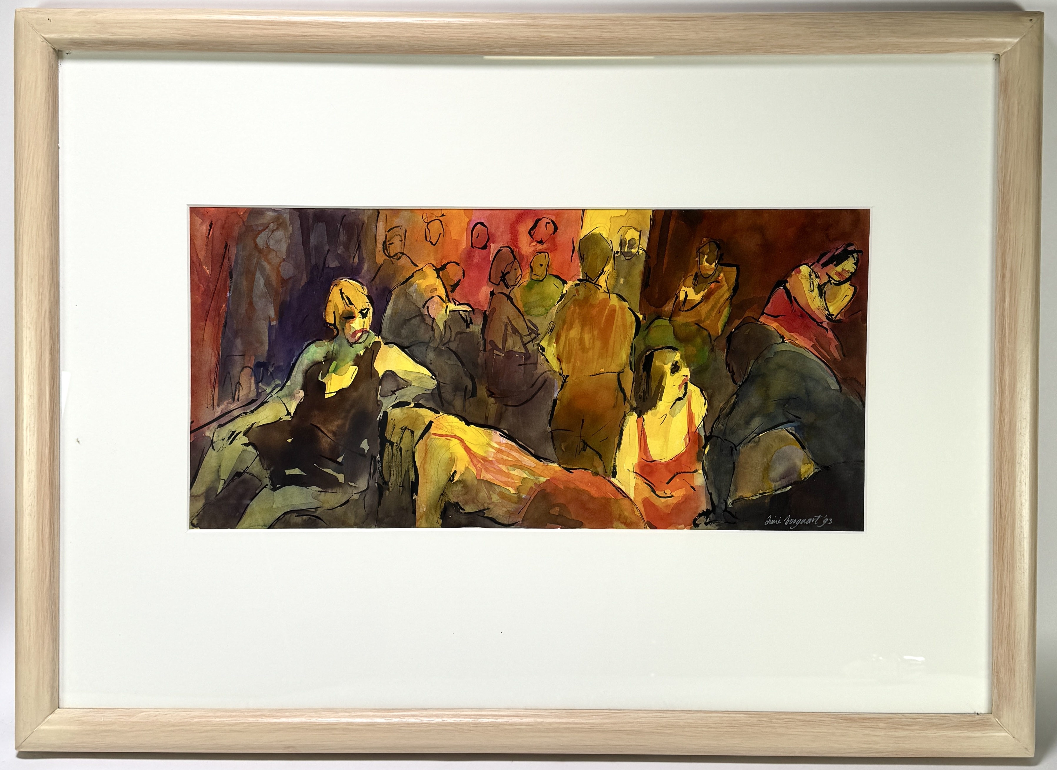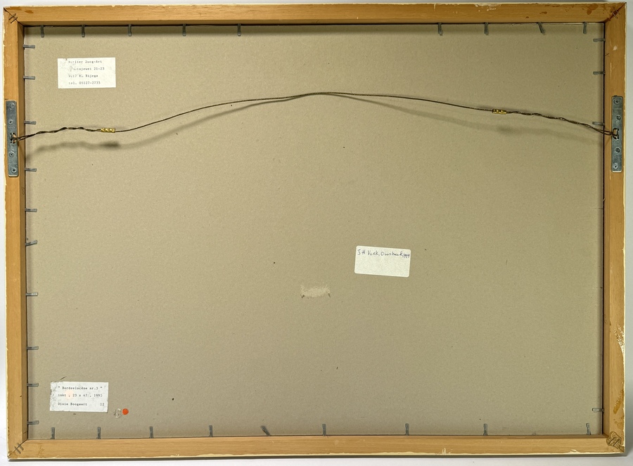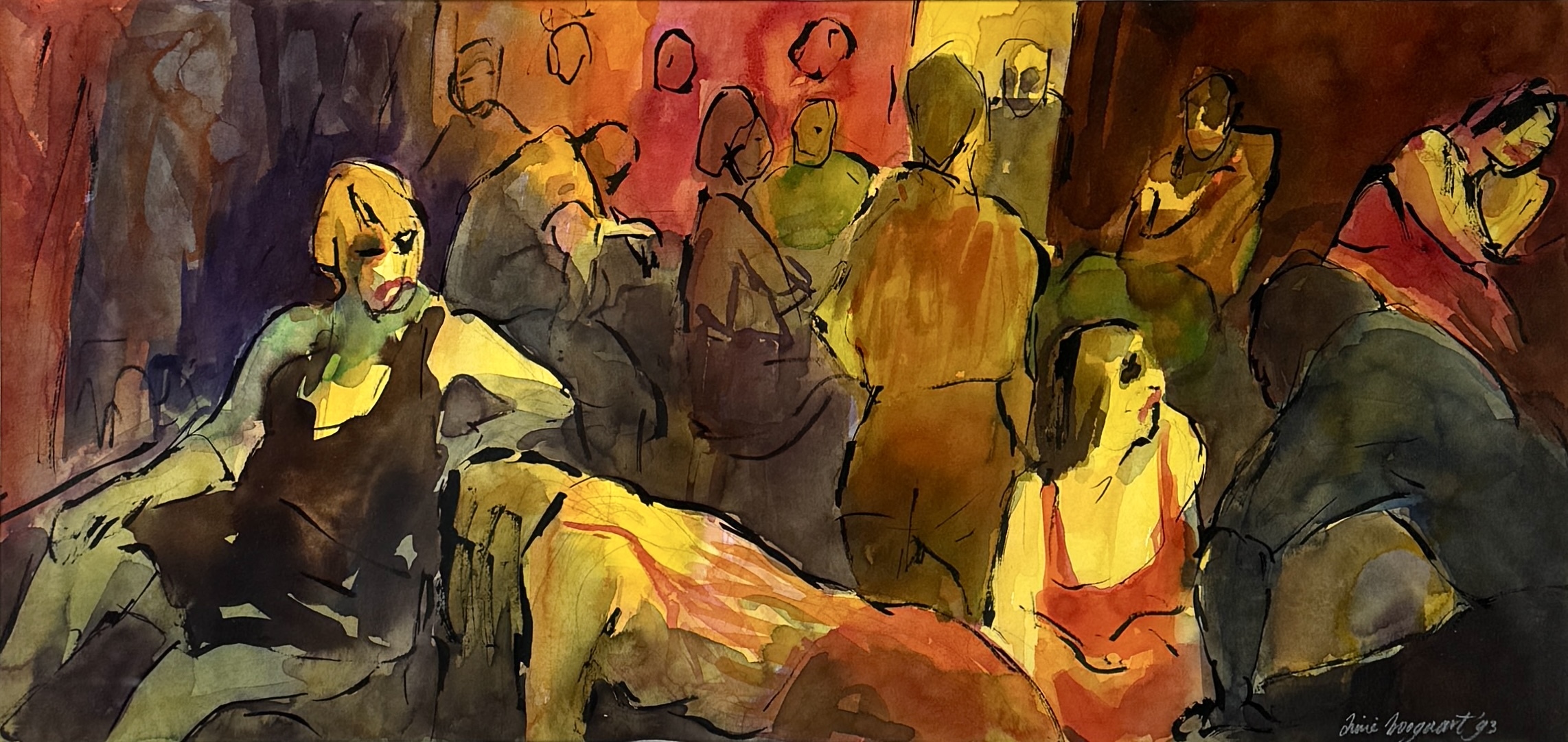 Inkt en aquarel op papier door Dinie Boogaart (1963), gesigneerd en gedateerd rechtsonder ’93, getiteld "Bordeelscene nr.3". Het werk toont een expressieve scène met meerdere figuren in losse, krachtige lijnvoering en intens kleurgebruik in rood, geel en groen. Uitgevoerd in expressieve figuratieve stijl en voorzien van een houten lijst met passe-partout. Zeker zijn van deelname? Plaats vanaf 21 november een schriftelijk bod online! |