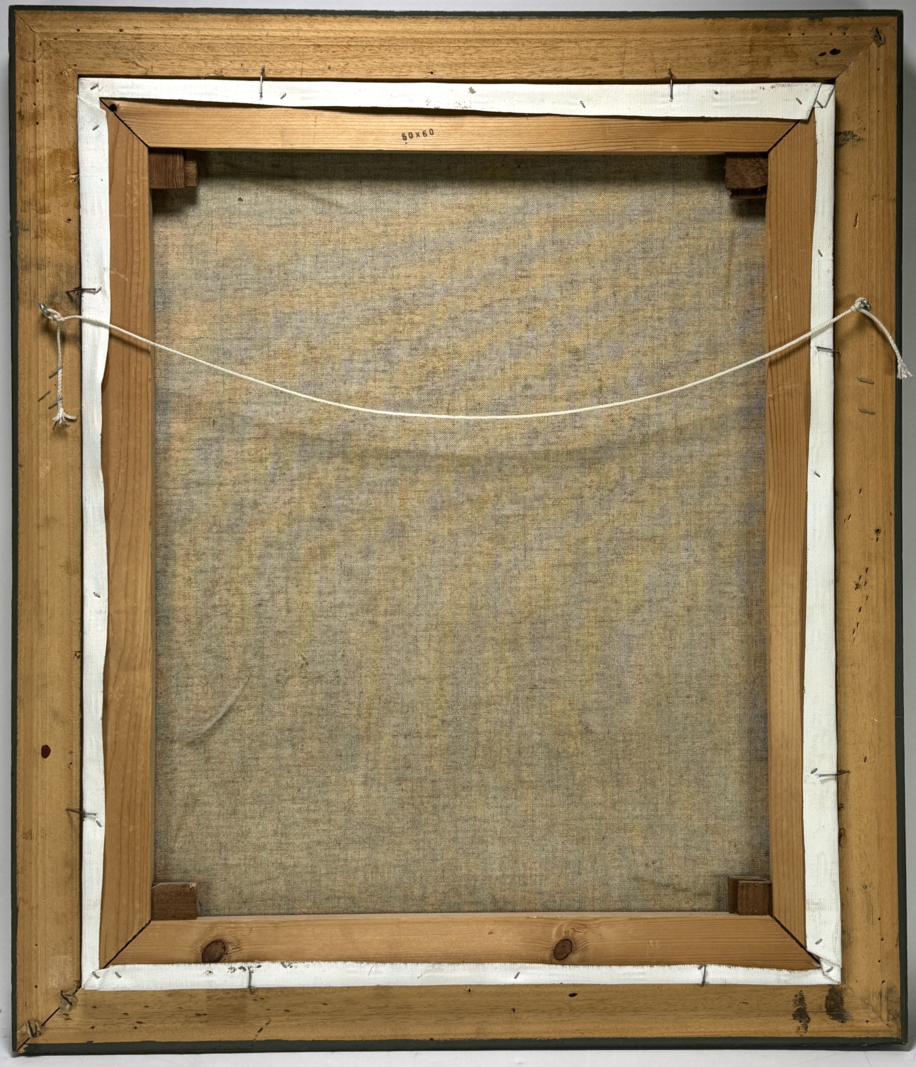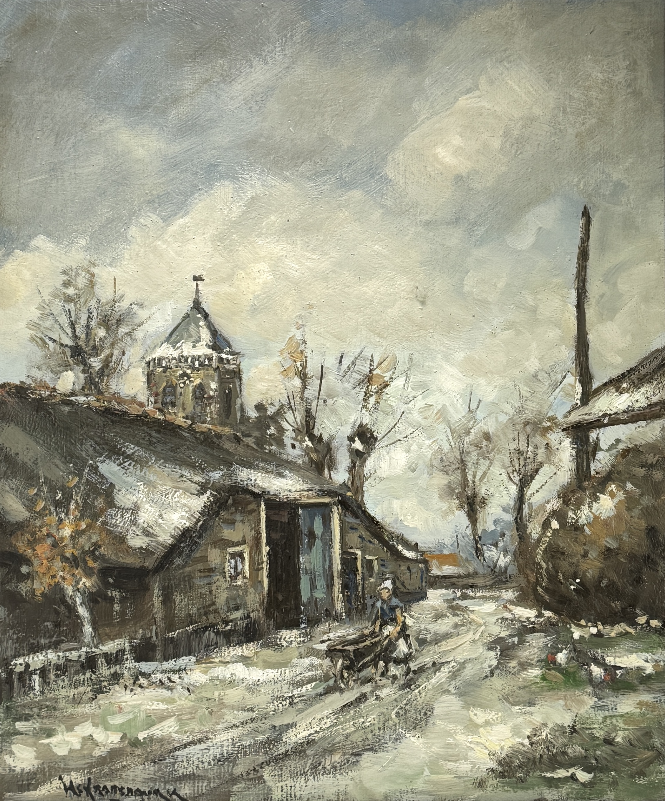 Schilderij, midden 20e eeuw, olieverf op doek, door Hendrik Cornelis Kranenburg (1917-1987). Voorstelling van een winterlandschap met dorpsstraat, kerktoren en figuur met kruiwagen in realistisch-impressionistische stijl. De penseelvoering is levendig met subtiele lichtwerking in grijsblauwe tonen. Linksonder gesigneerd, het werk bevindt zich in een goudkleurige lijst. Geïnteresseerd? Bezoek onze kijkdagen op 28, 29 of 30 november van 11:00 tot 17:00 uur! |