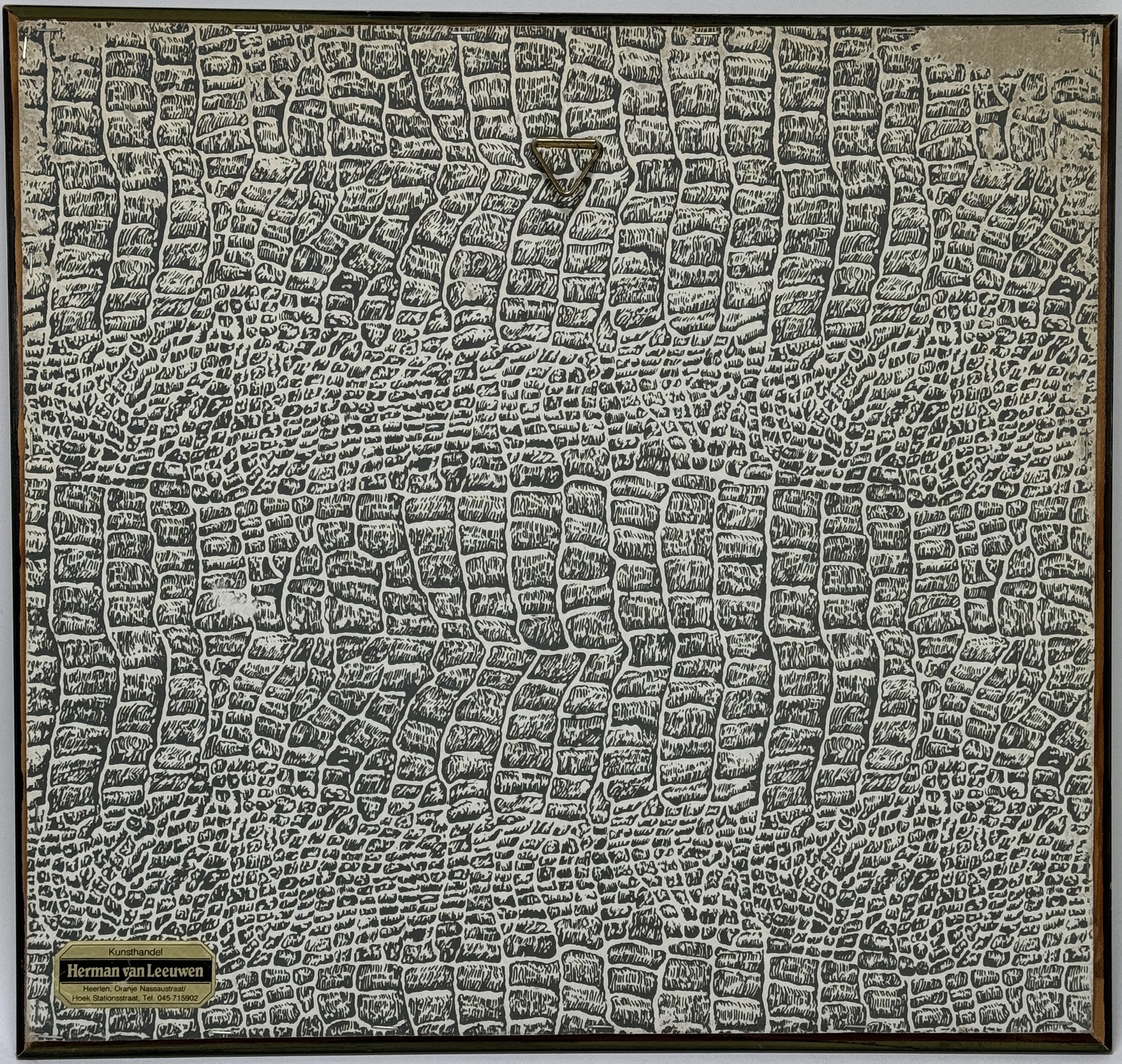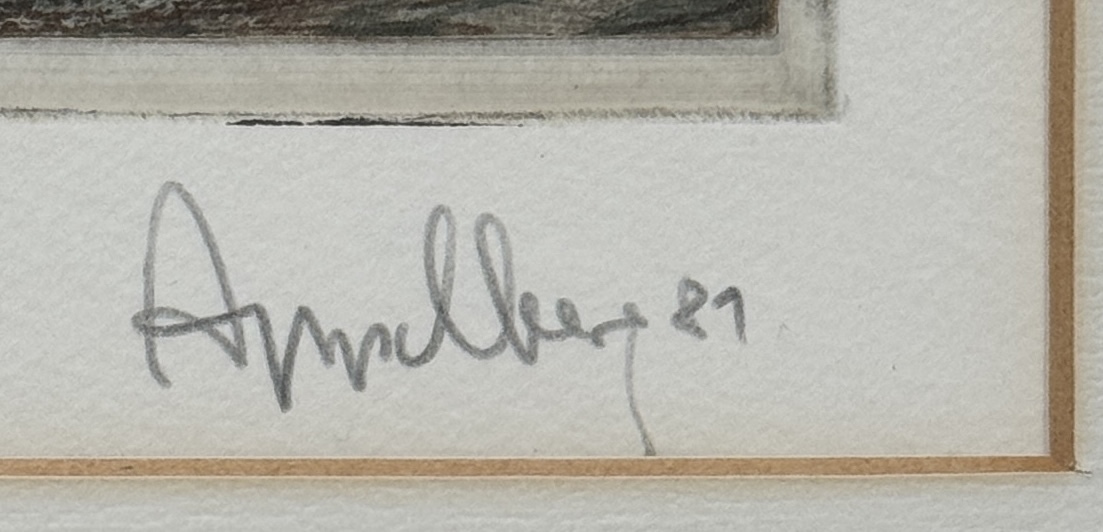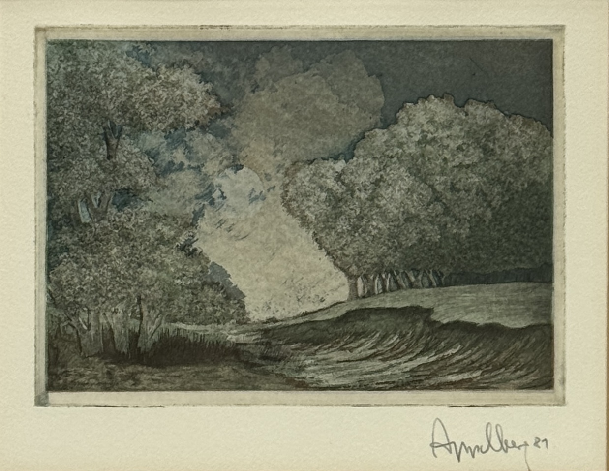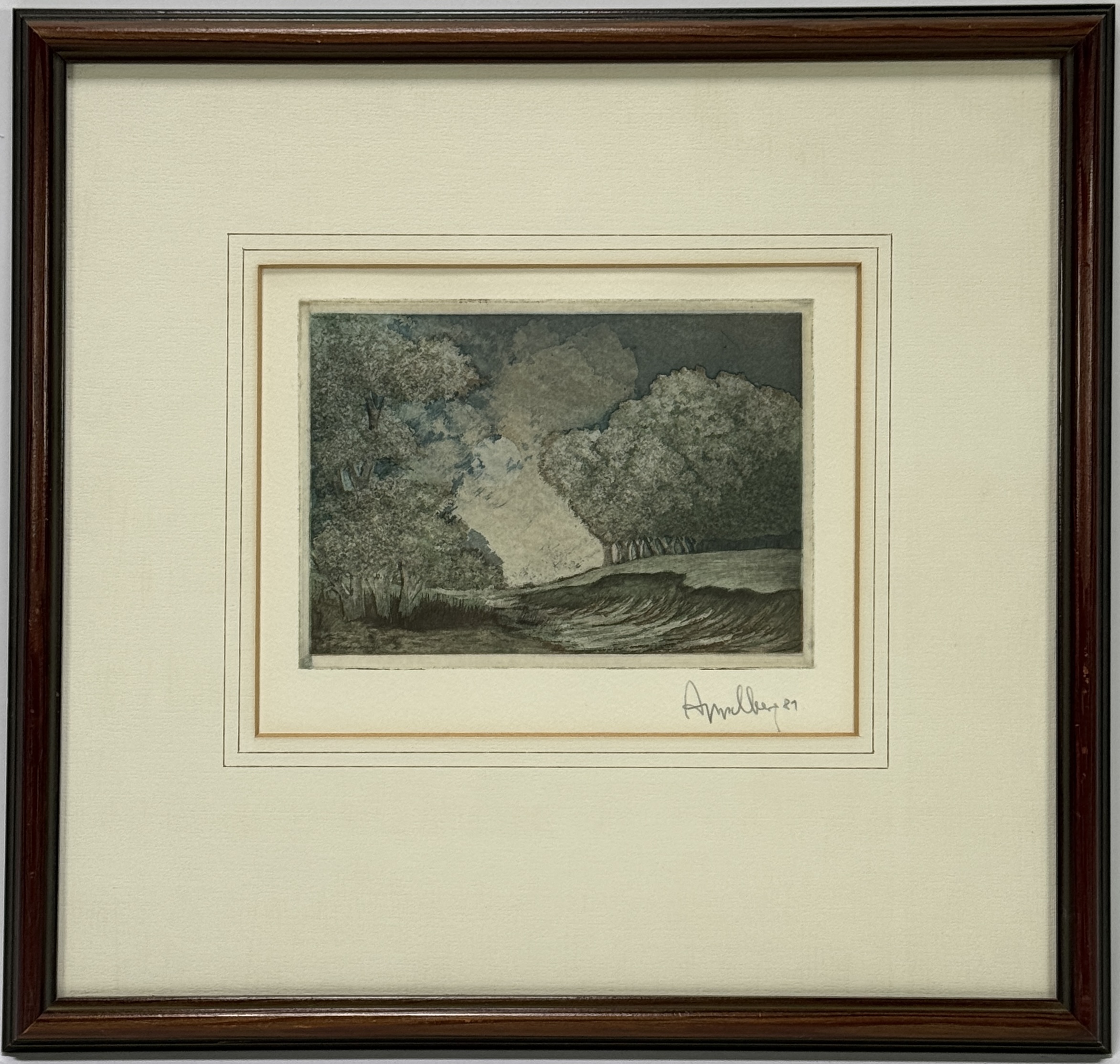 Aquatint op papier, 1981. Landschappelijke voorstelling met bomenrij en open lucht, in grijsgroene en blauwgrijze tinten. Onduidelijk gesigneerd en gedateerd 81, rechtsonder in potlood. Verso label Herman van Leeuwen Kunsthandel. Ingelijst met crèmekleurige passe-partout. Dit werk zelf beoordelen? Je bent welkom op onze kijkdagen op 28, 29 en 30 november! |