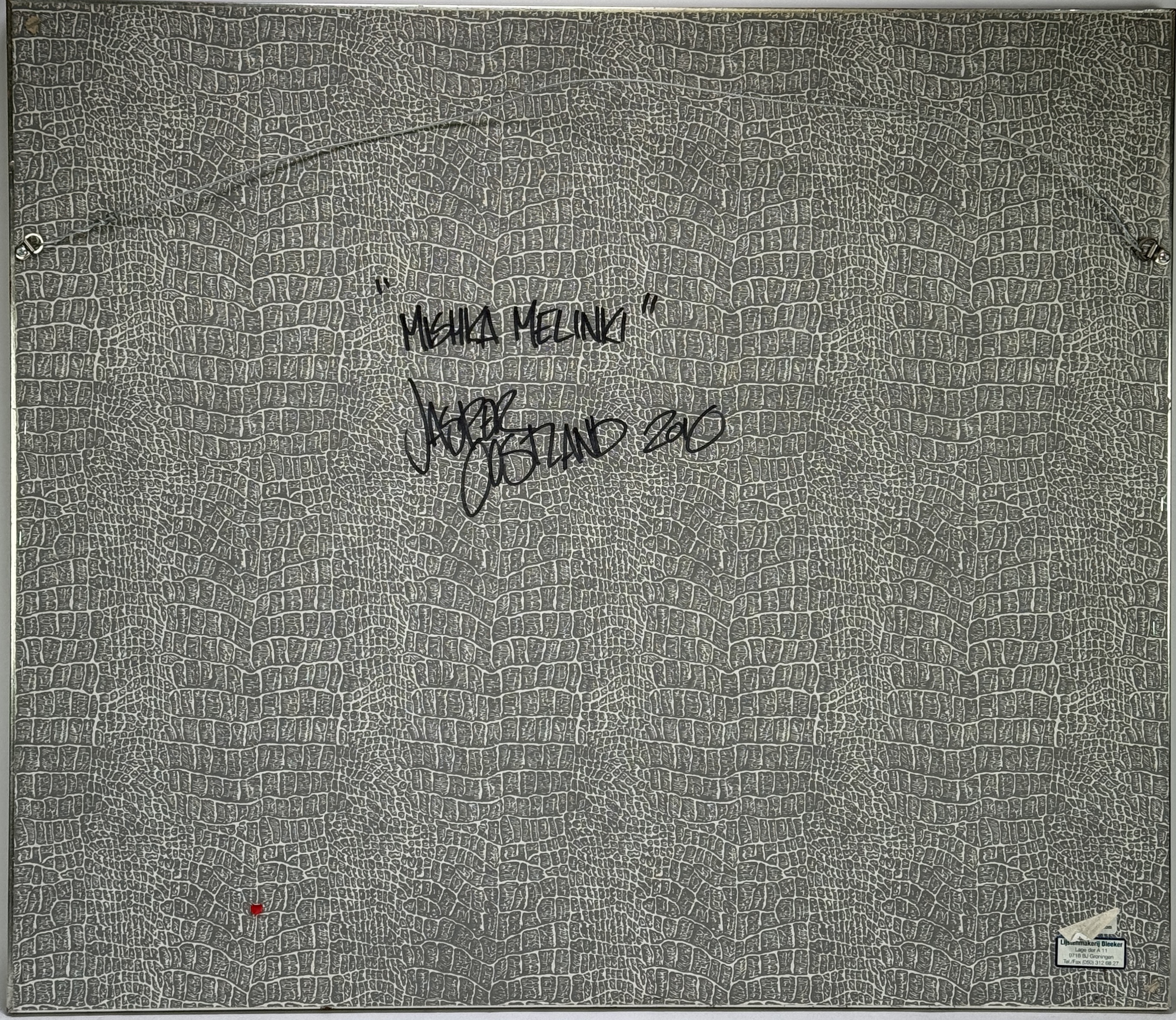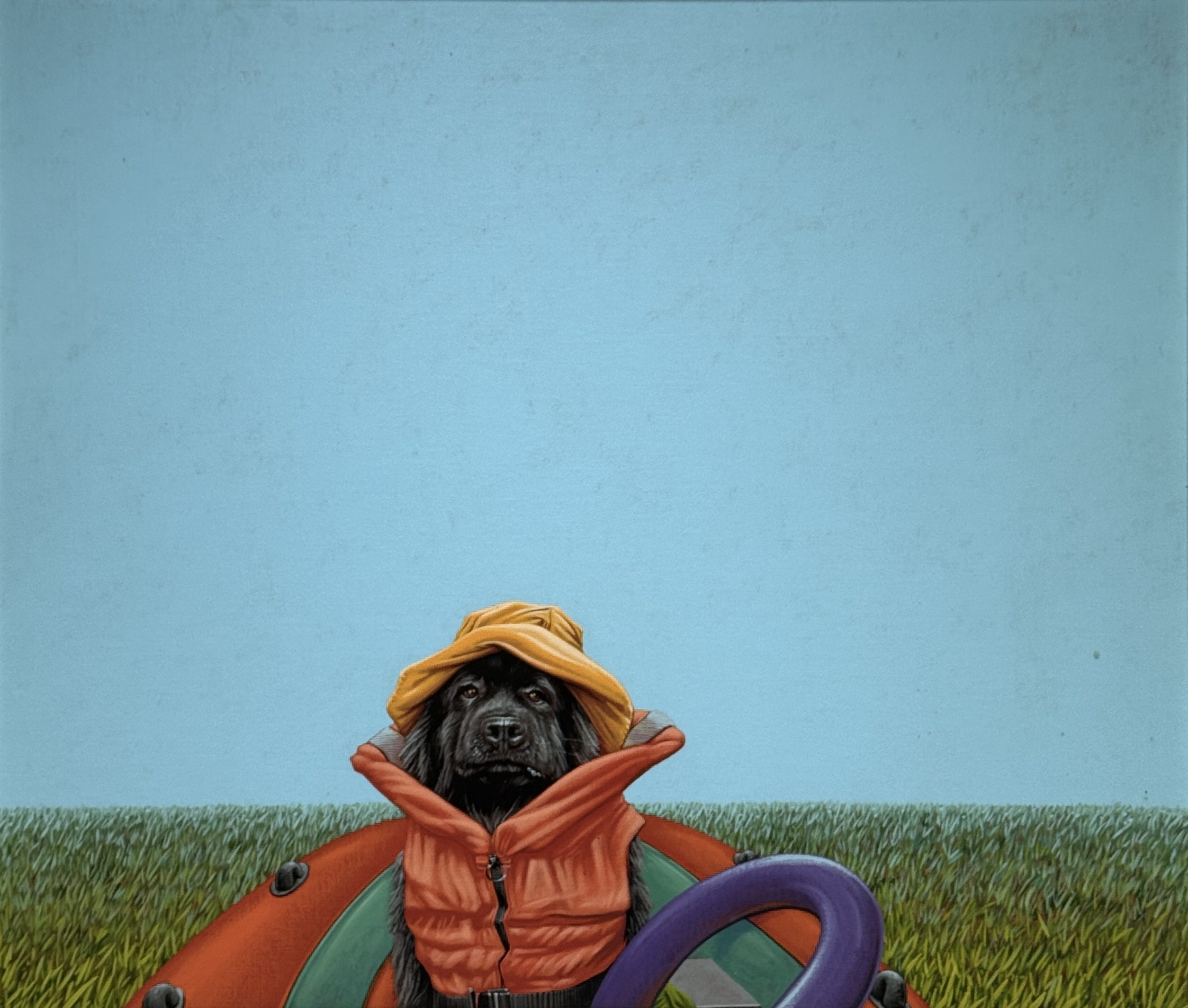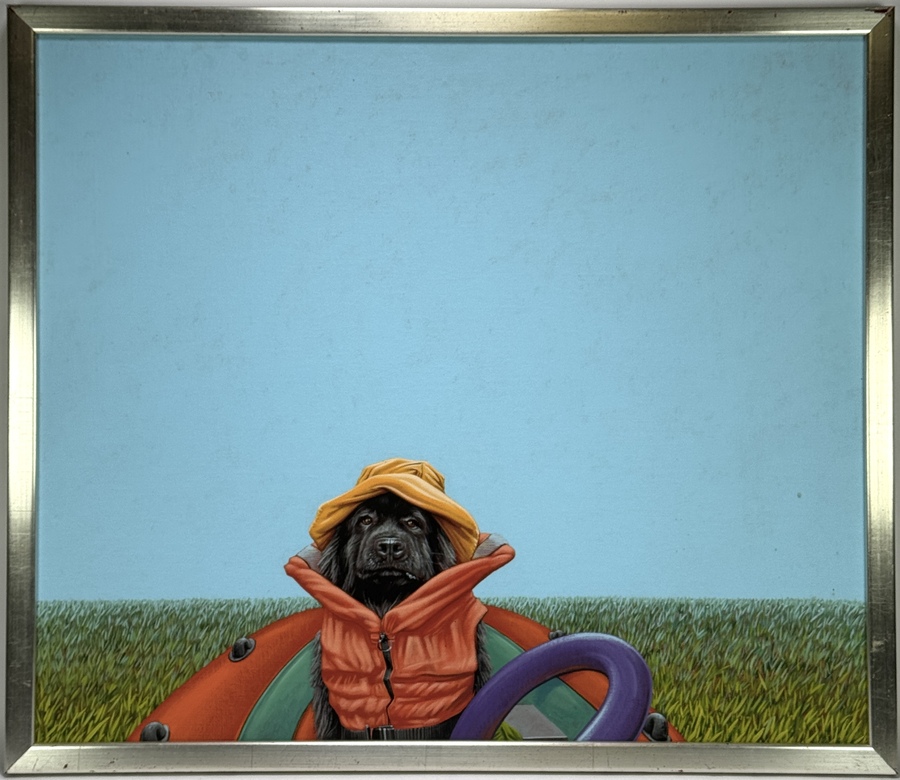 Acrylverf op doek door Jasper Oostland (1976), getiteld “Mishka Melinki” en gedateerd 2015. Het humoristische werk toont een zwarte hond in zwemvest en hoed, geplaatst in een kleurrijke rubberboot met contrasterende achtergronden van strakblauw en groen. Het hyperrealistische schilderij bevindt zich in een metalen lijst, vers titel en gesigneerd. Klaar om te bieden? Registreer je nu en doe mee aan de veiling! |