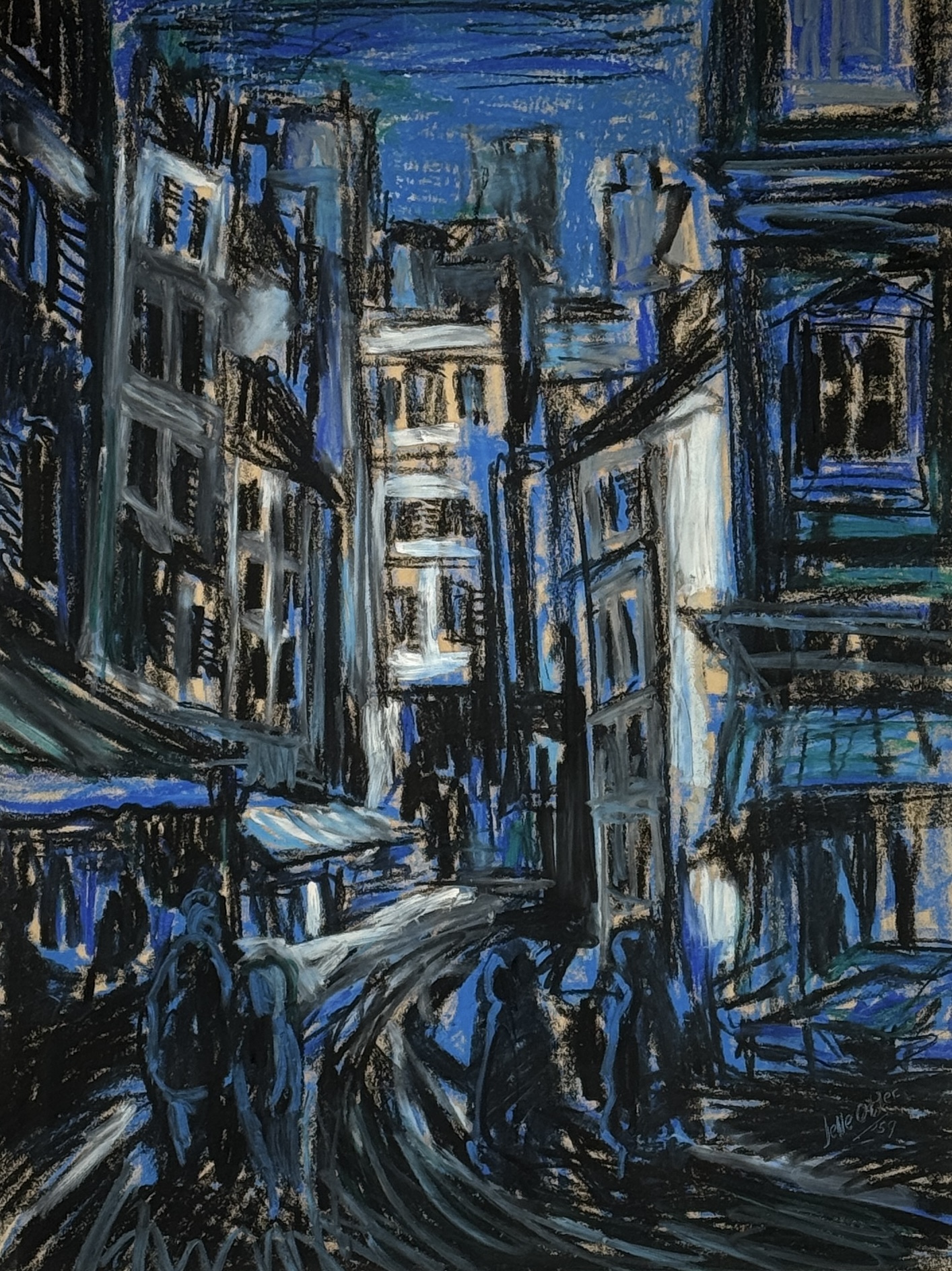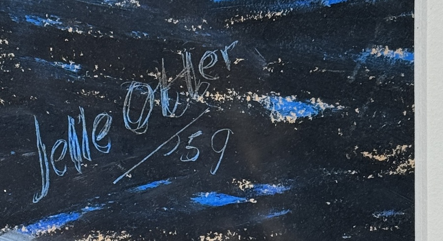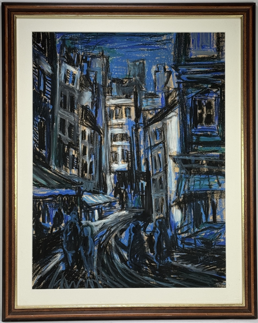 Expressionistische gemengde techniek met pastel en krijt op papier door Jelle Otter (1925–2012), van een stadsgezicht, gedateerd 1959. De compositie toont een avondlijke straattafereel met figuren en gevels in krachtig blauw, wit en zwart. Gesigneerd rechtsonder en voorzien van een houtkleurige lijst. Geïnteresseerd? Bezoek onze kijkdagen op 28, 29 of 30 november van 11:00 tot 17:00 uur! |